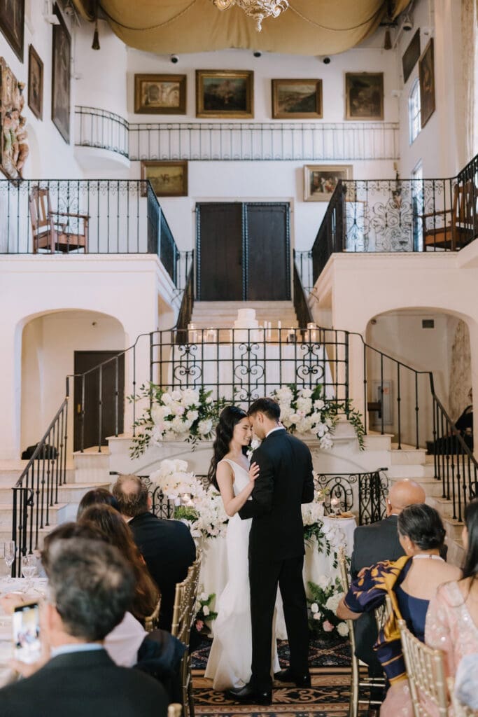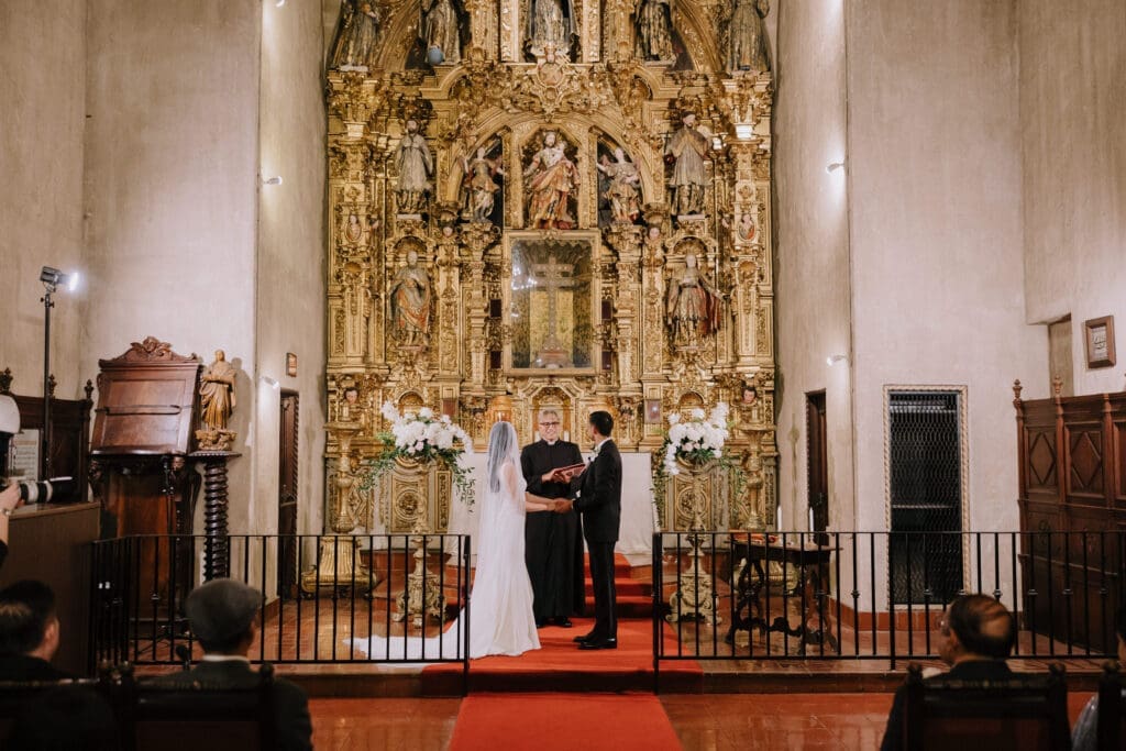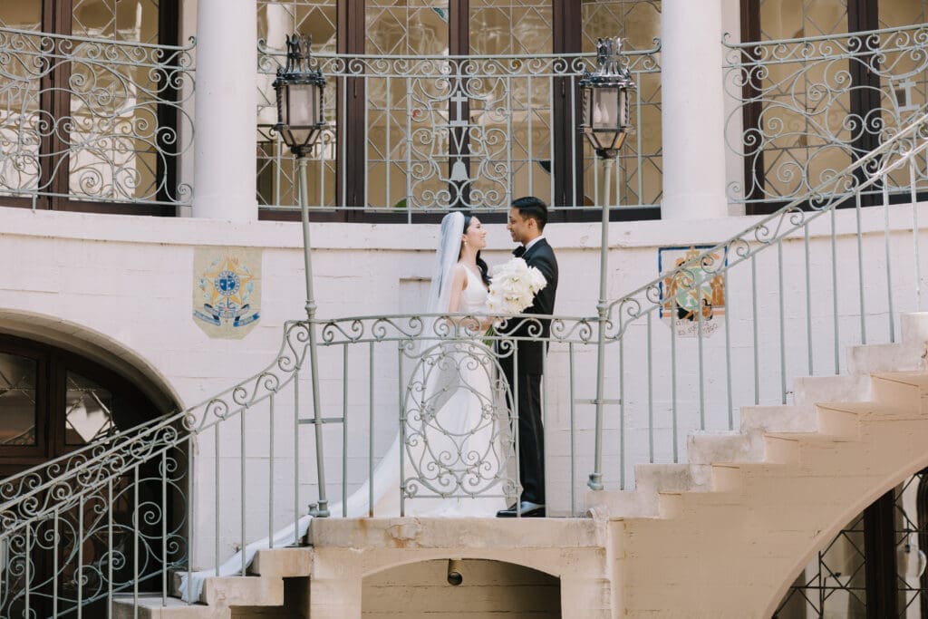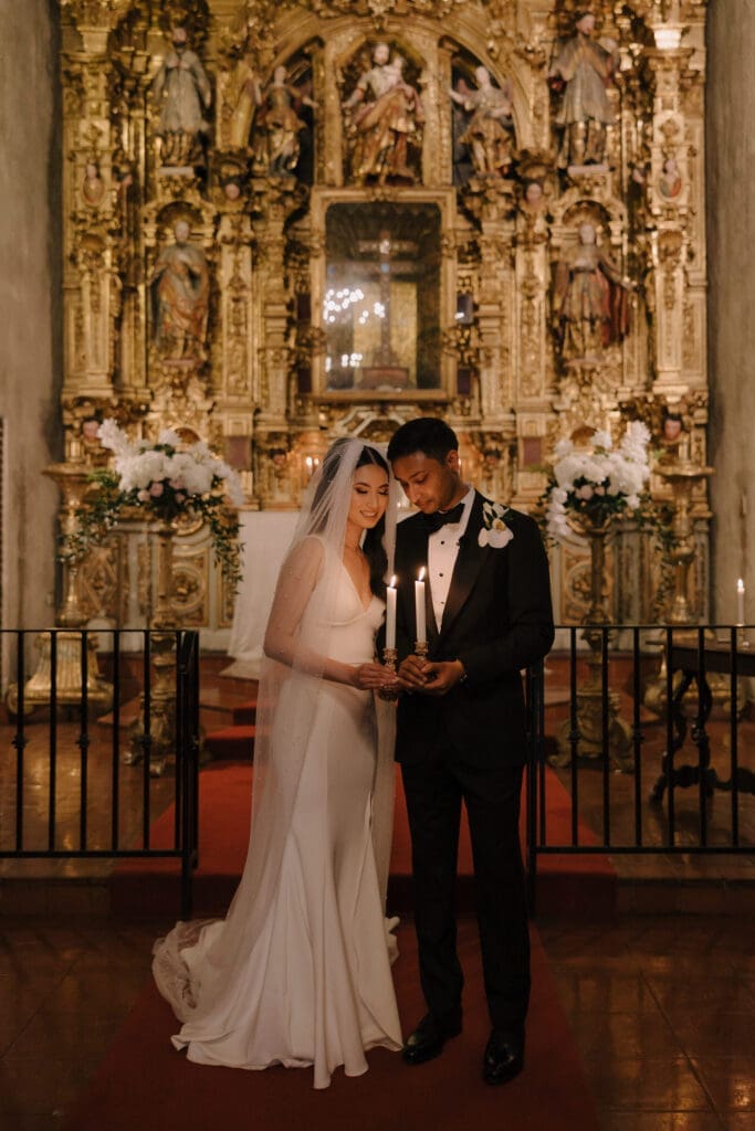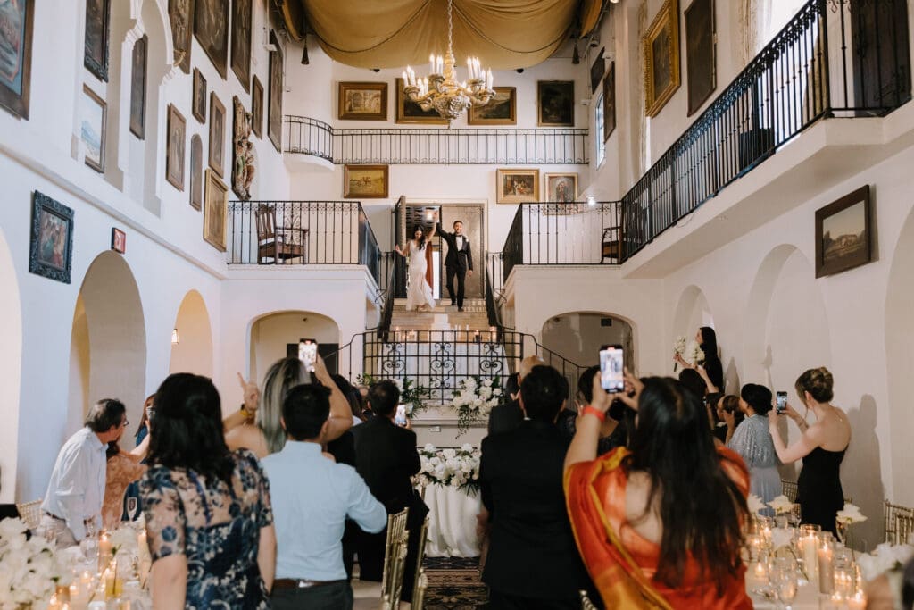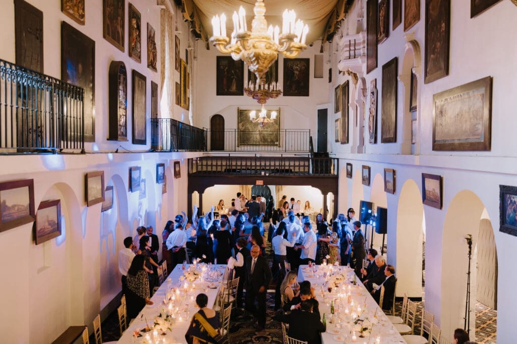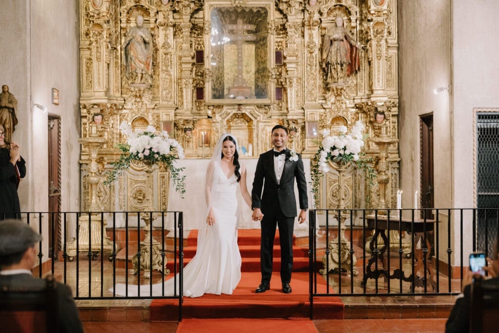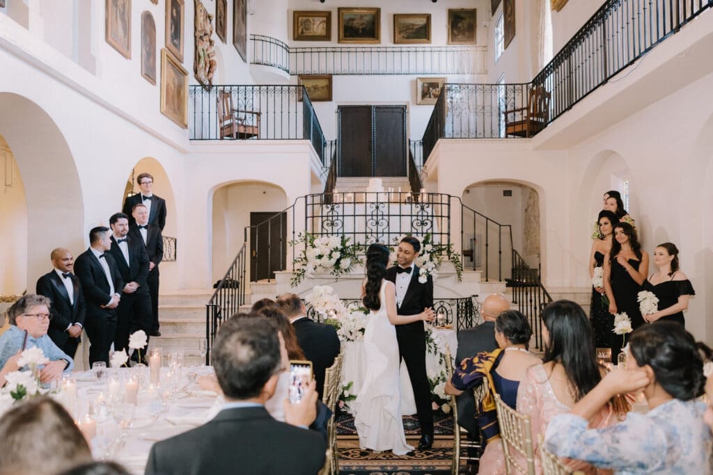 A “Historic” Ceremony & Reception The couple exchanged vows in the St. Francis of Assisi Chapel, framed by gold-leafed altars and stunning stained glass. Following the ceremony, guests transitioned to the Spanish Gallery. The gallery’s iconic arches and ambient lighting created an atmosphere of festivity that brought Yen and Vinay’s vision to life.