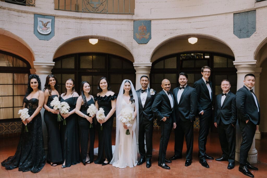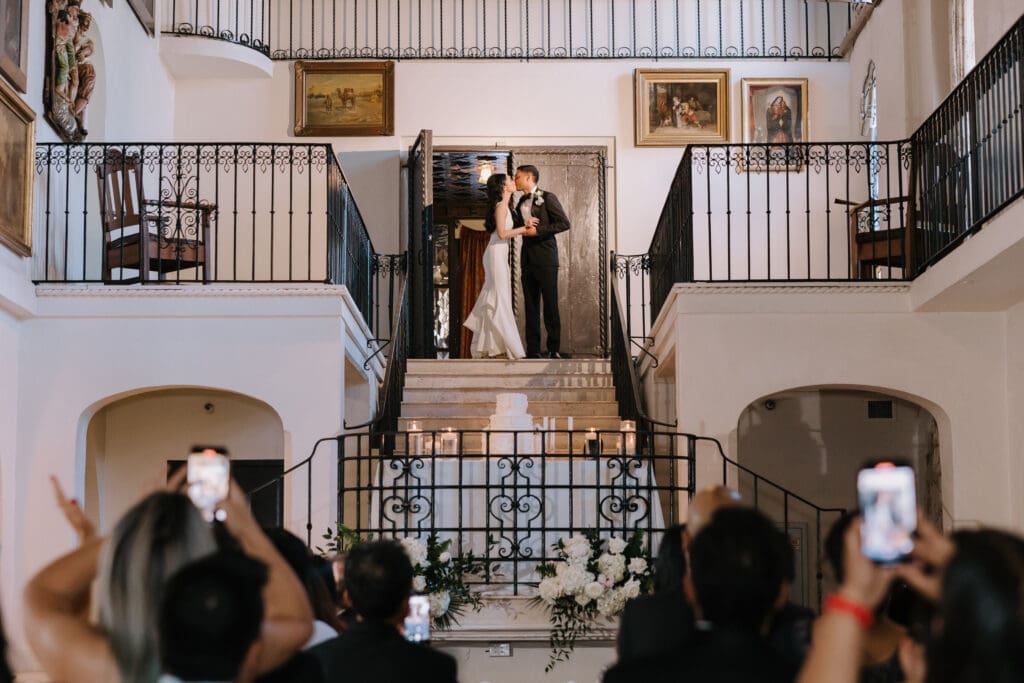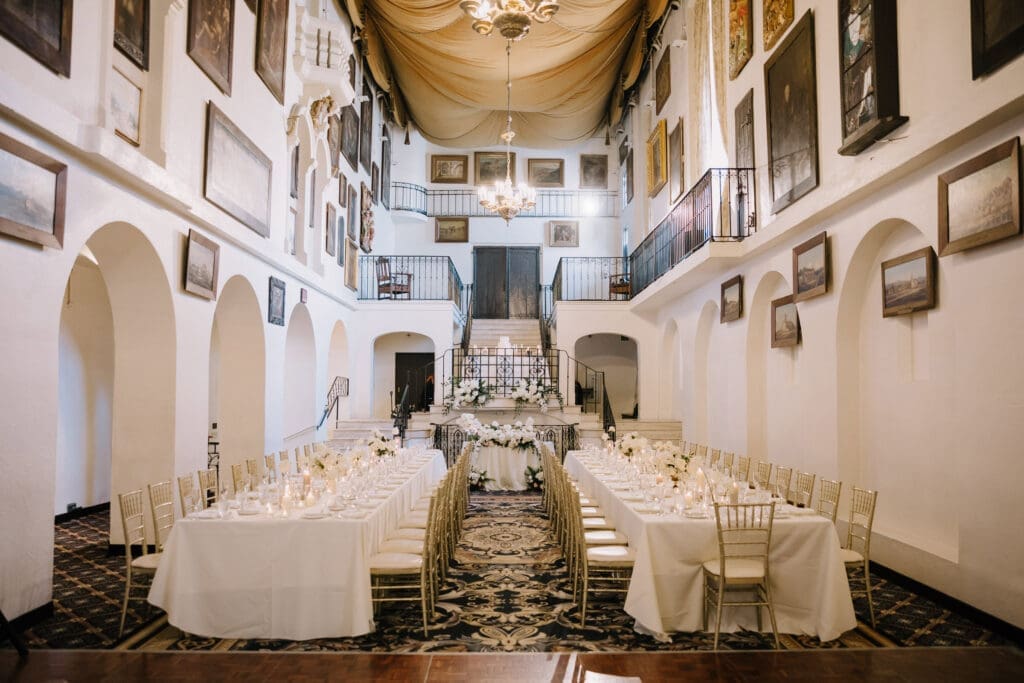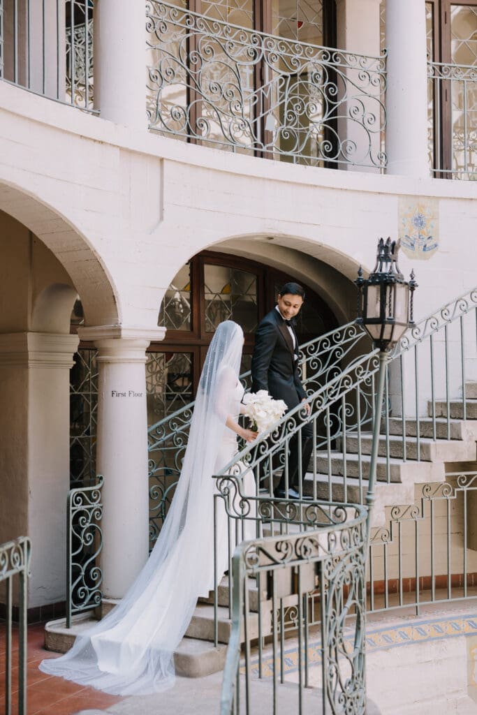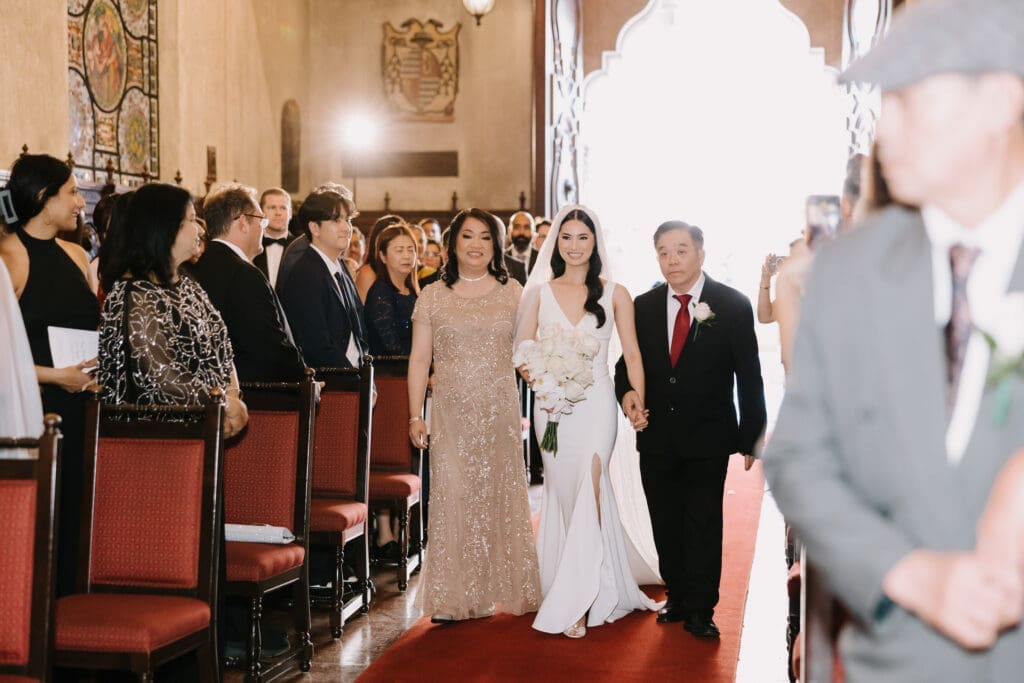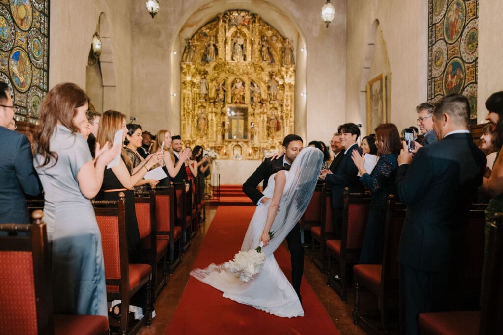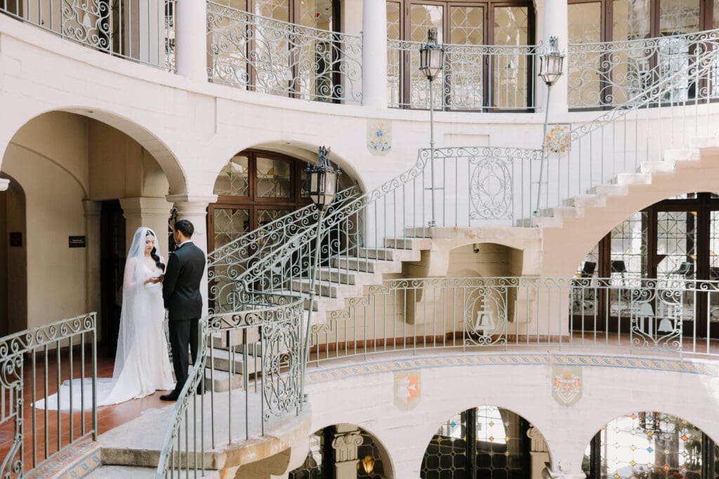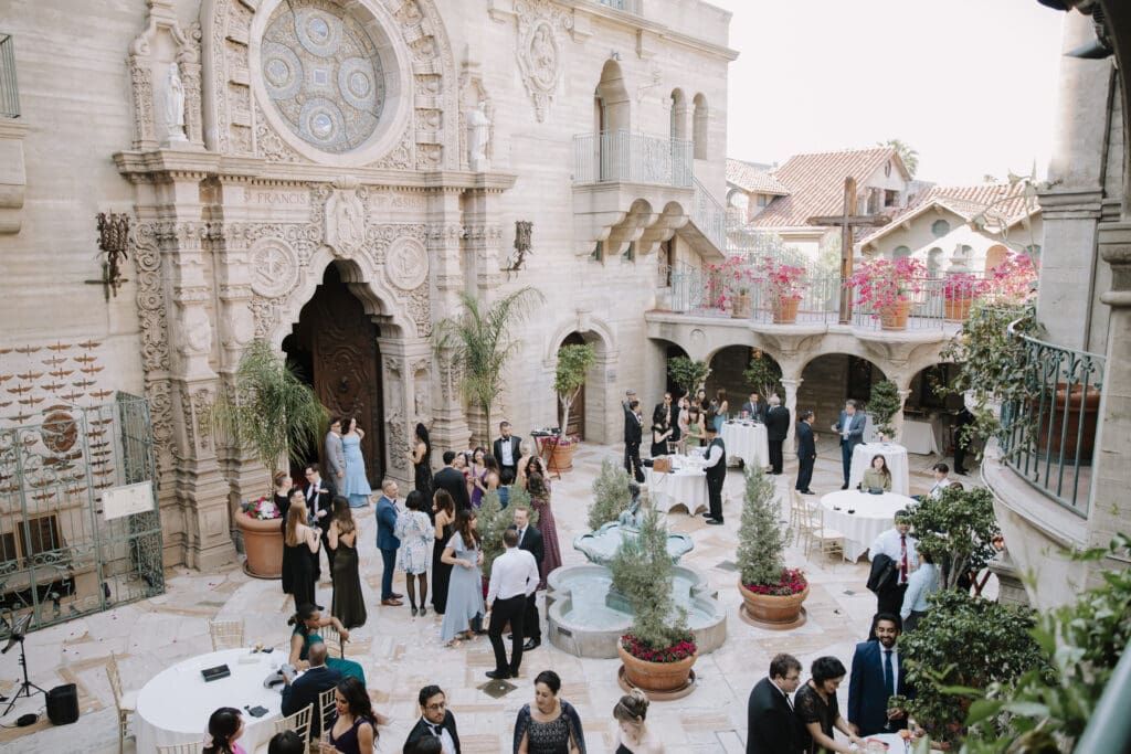 A “Historic” Ceremony & Reception The couple exchanged vows in the St. Francis of Assisi Chapel, framed by gold-leafed altars and stunning stained glass. Following the ceremony, guests transitioned to the Spanish Gallery. The gallery’s iconic arches and ambient lighting created an atmosphere of festivity that brought Yen and Vinay’s vision to life.