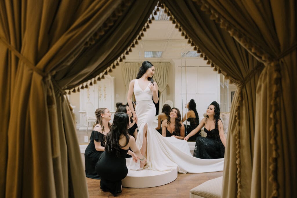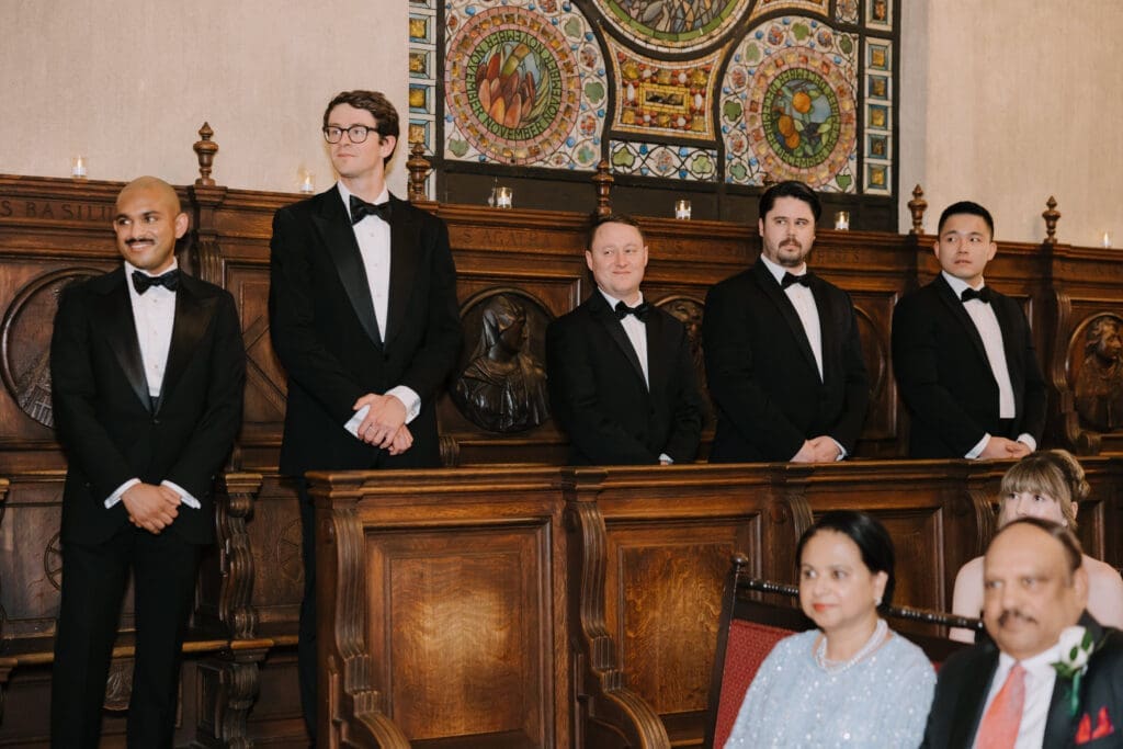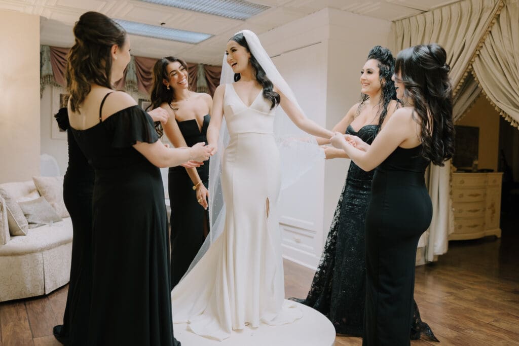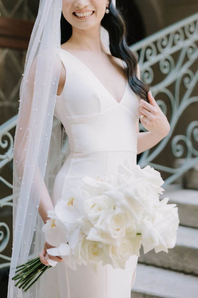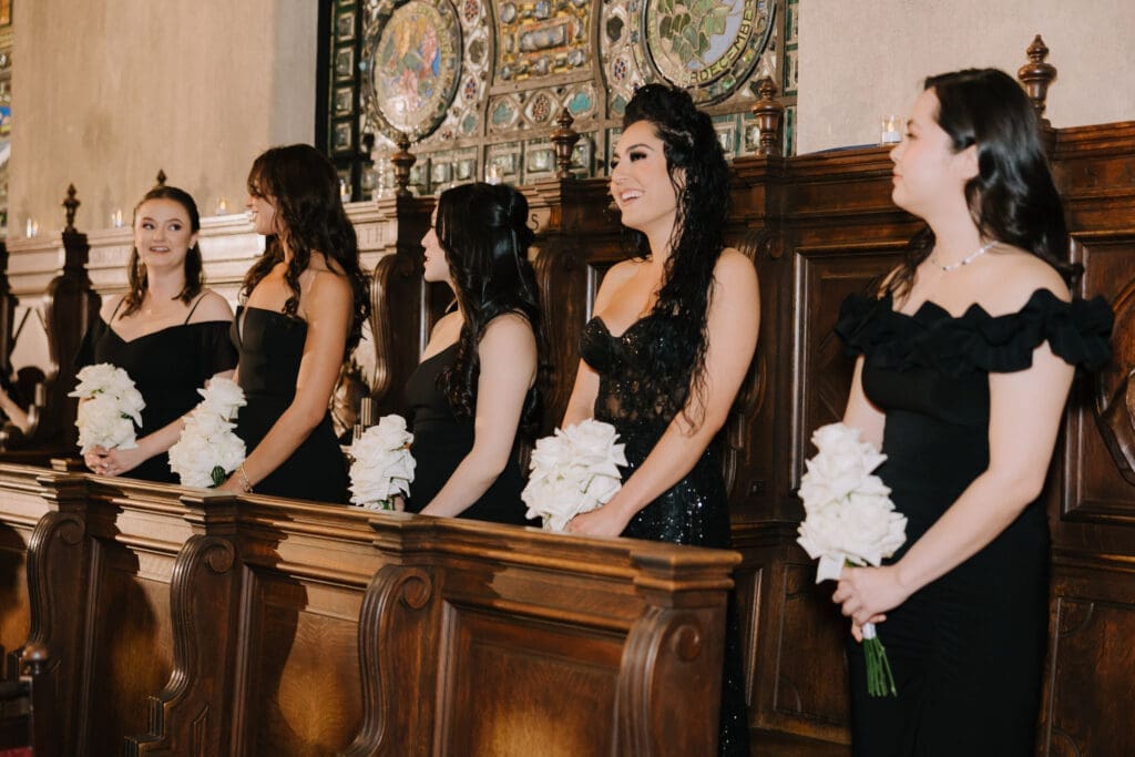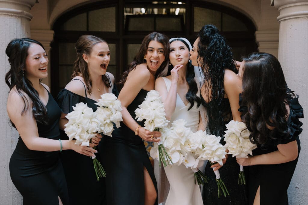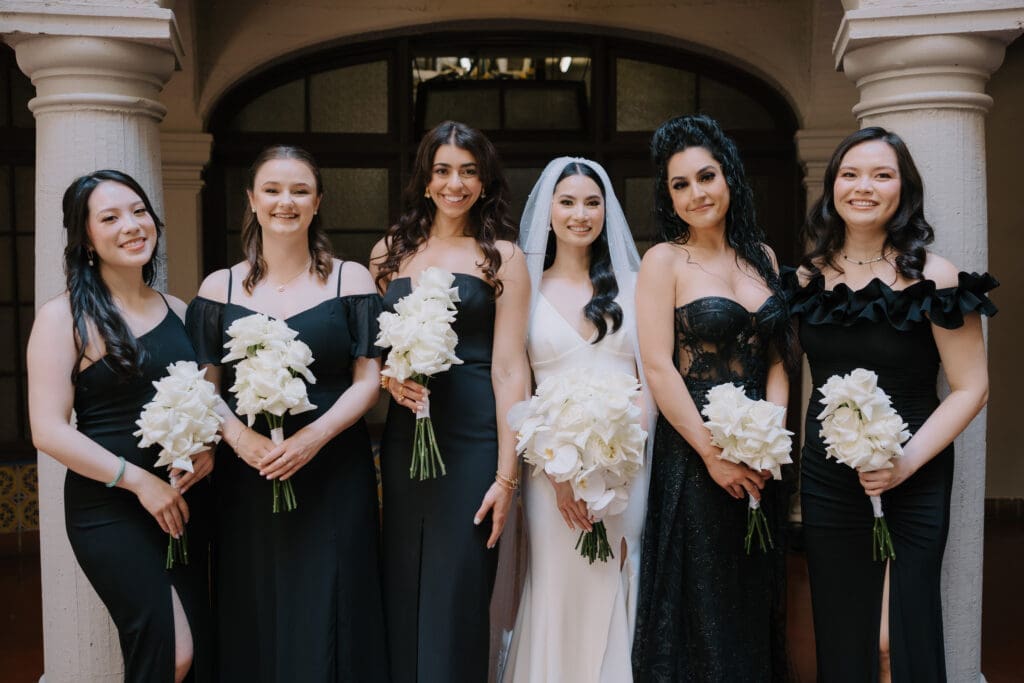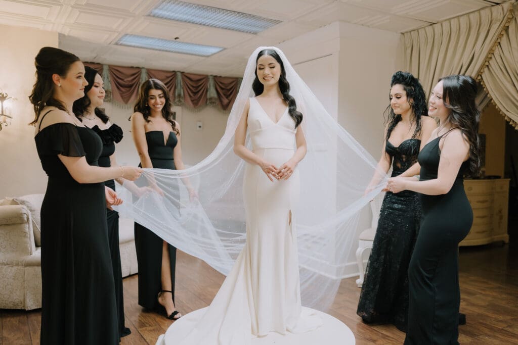 A Sophisticated Start The morning set a refined tone. Yen’s bridesmaids wore silky black gowns, perfectly complementing the groomsmen’s classic tuxedos. Against the backdrop of the Inn’s intricate stone carvings, Yen was the epitome of bridal beauty.