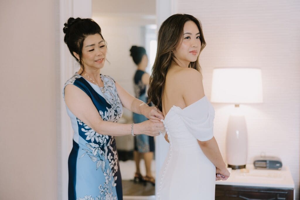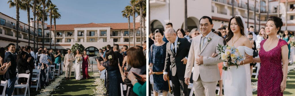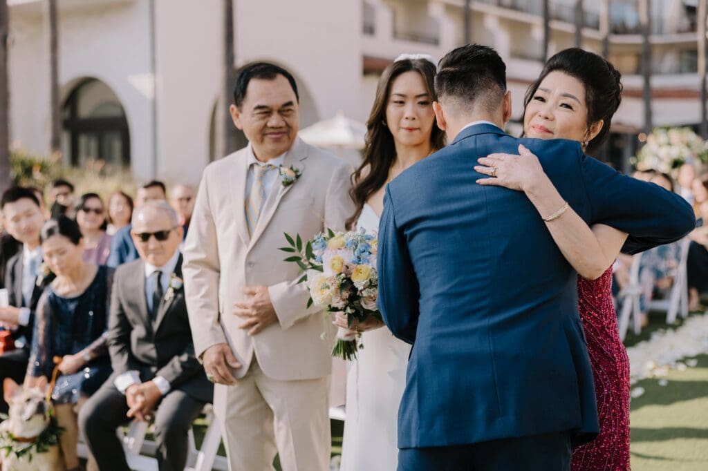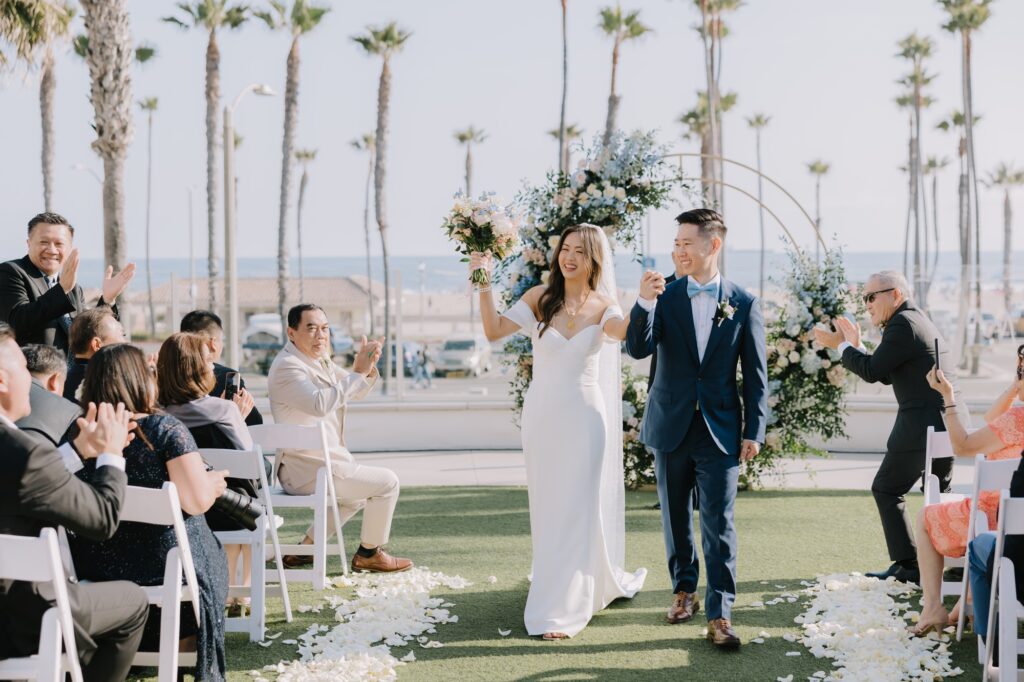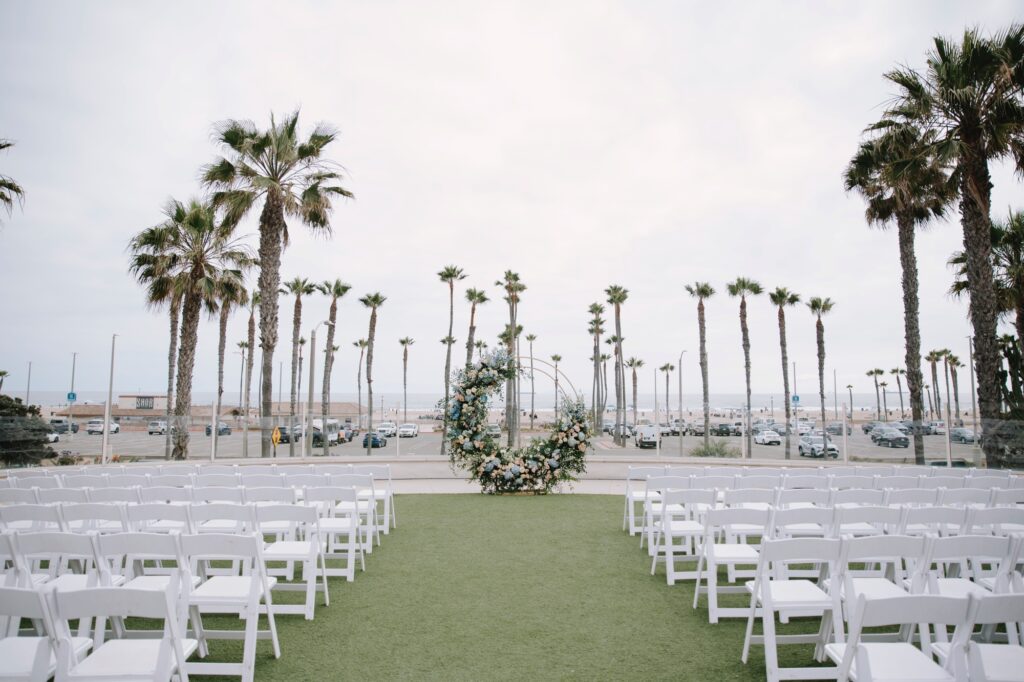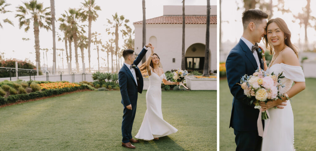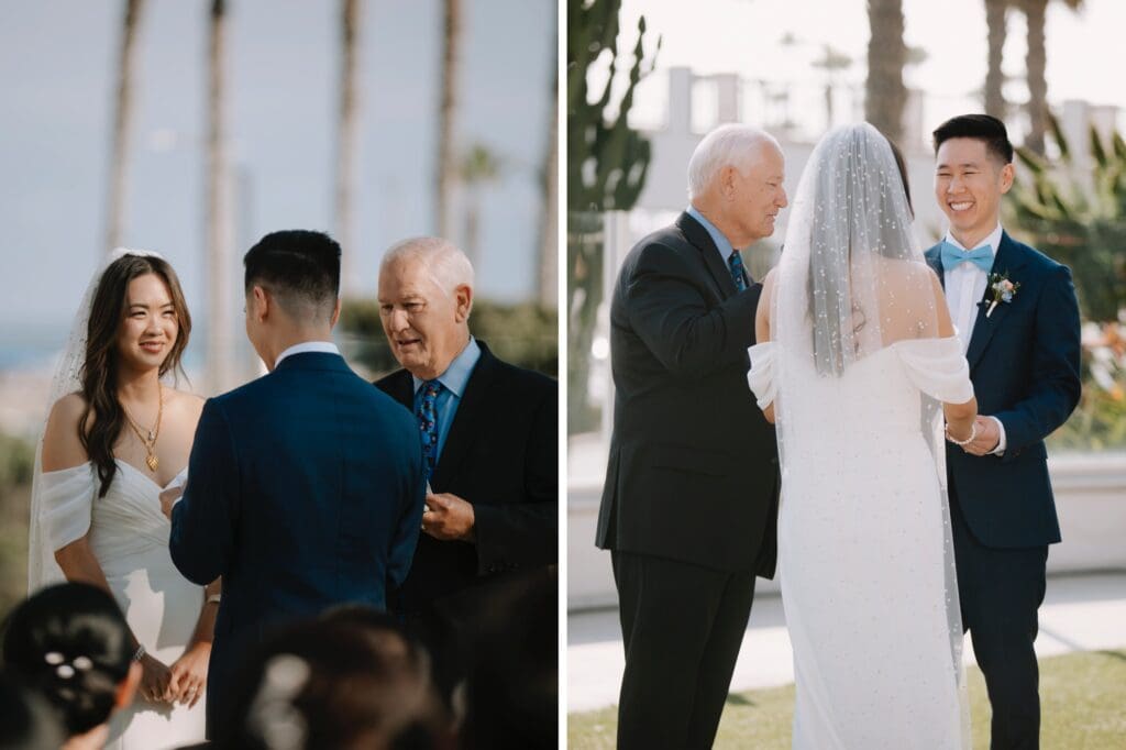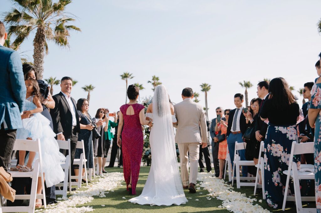 The ceremony took place on one of the resort’s stunning ocean-view lawns, where the Pacific breeze served as a nod to Angela’s Oahu roots. Between the palm-lined paths and the sunset portraits on the beach, the day was a seamless blend of classic Southern California surf culture and refined island elegance.
