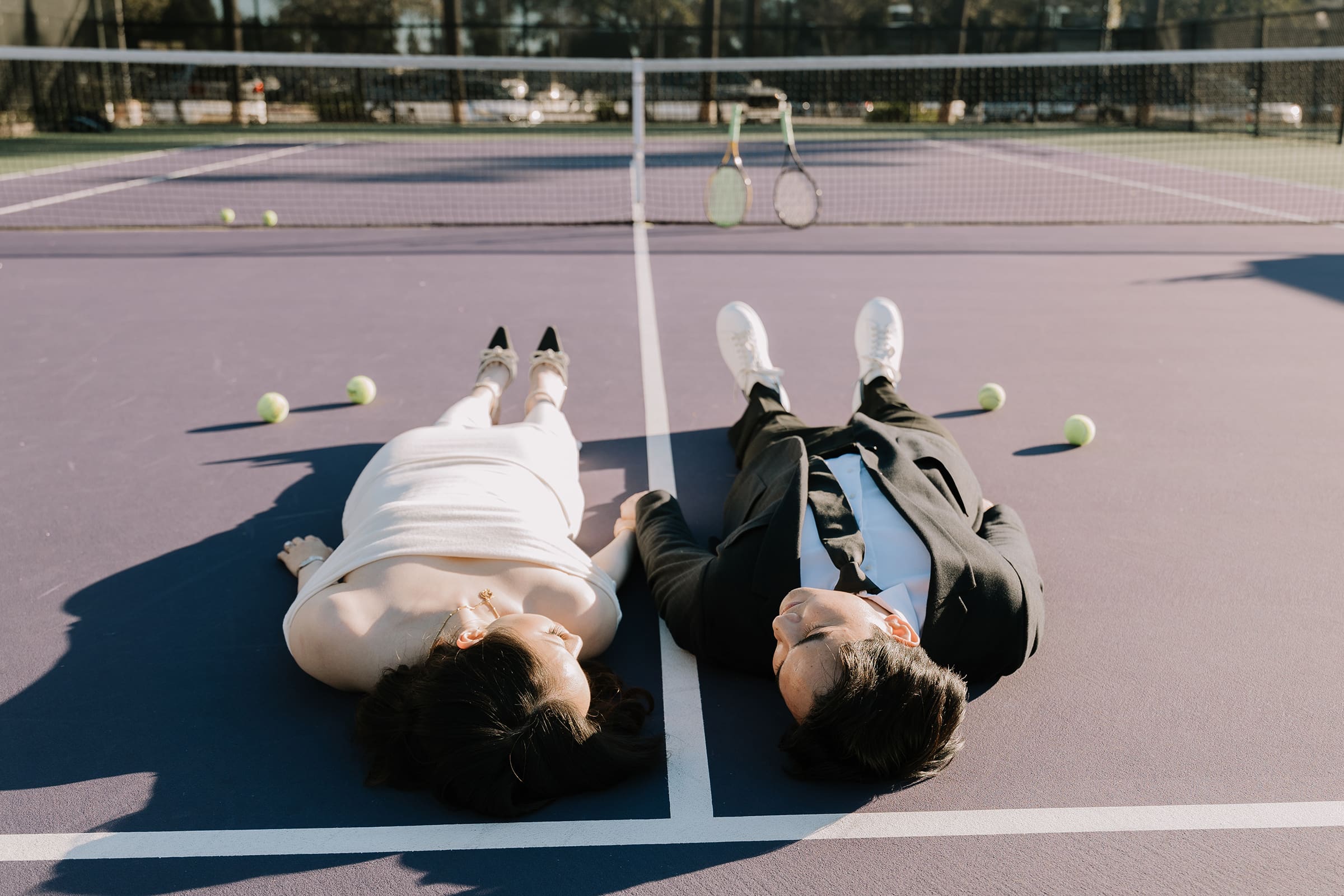 Their romance began on the iconic tennis courts of Long Beach, where playful games and shared smiles sparked an unbreakable connection. Returning to this meaningful spot for their engagement session, they created candid, artistic portraits full of spontaneity and depth—genuine moments that reflect the joy and authenticity of their relationship.