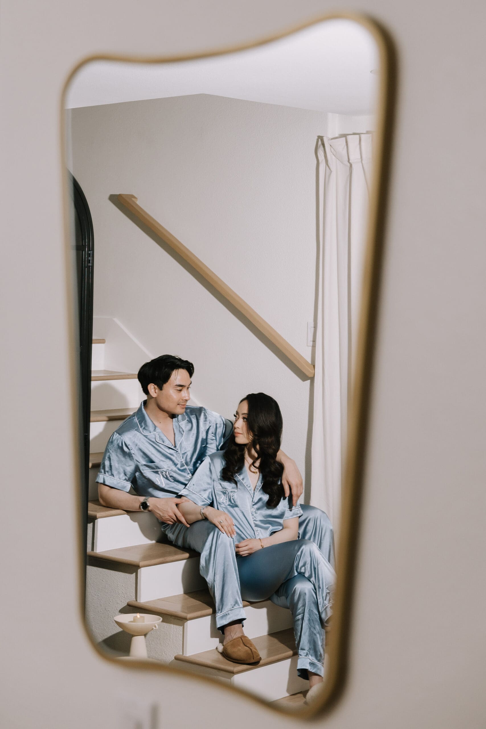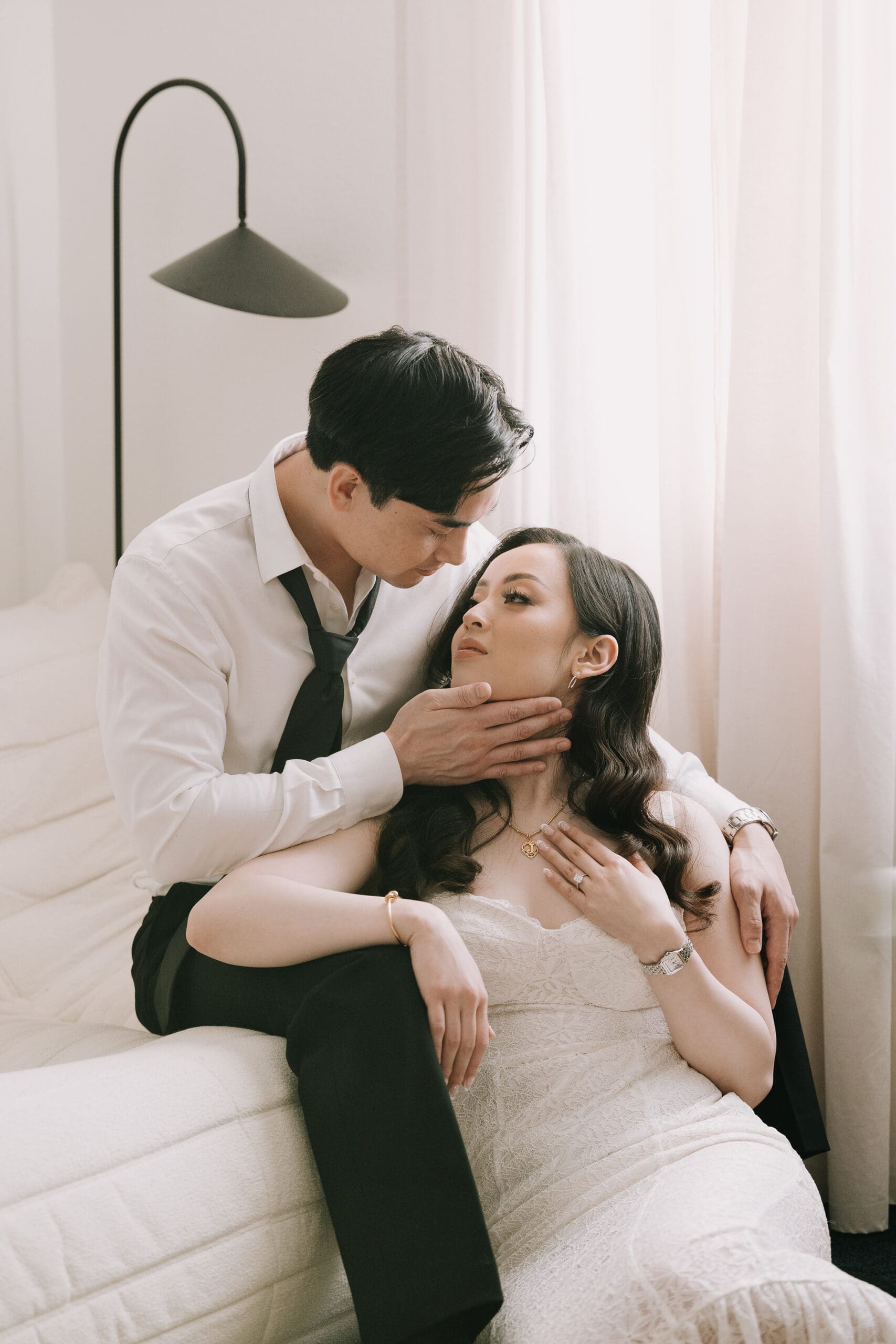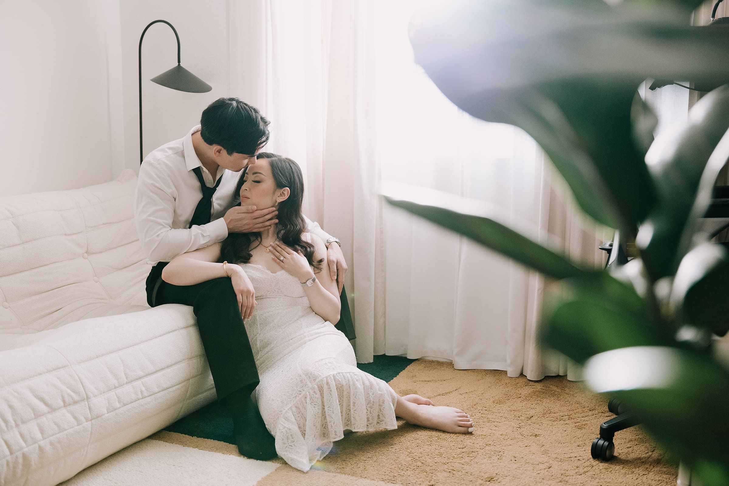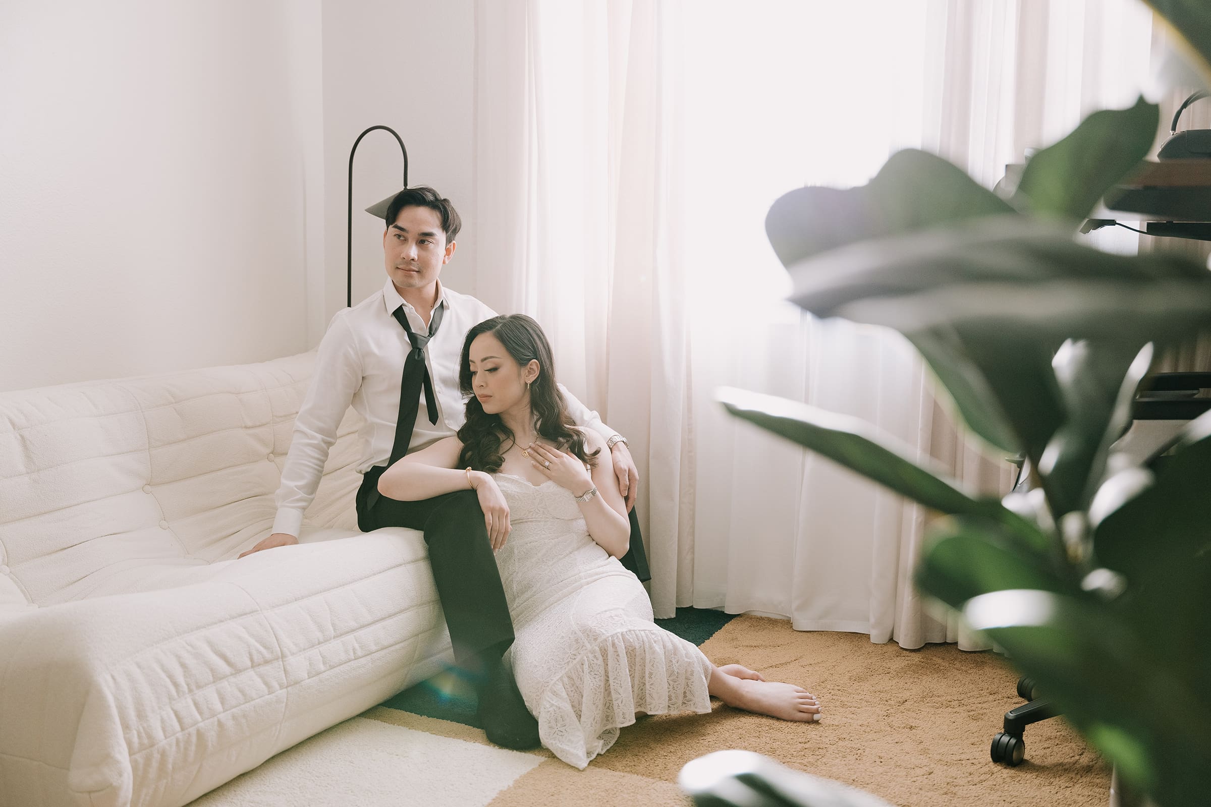 The session then transitioned seamlessly to a moody, home-style shoot in their own space. Embracing rich shadows, warm lighting, and artistic flair, these intimate images highlight the quiet romance and comfort they share every day, showcasing the multifaceted layers of their bond.