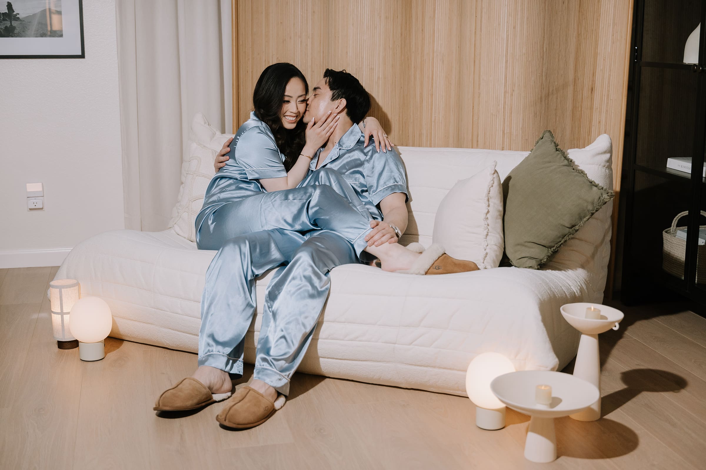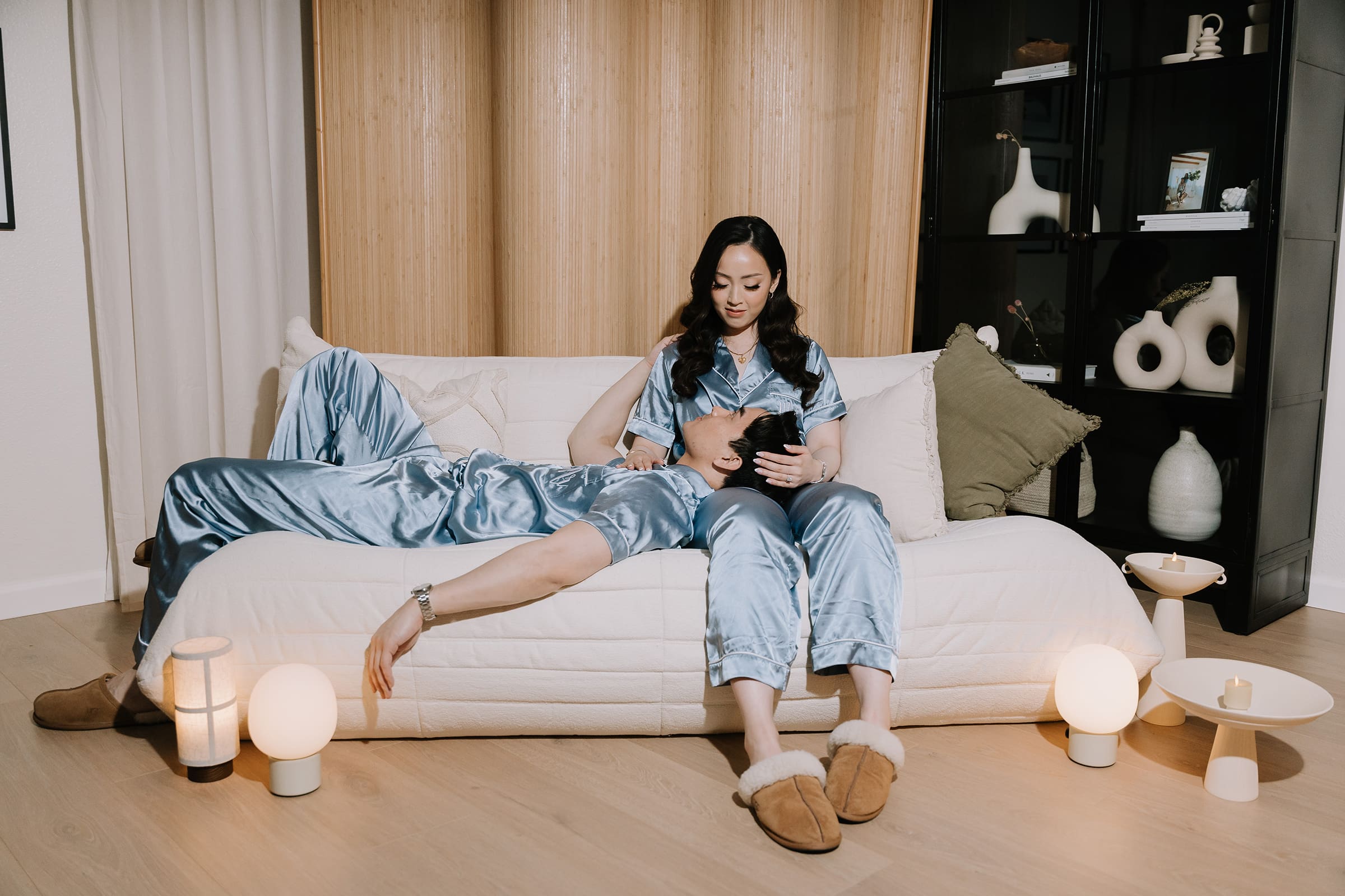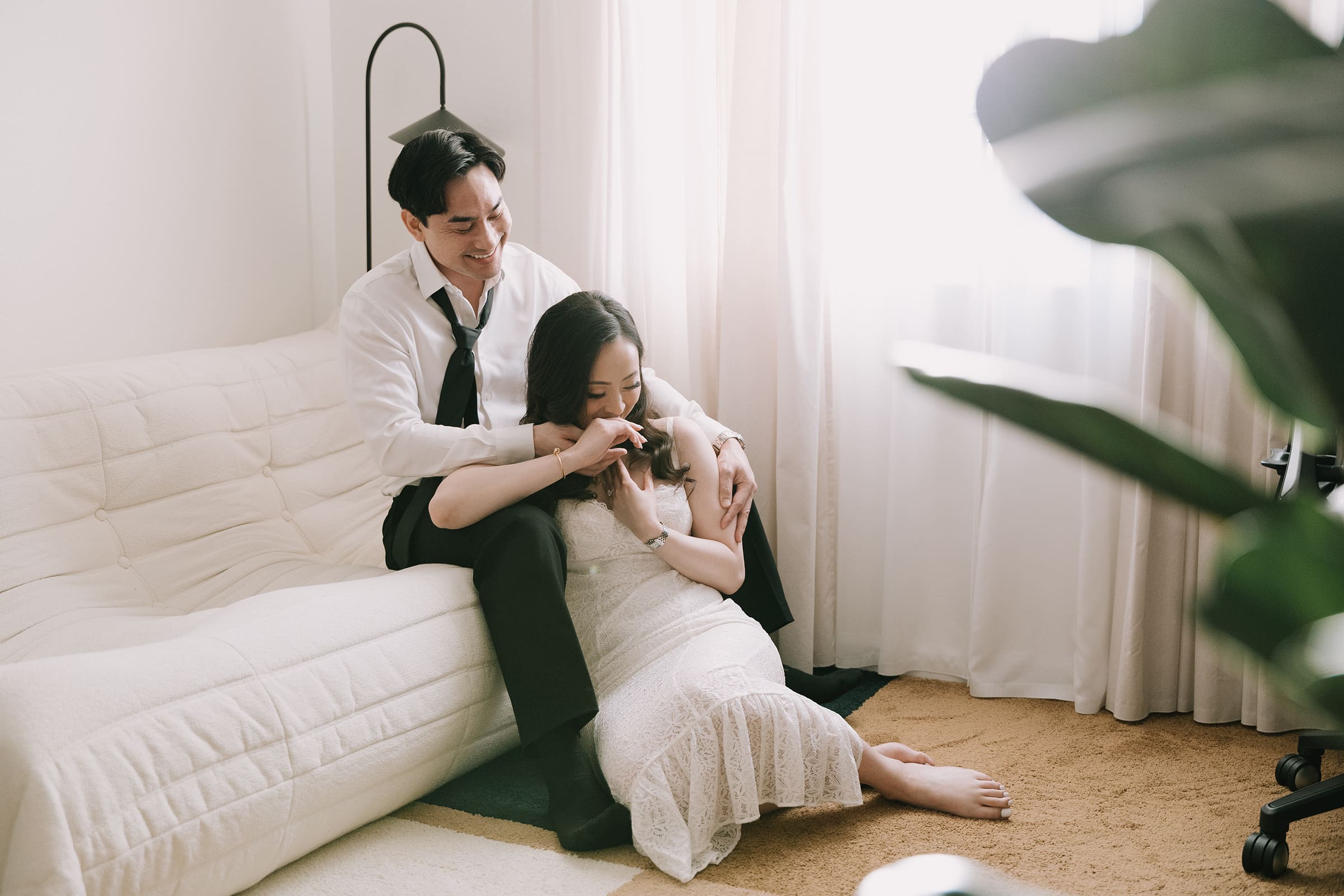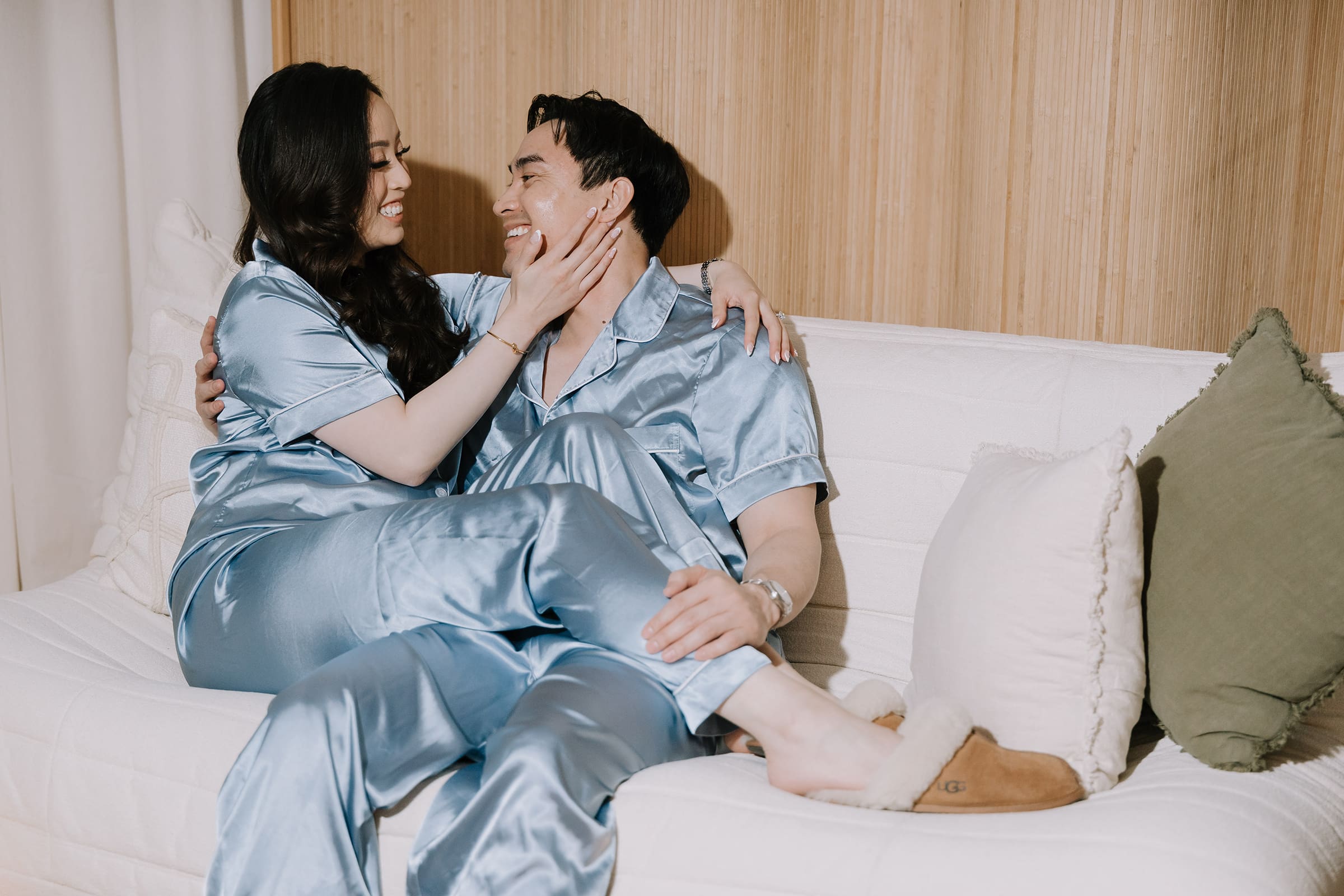 The session then transitioned seamlessly to a moody, home-style shoot in their own space. Embracing rich shadows, warm lighting, and artistic flair, these intimate images highlight the quiet romance and comfort they share every day, showcasing the multifaceted layers of their bond.