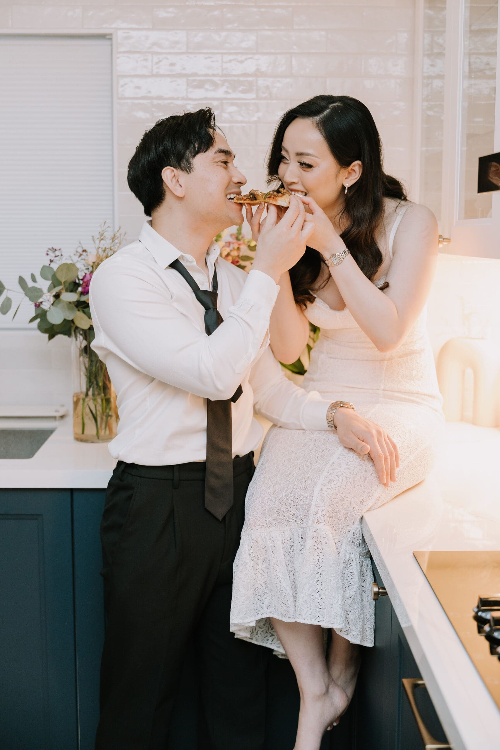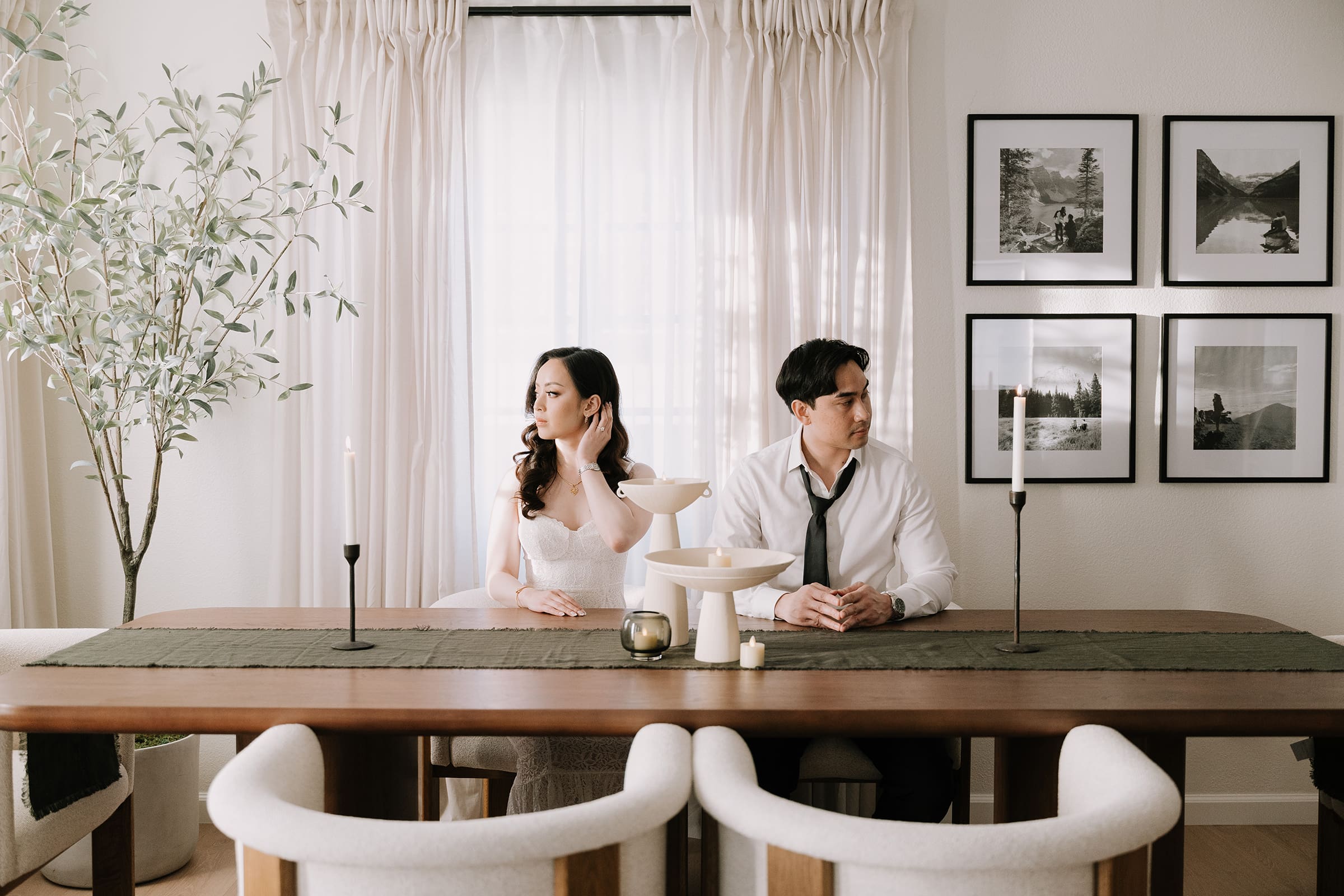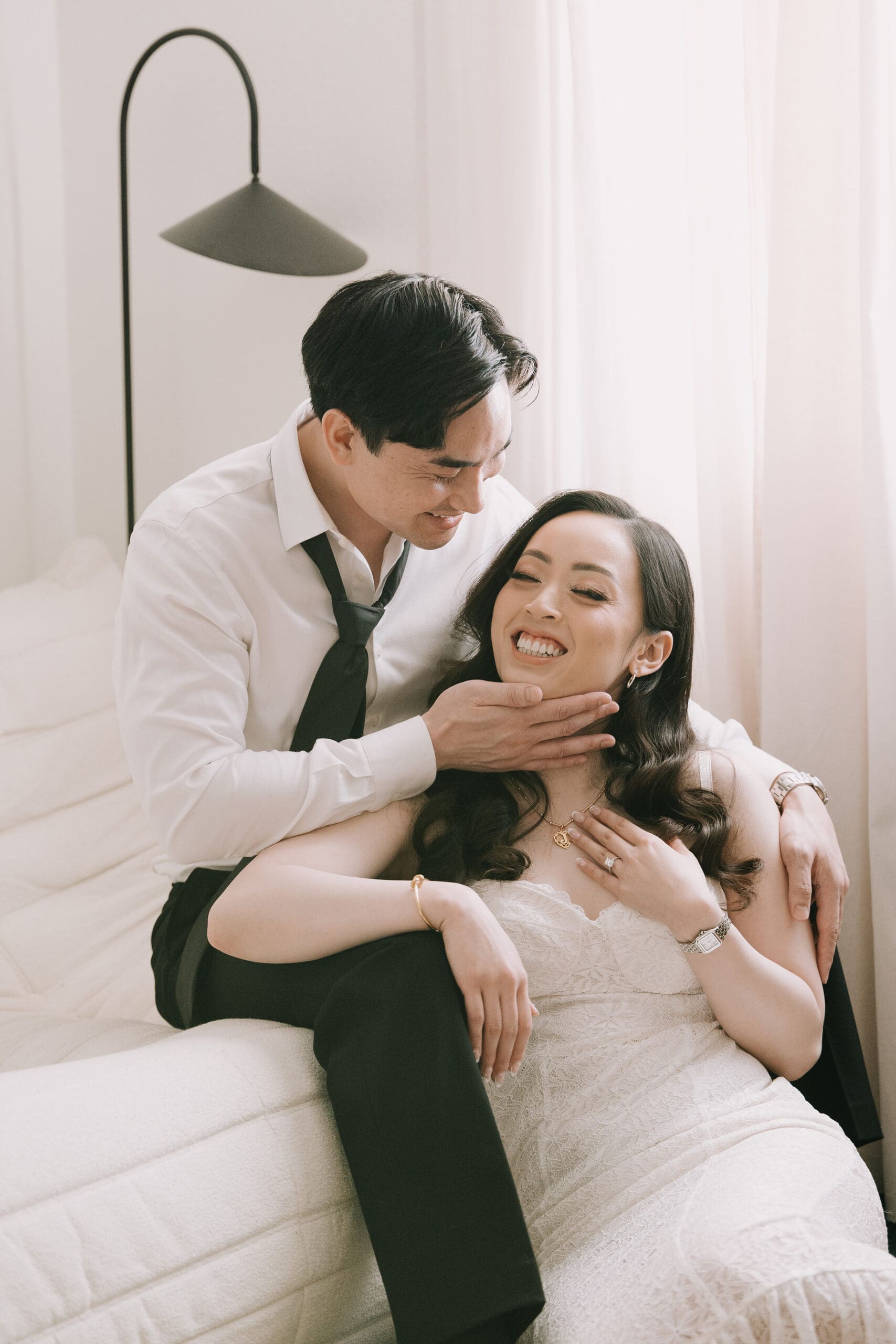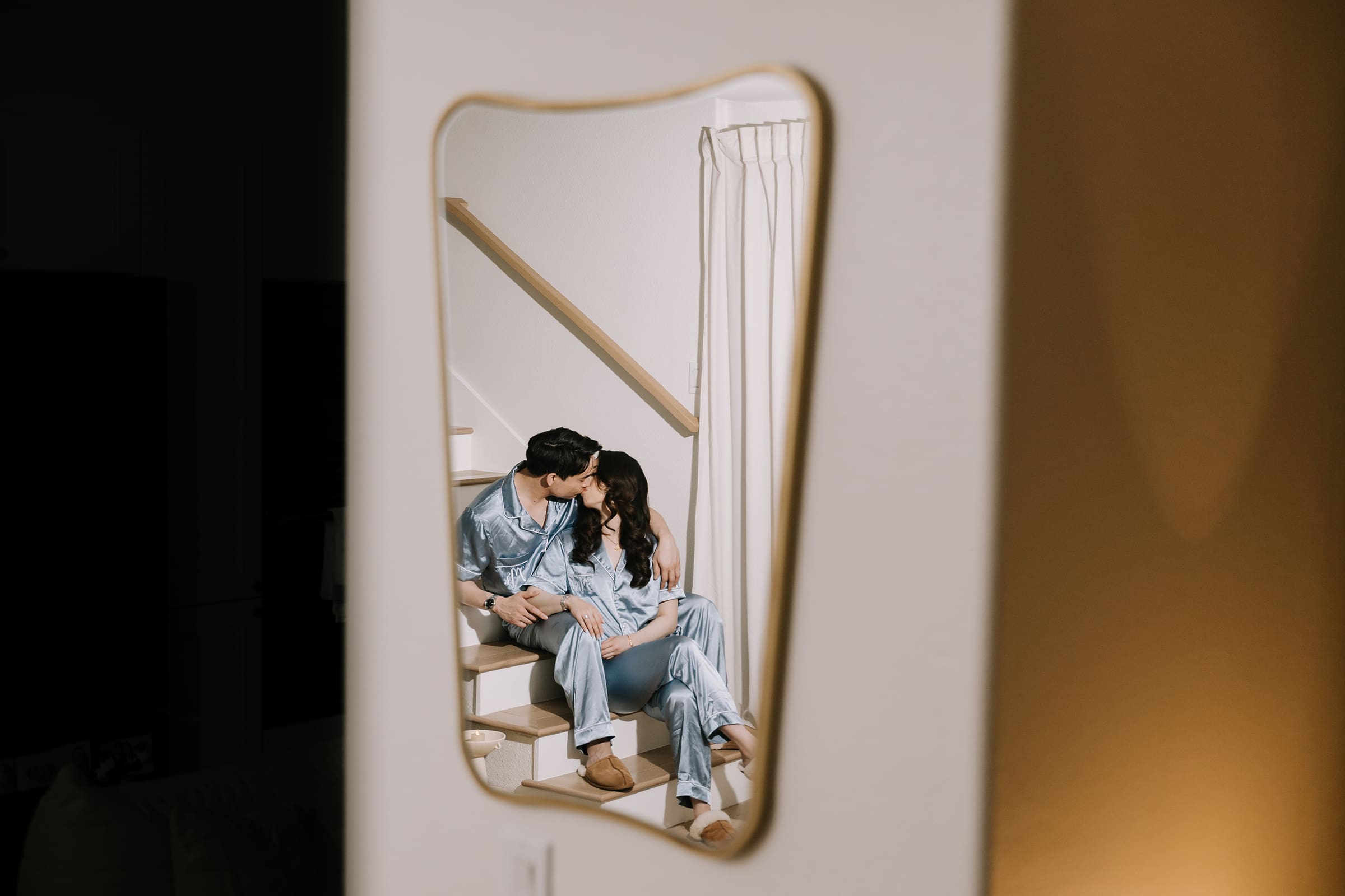 The session then transitioned seamlessly to a moody, home-style shoot in their own space. Embracing rich shadows, warm lighting, and artistic flair, these intimate images highlight the quiet romance and comfort they share every day, showcasing the multifaceted layers of their bond.