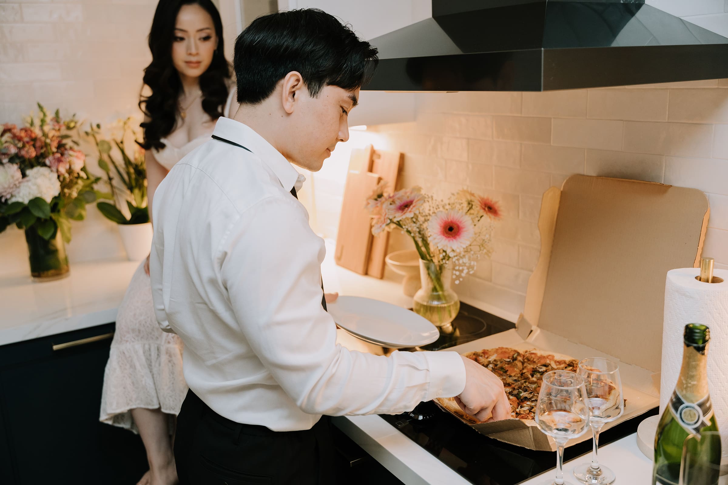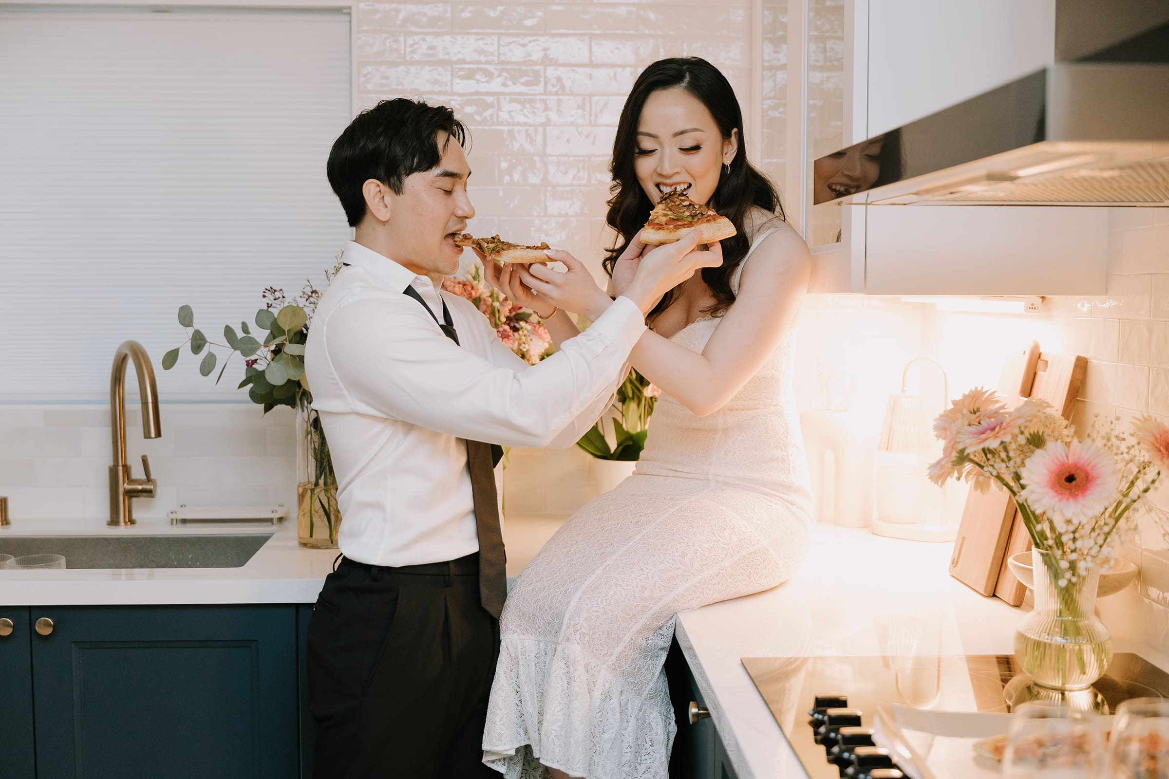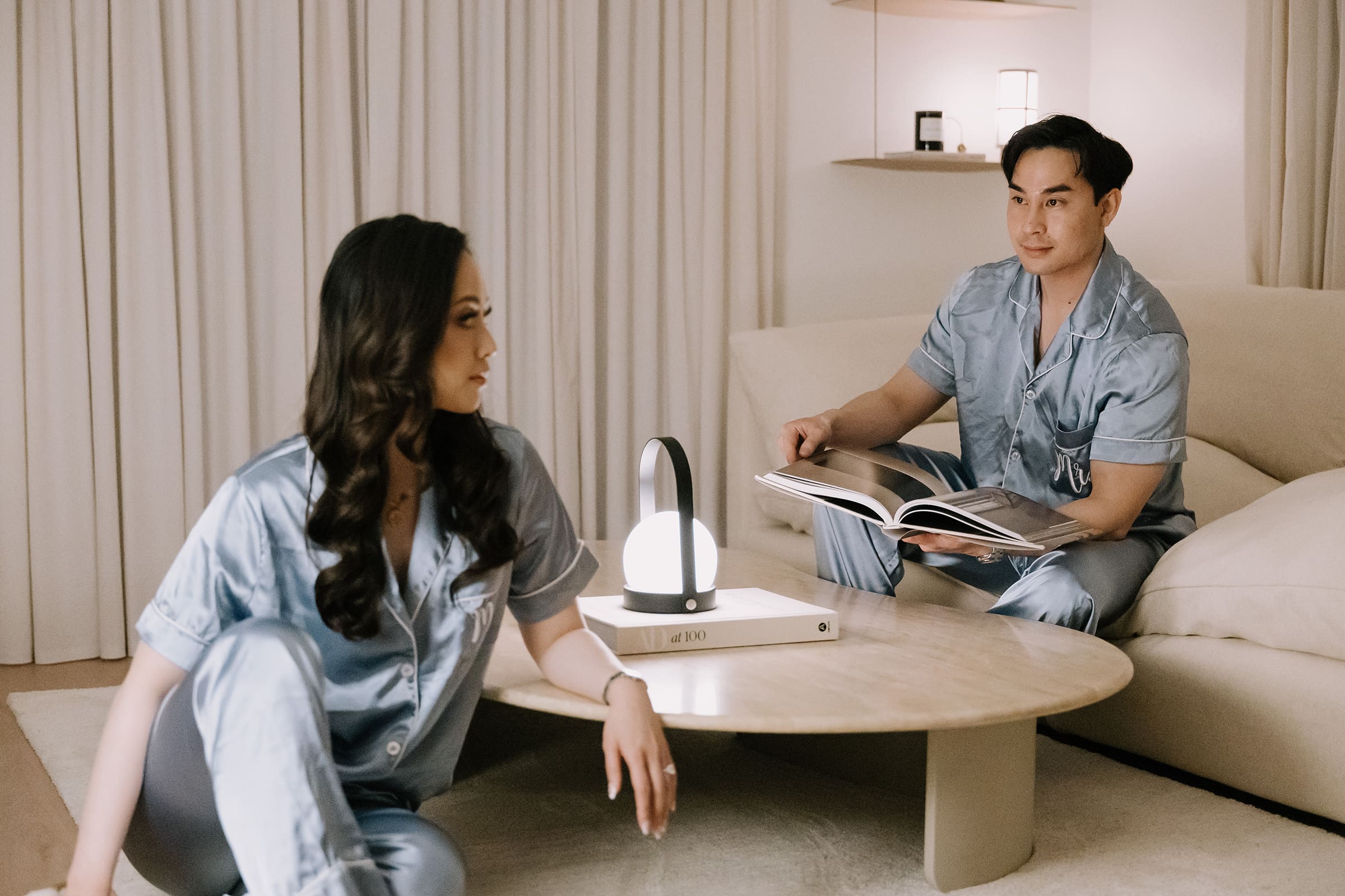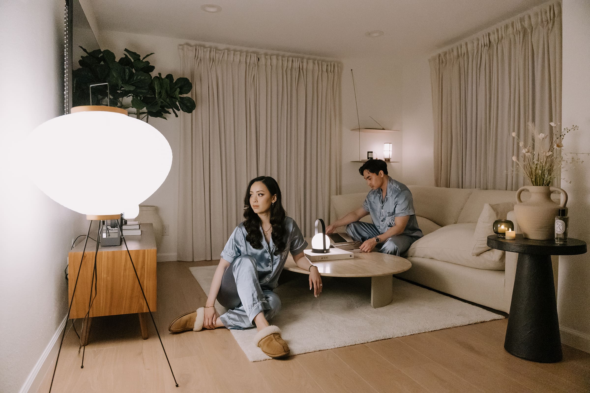 The session then transitioned seamlessly to a moody, home-style shoot in their own space. Embracing rich shadows, warm lighting, and artistic flair, these intimate images highlight the quiet romance and comfort they share every day, showcasing the multifaceted layers of their bond.