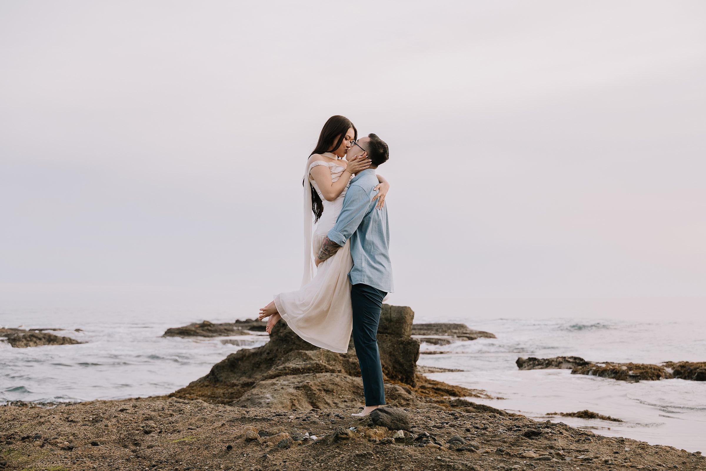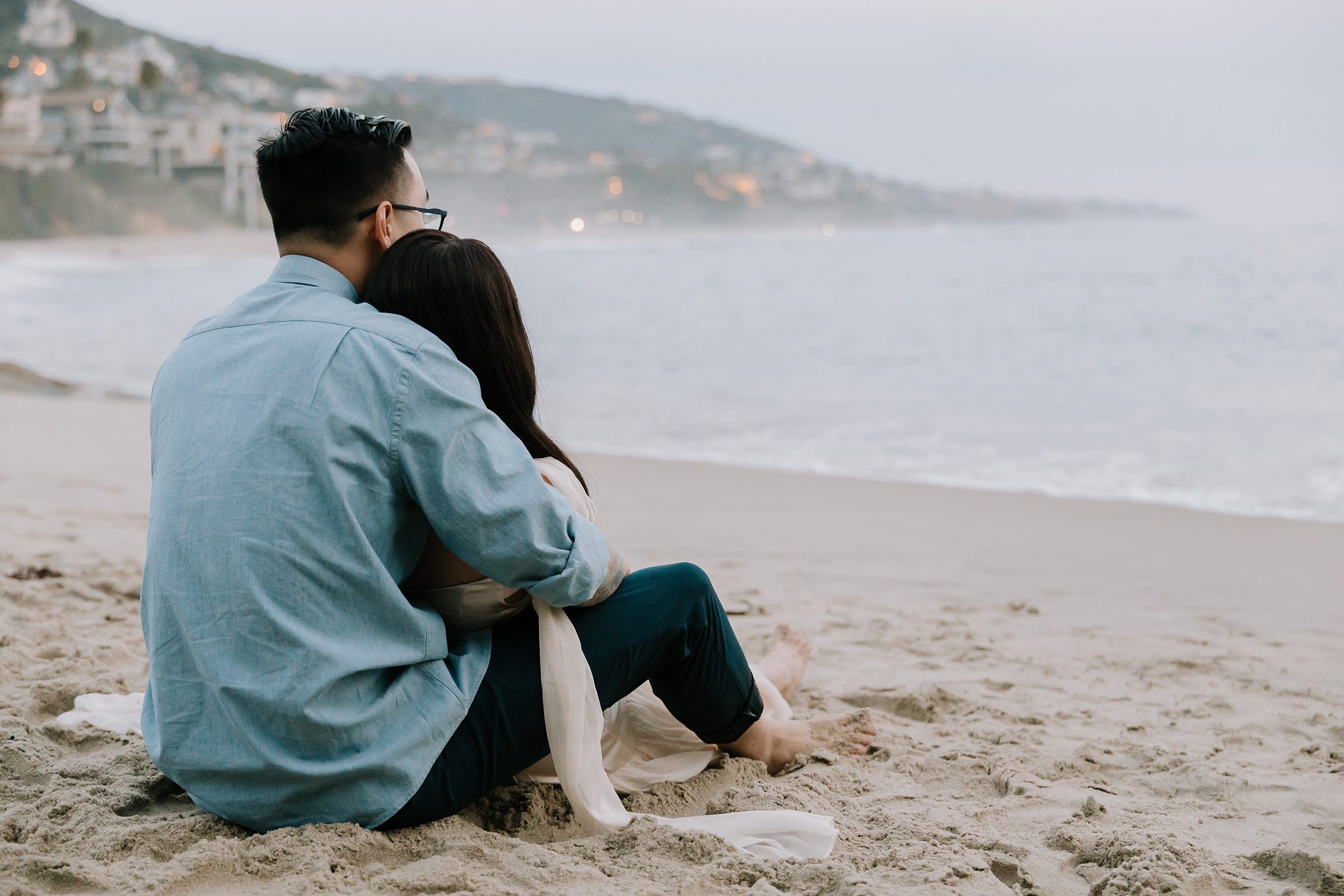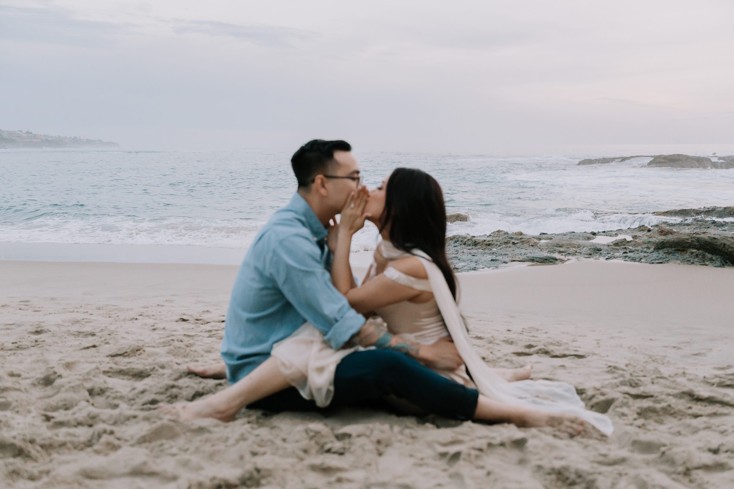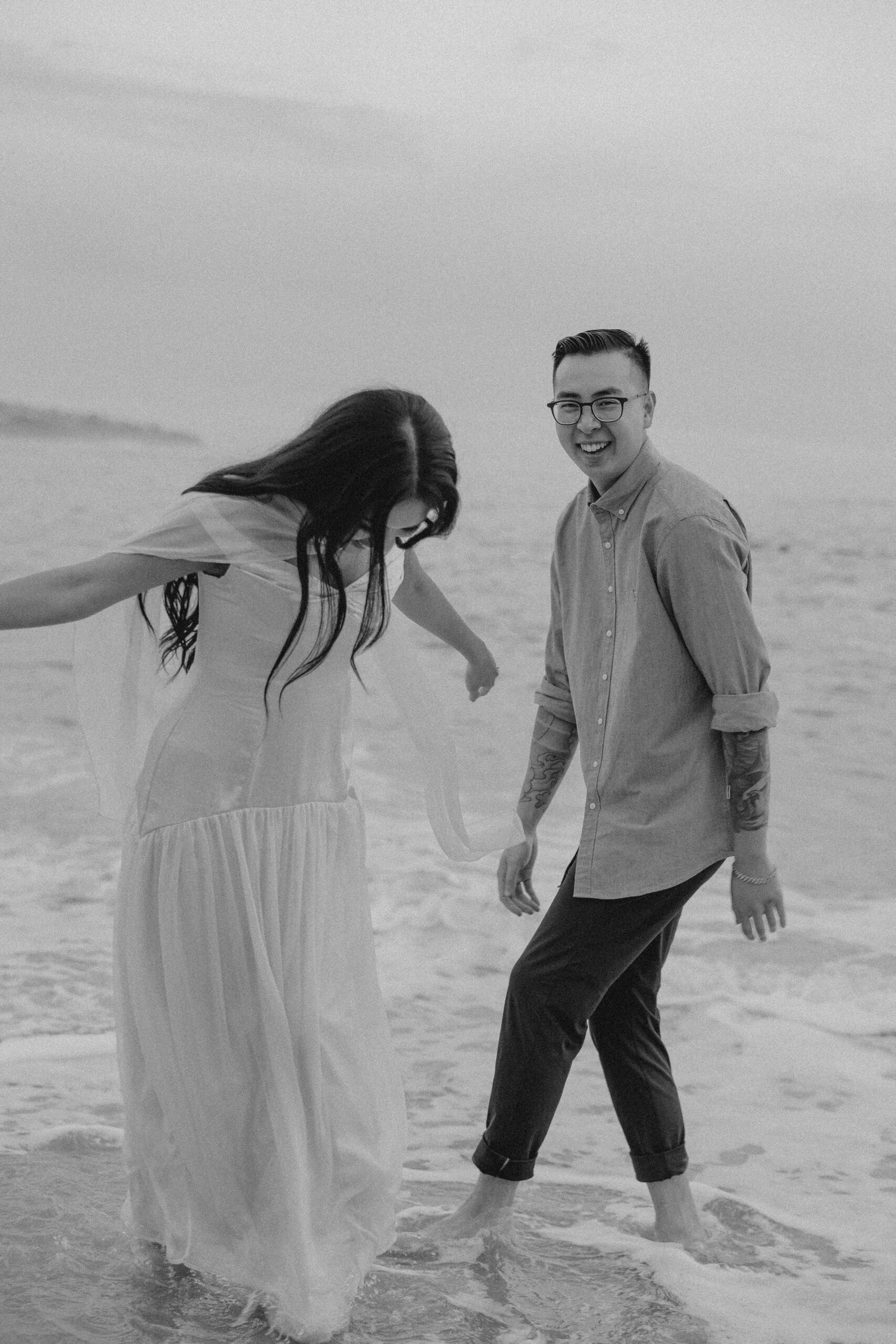 As blue hour arrived, we moved to Laguna Beach for a completely different mood. Barefoot on the sand, they laughed, splashed in the waves, and shared sweet kisses as the ocean glowed behind them. The relaxed, romantic atmosphere let their playful side shine through.