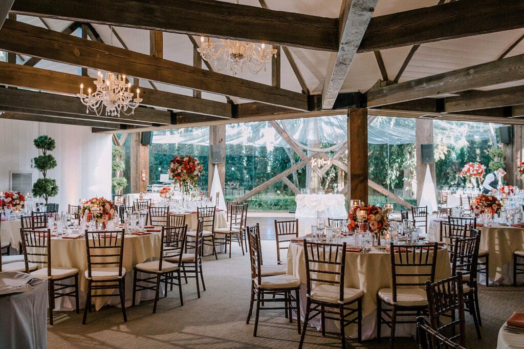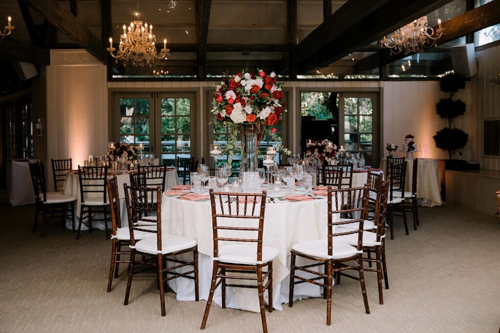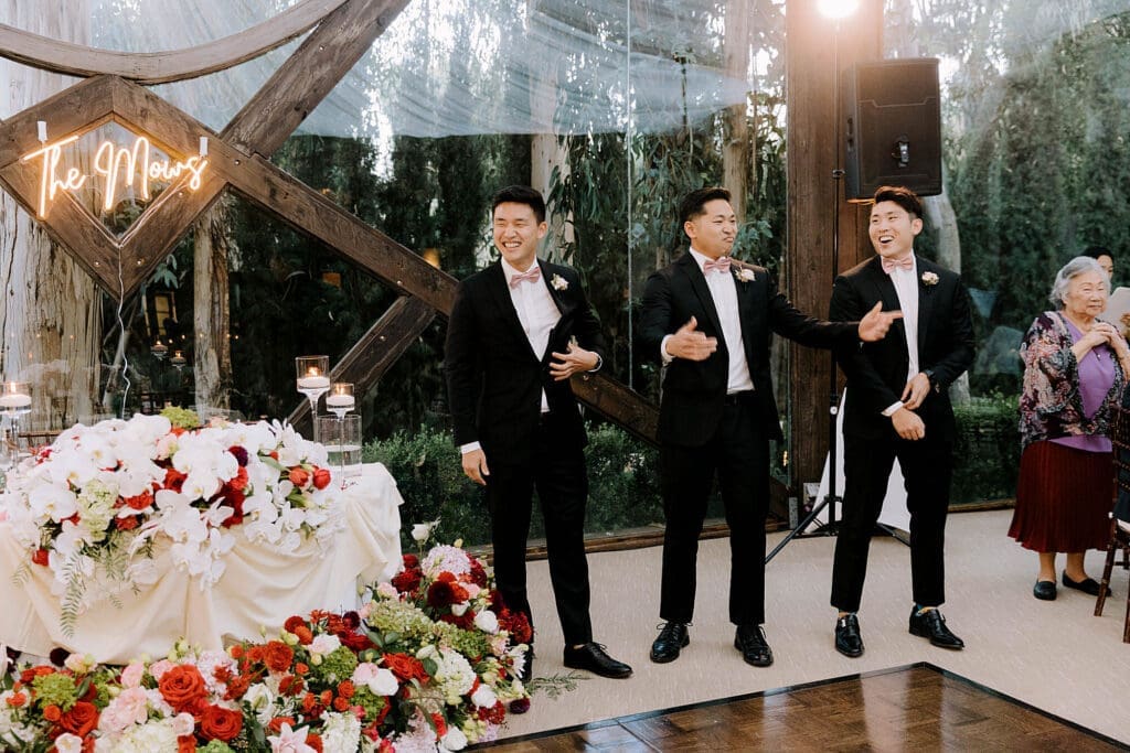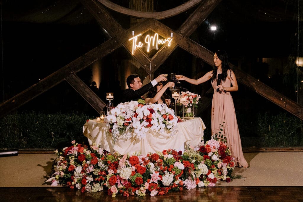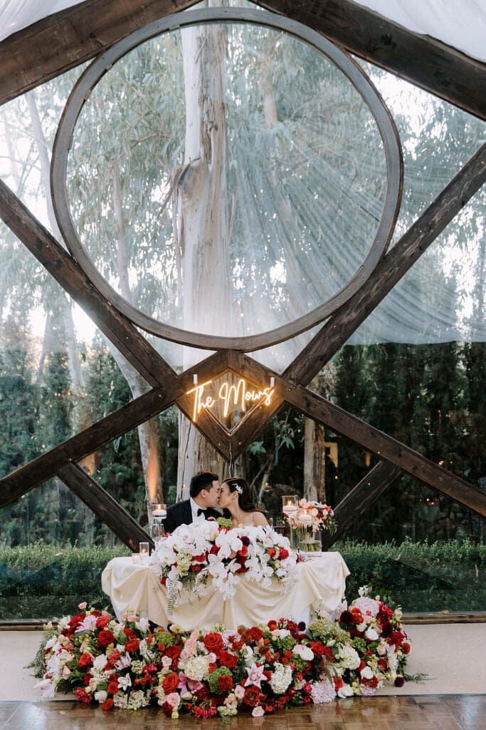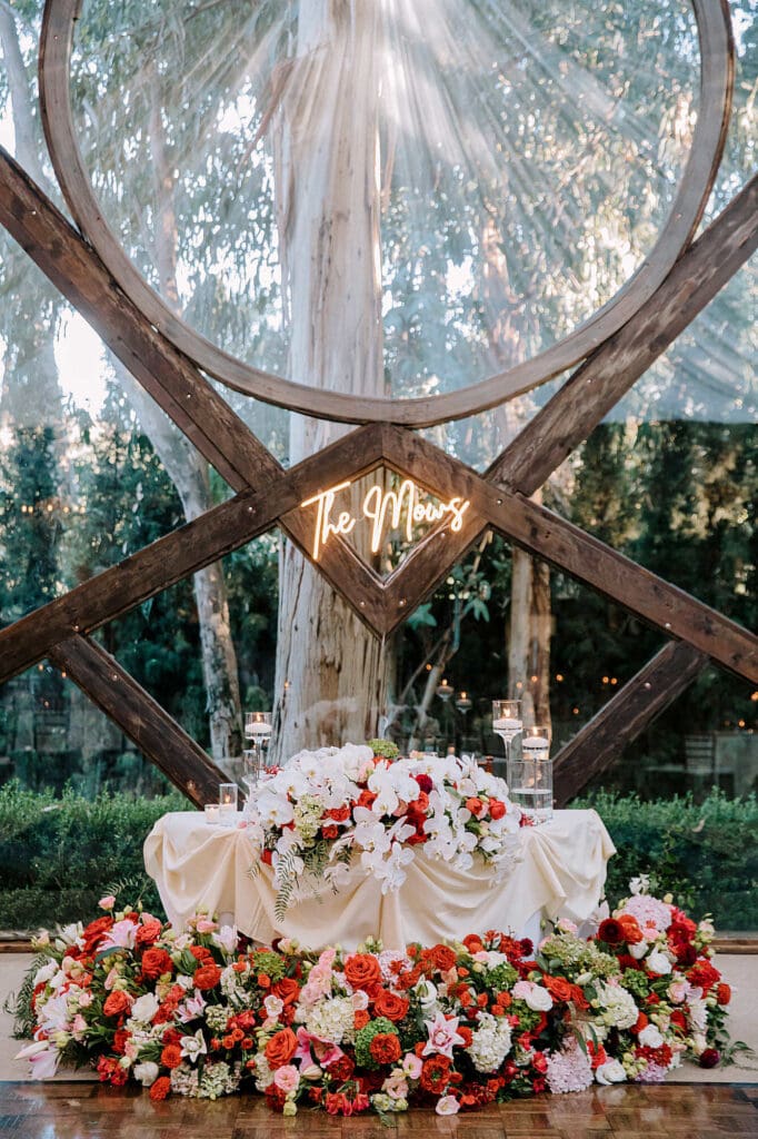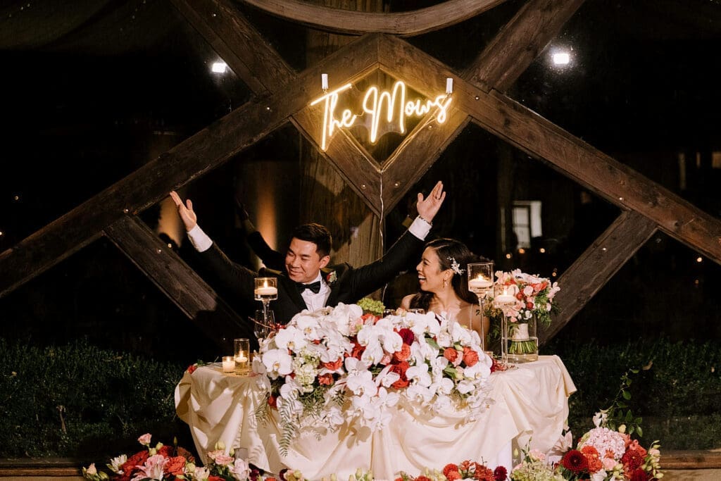 The grand reception featured a sophisticated design that perfectly balanced rustic and modern elements. Specifically, the couple decorated the space with lush red and white florals, which they paired with luxurious hints of gold hardware. Consequently, the Oak Room transformed into a vibrant and romantic sanctuary. Furthermore, a custom neon sign proudly displayed their new union as “The Mows,” adding a trendy, personalized touch to the classic Malibu setting.