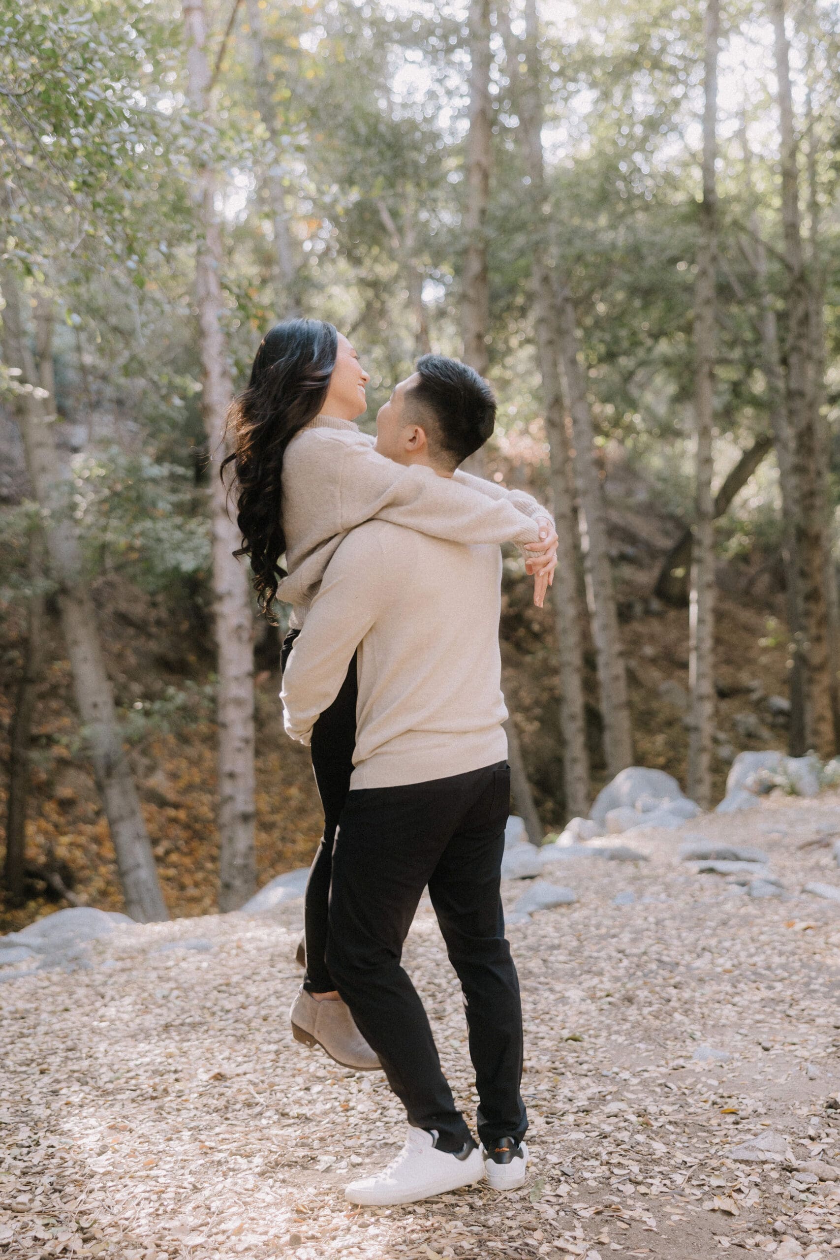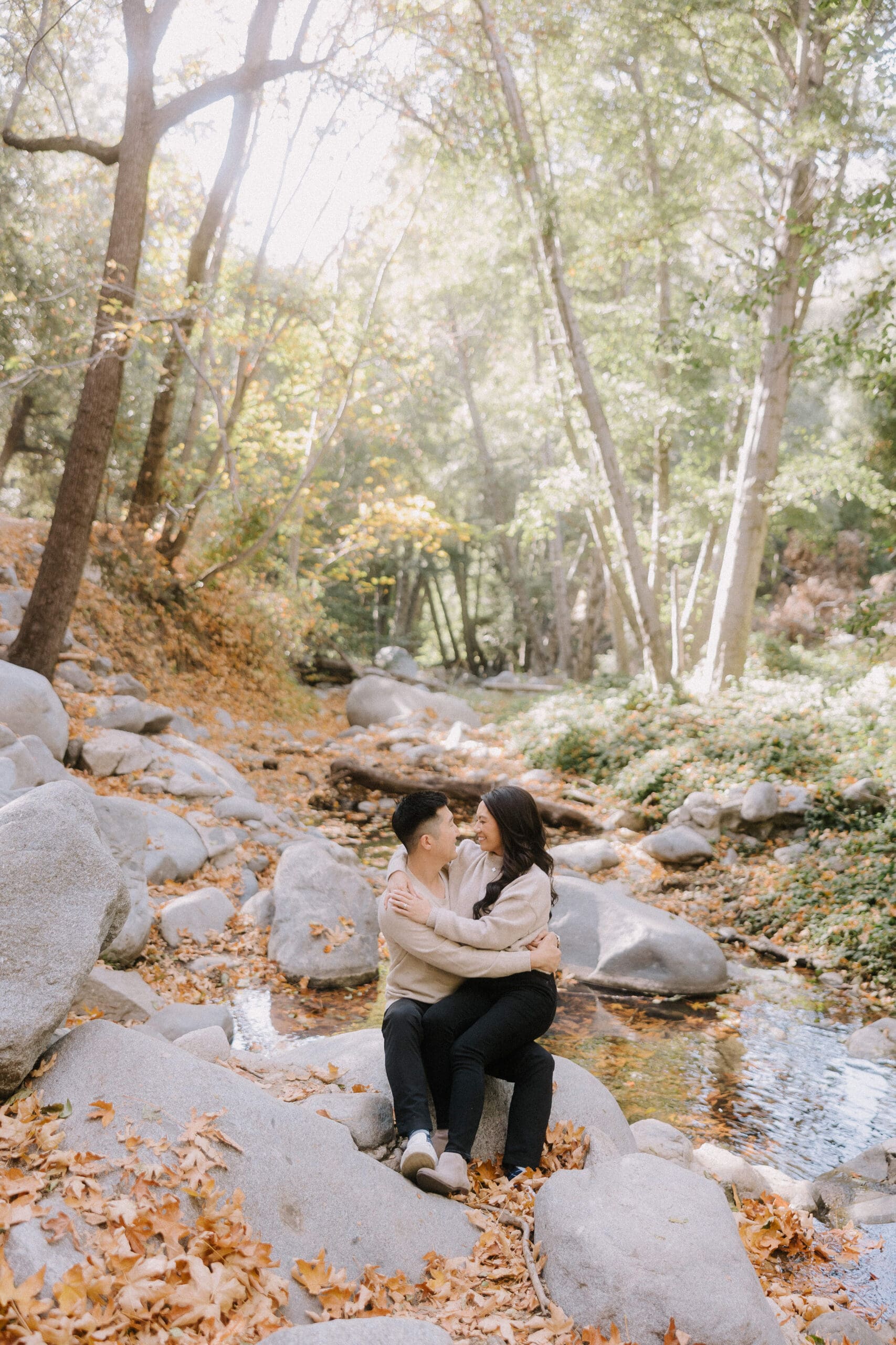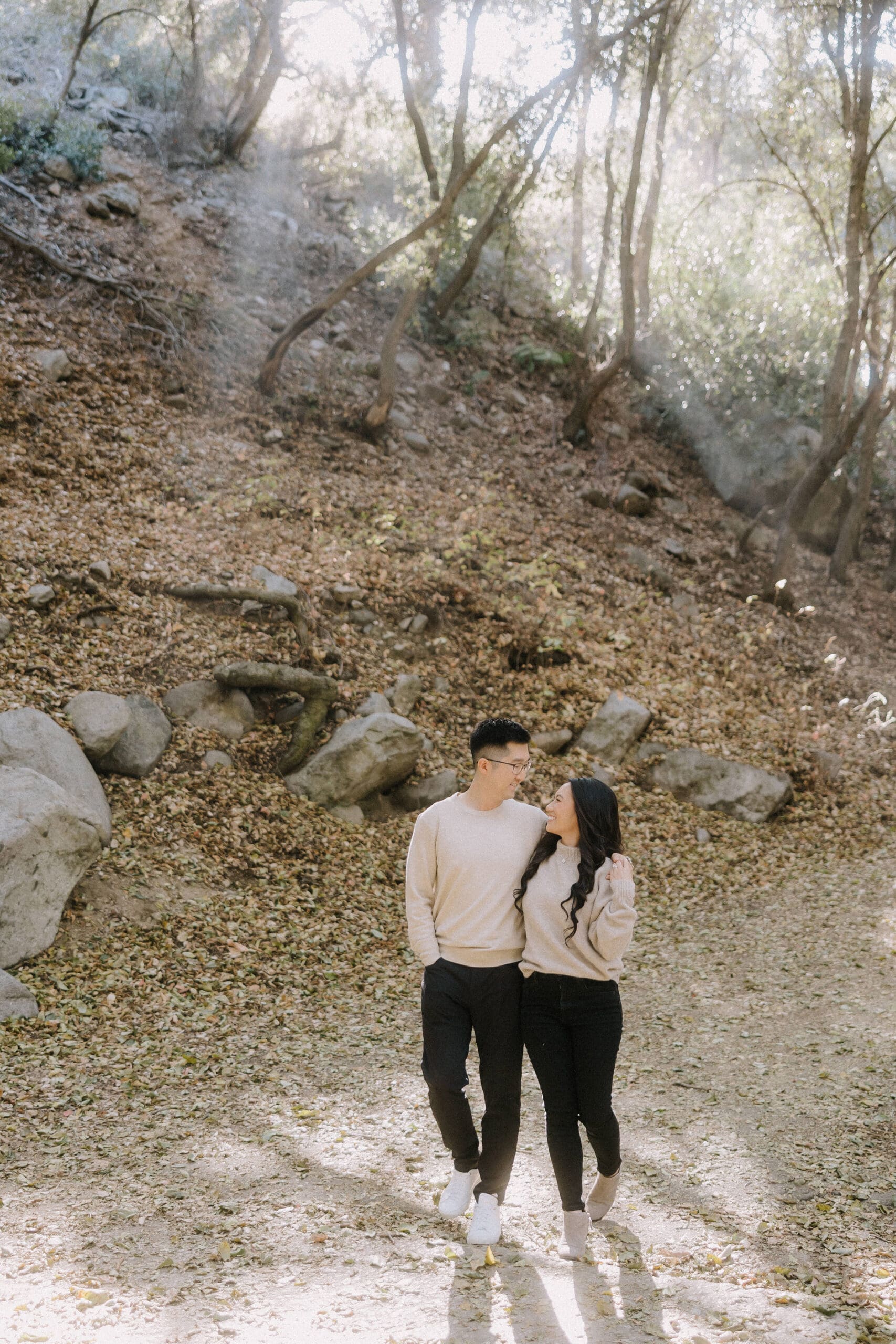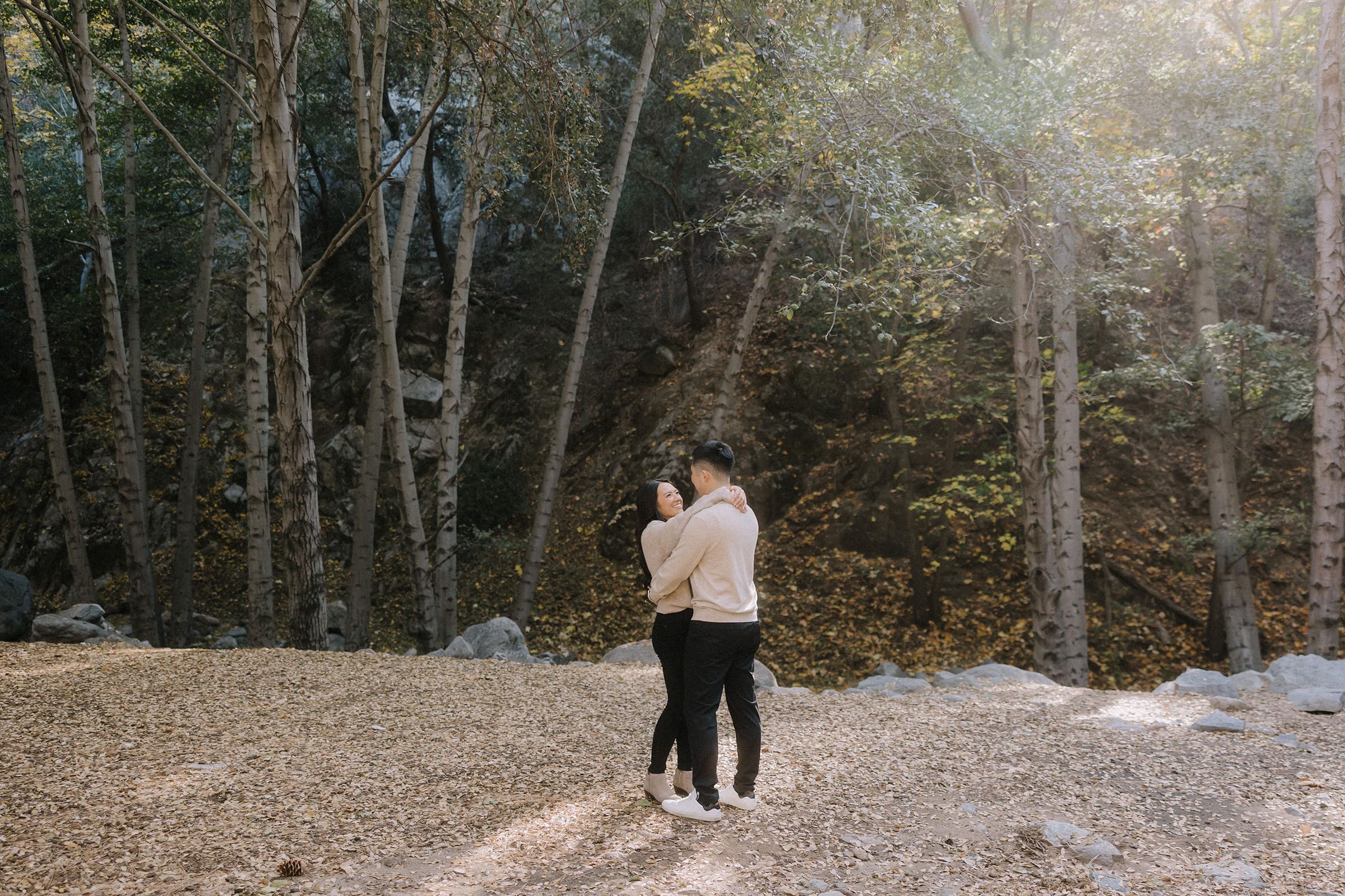 The day started in the heart of Angeles Forest, where the woodsy landscape provided a naturesque setting that felt like a dream. Towering trees displayed a palette of vibrant greens, golden yellows, and deep browns, creating a cozy atmosphere ideal for intimate moments. Alisa and Simon bundled up in soft sweaters, sharing laughs and tender glances amid the forest’s serene beauty.