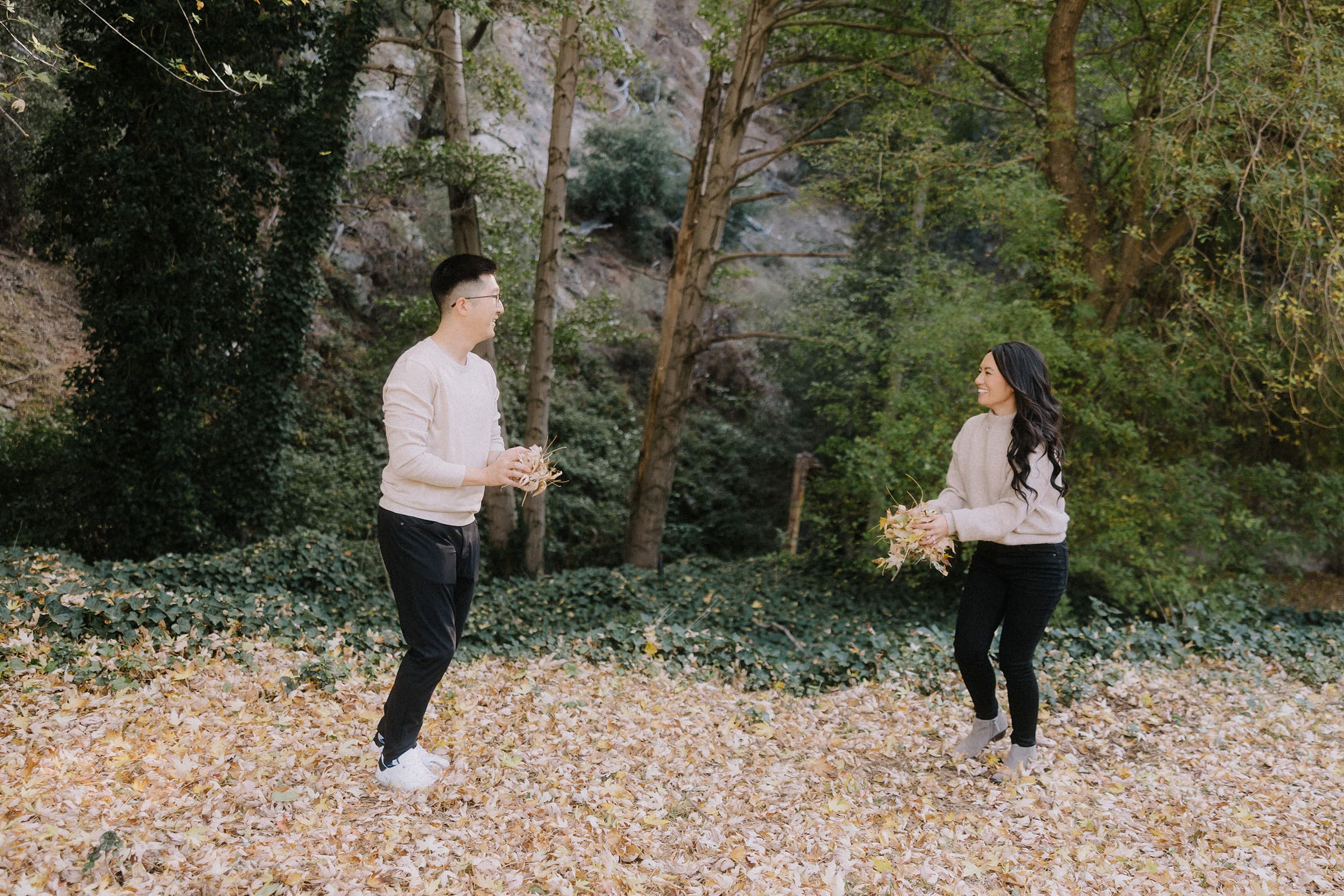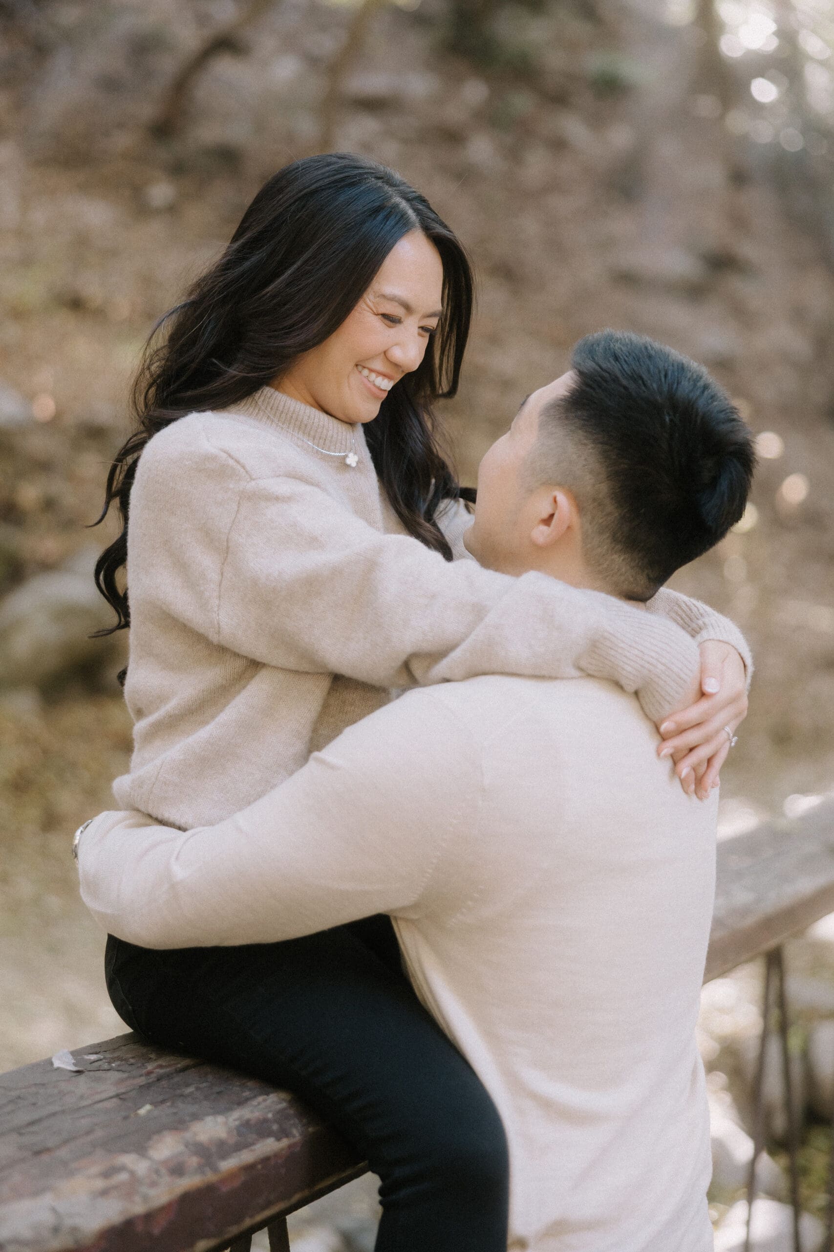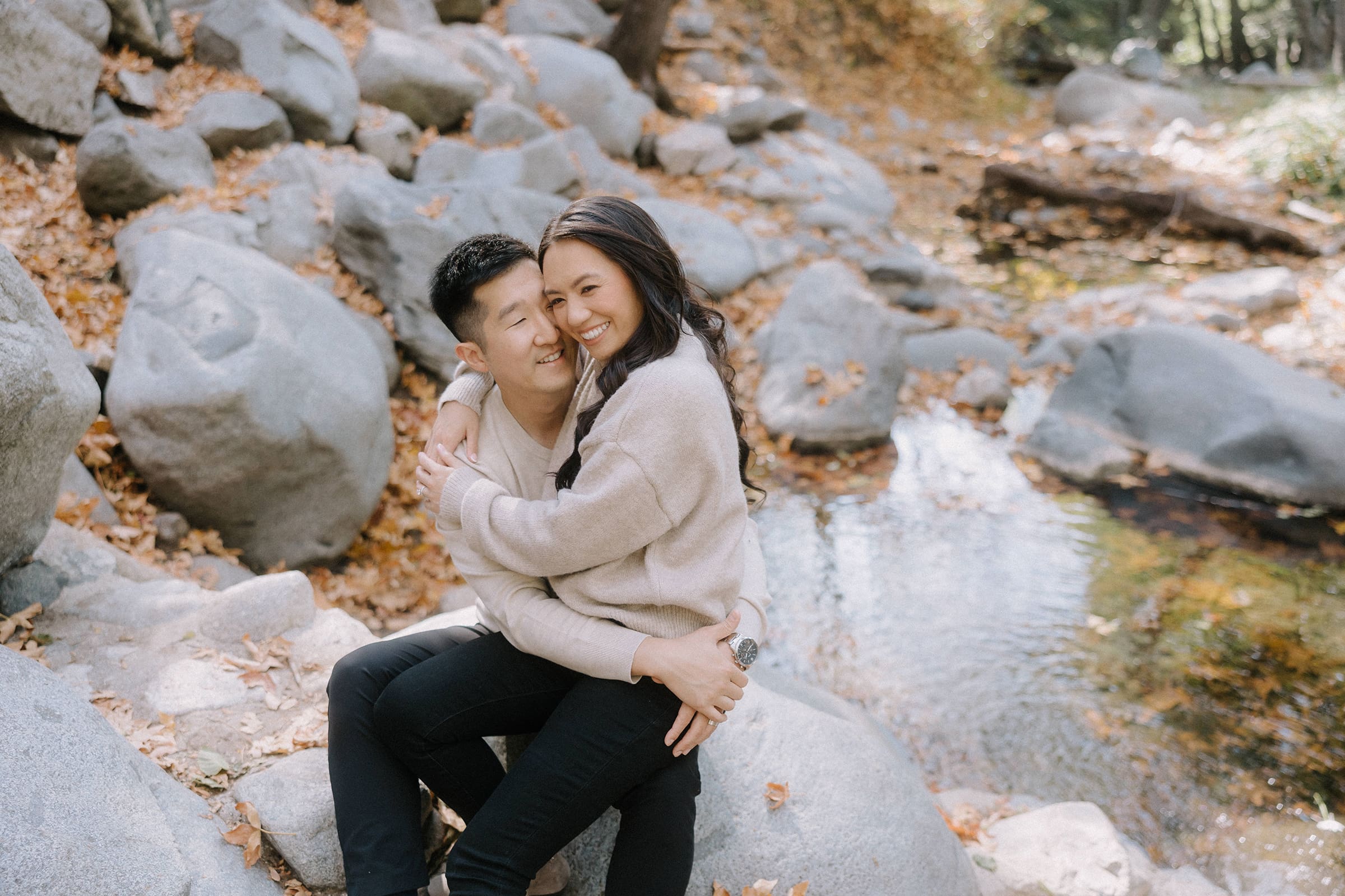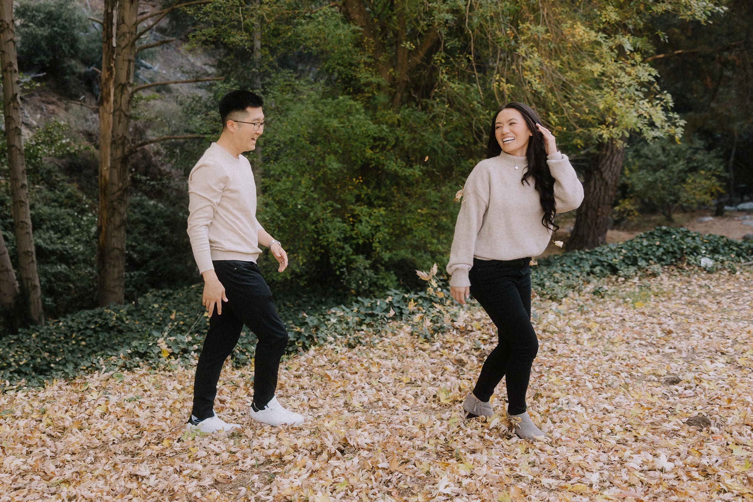 The day started in the heart of Angeles Forest, where the woodsy landscape provided a naturesque setting that felt like a dream. Towering trees displayed a palette of vibrant greens, golden yellows, and deep browns, creating a cozy atmosphere ideal for intimate moments. Alisa and Simon bundled up in soft sweaters, sharing laughs and tender glances amid the forest’s serene beauty.
