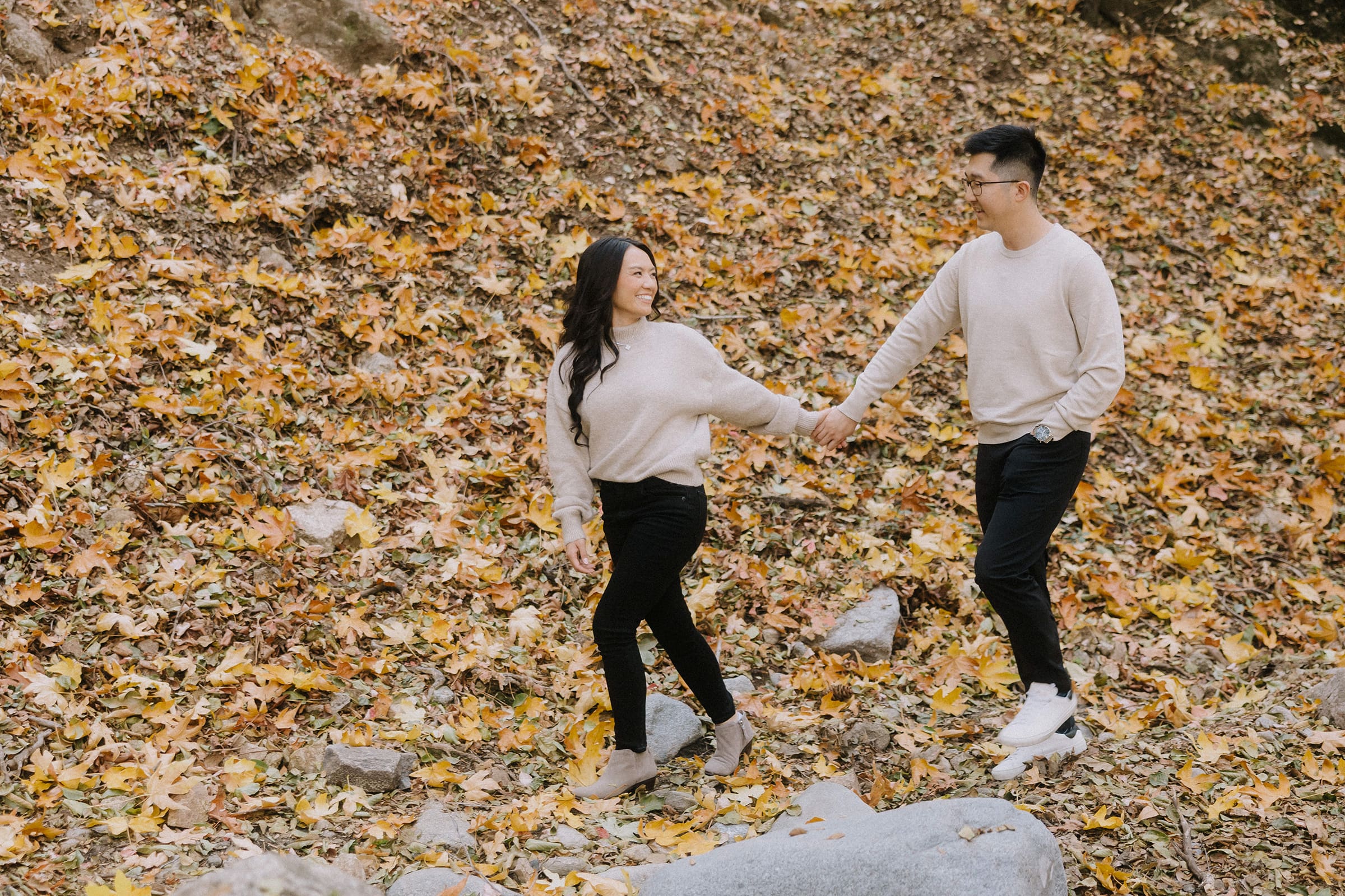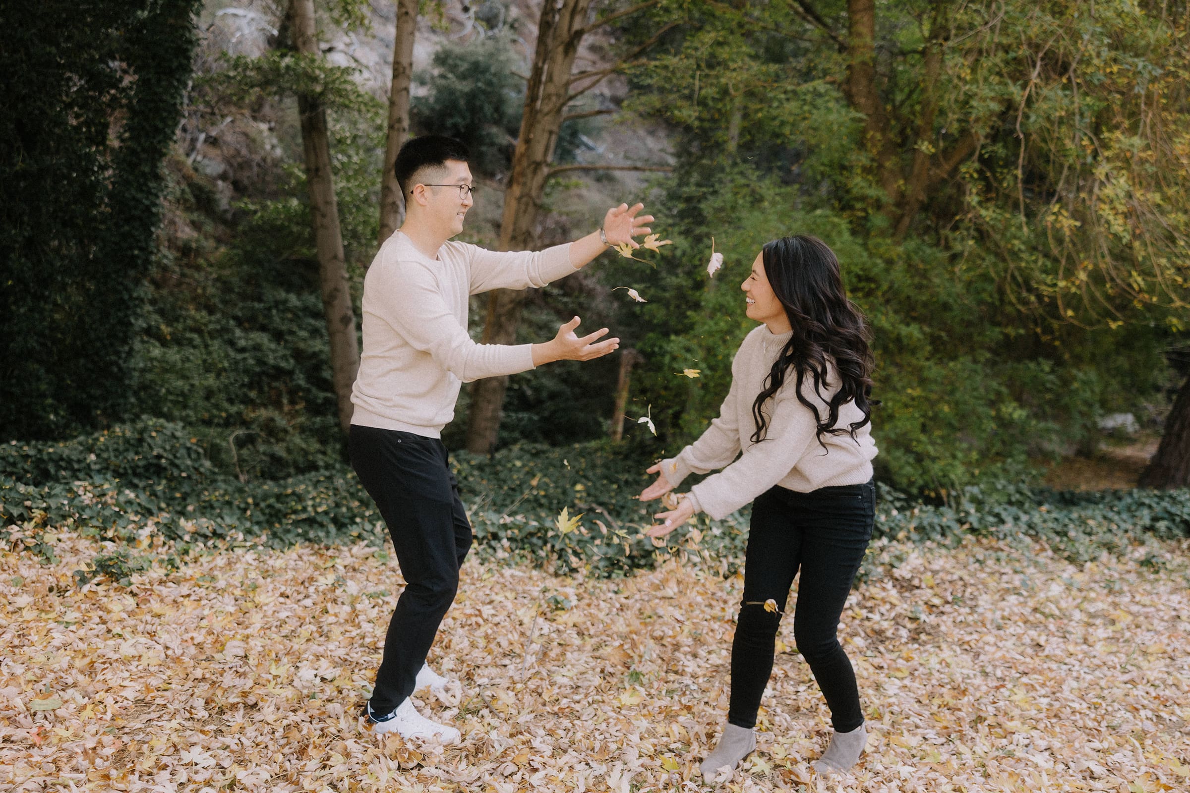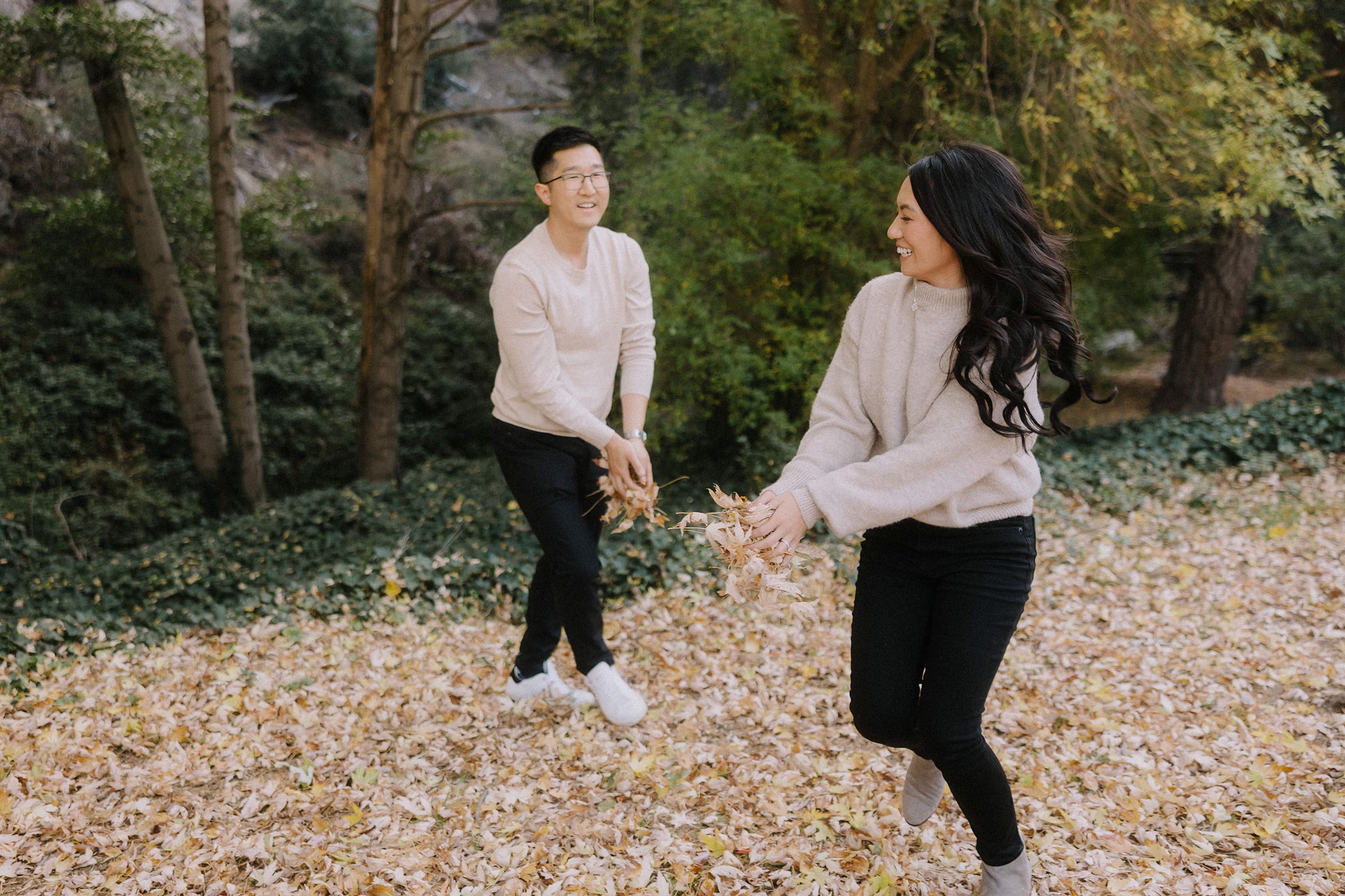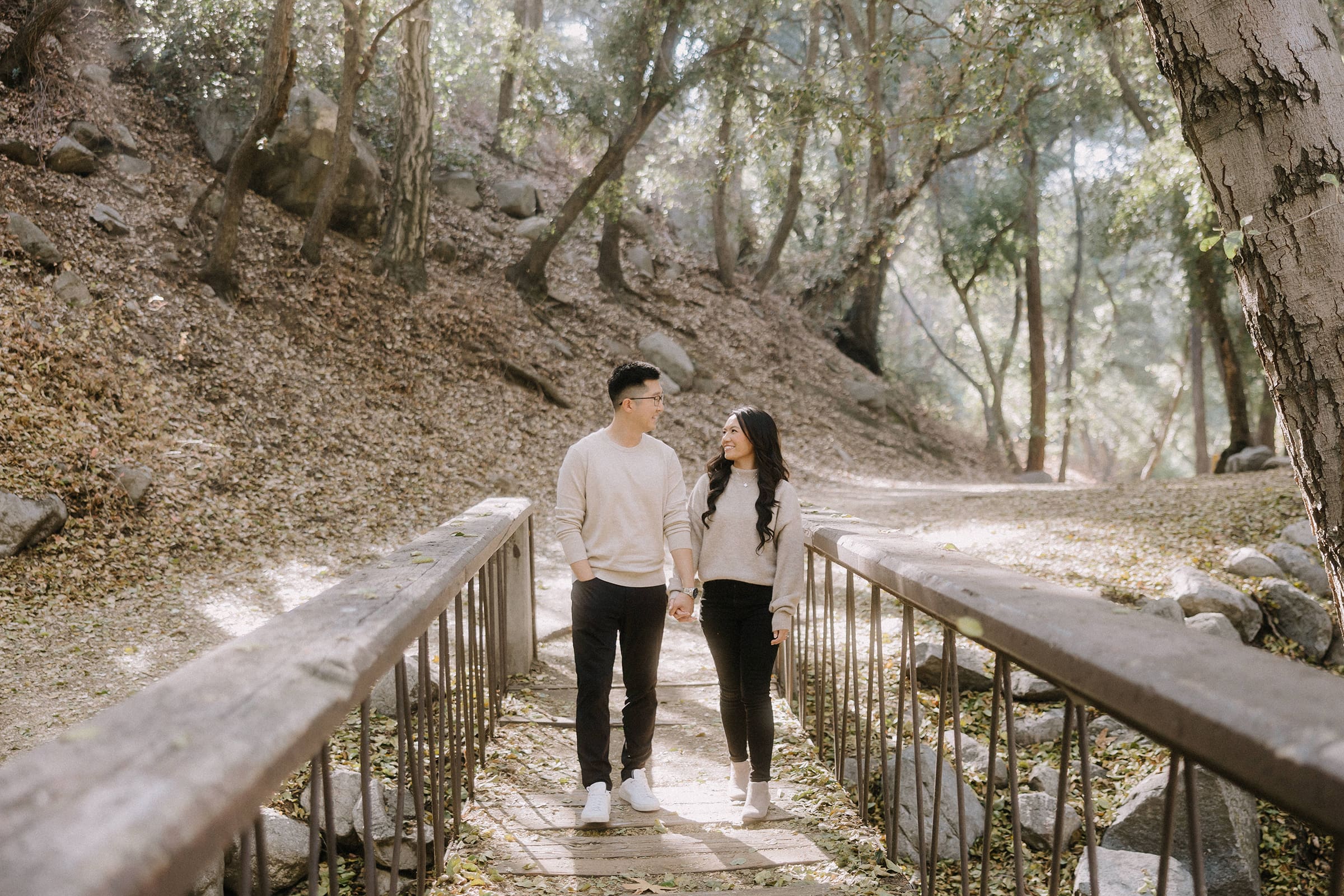 The day started in the heart of Angeles Forest, where the woodsy landscape provided a naturesque setting that felt like a dream. Towering trees displayed a palette of vibrant greens, golden yellows, and deep browns, creating a cozy atmosphere ideal for intimate moments. Alisa and Simon bundled up in soft sweaters, sharing laughs and tender glances amid the forest’s serene beauty.