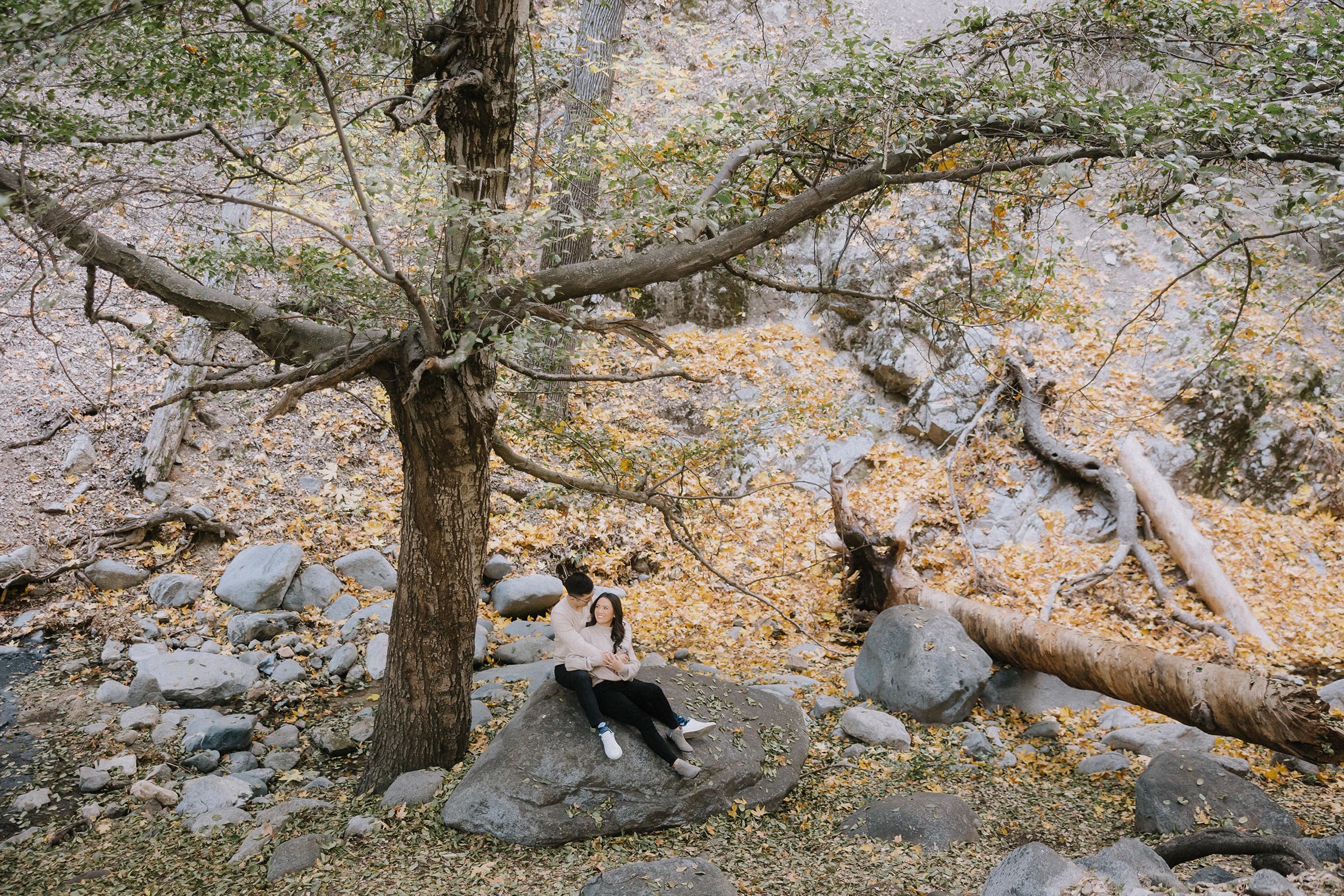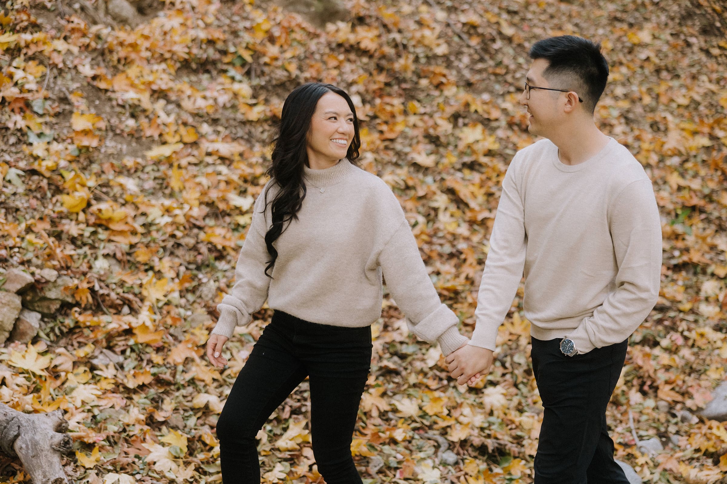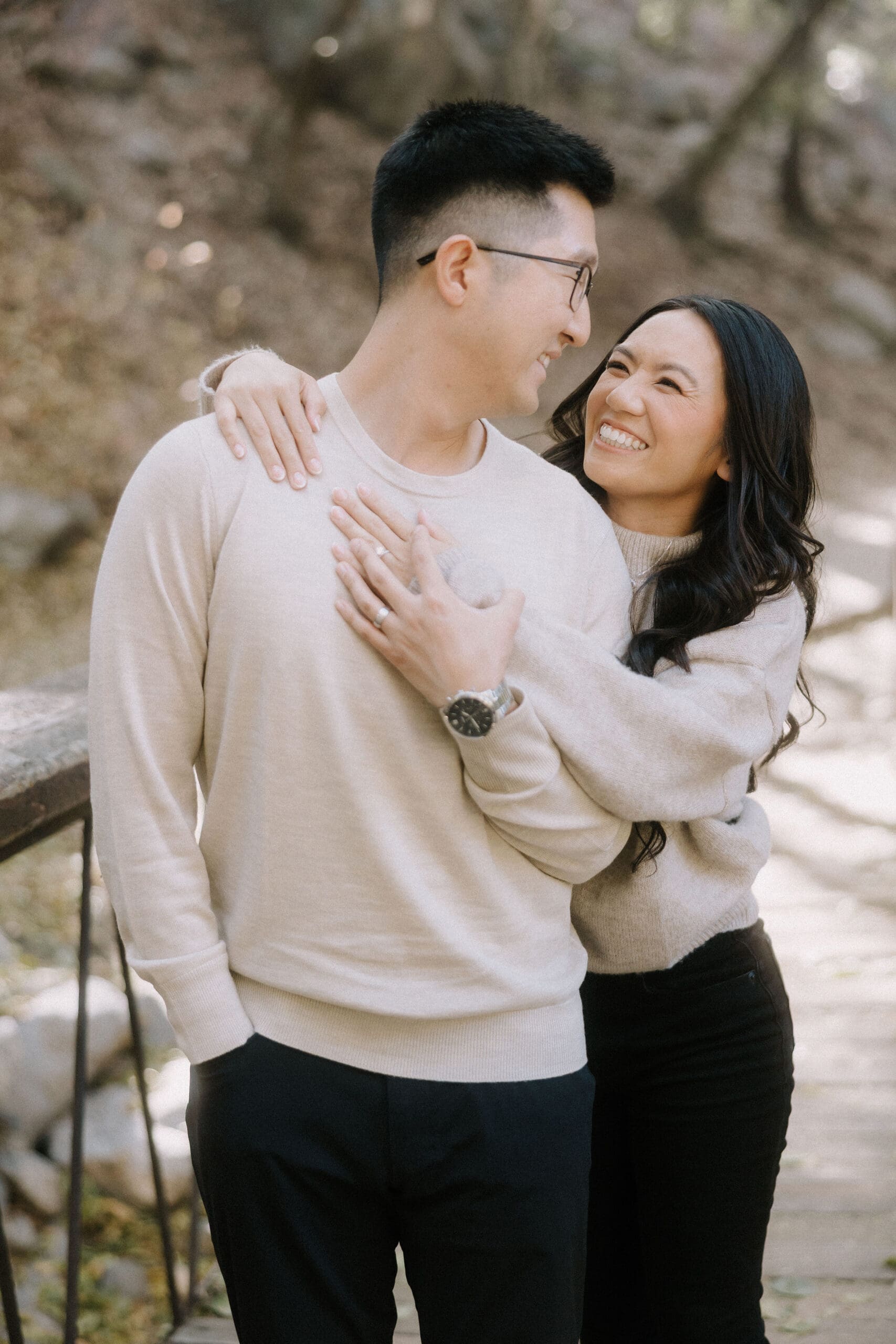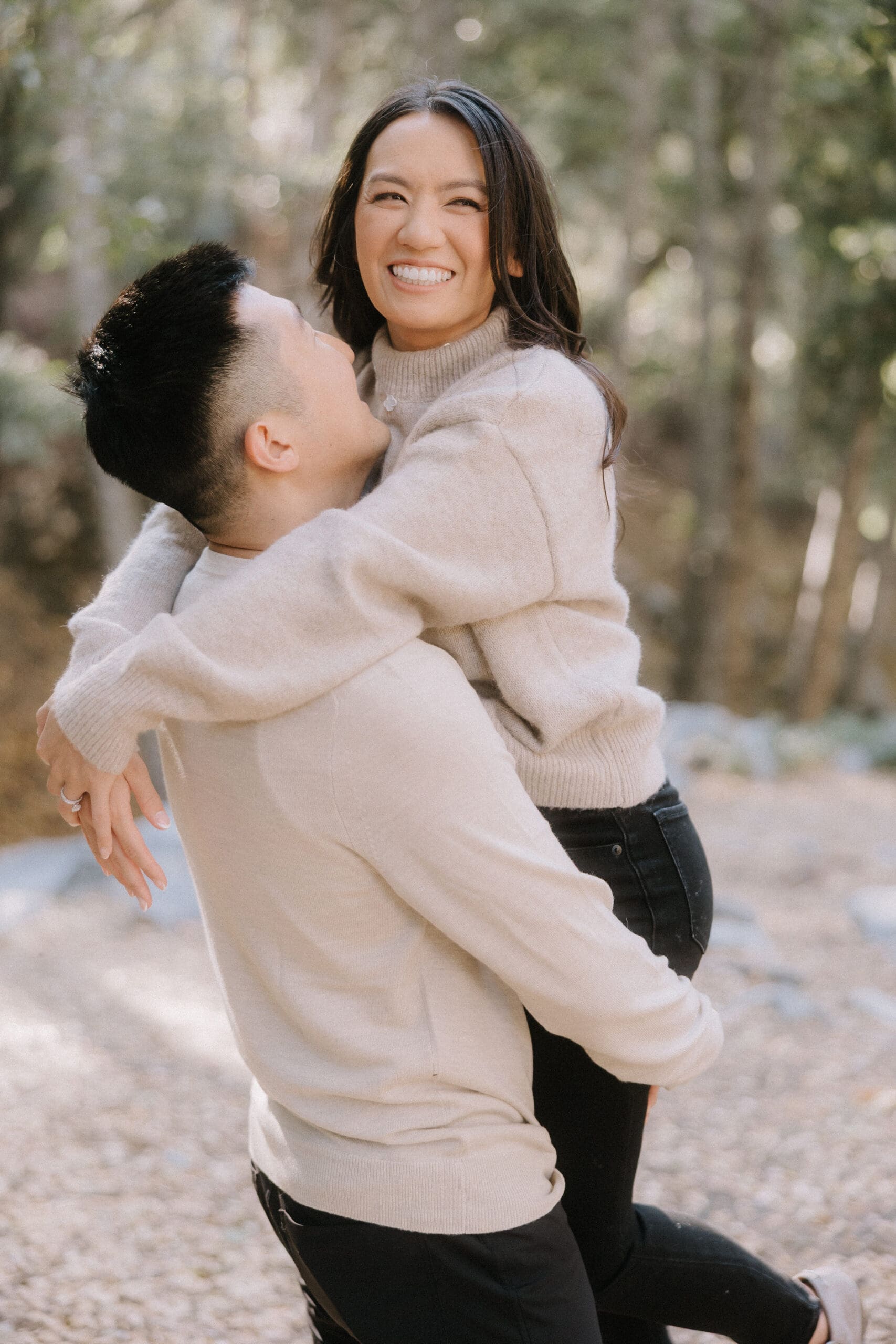 The day started in the heart of Angeles Forest, where the woodsy landscape provided a naturesque setting that felt like a dream. Towering trees displayed a palette of vibrant greens, golden yellows, and deep browns, creating a cozy atmosphere ideal for intimate moments. Alisa and Simon bundled up in soft sweaters, sharing laughs and tender glances amid the forest’s serene beauty.