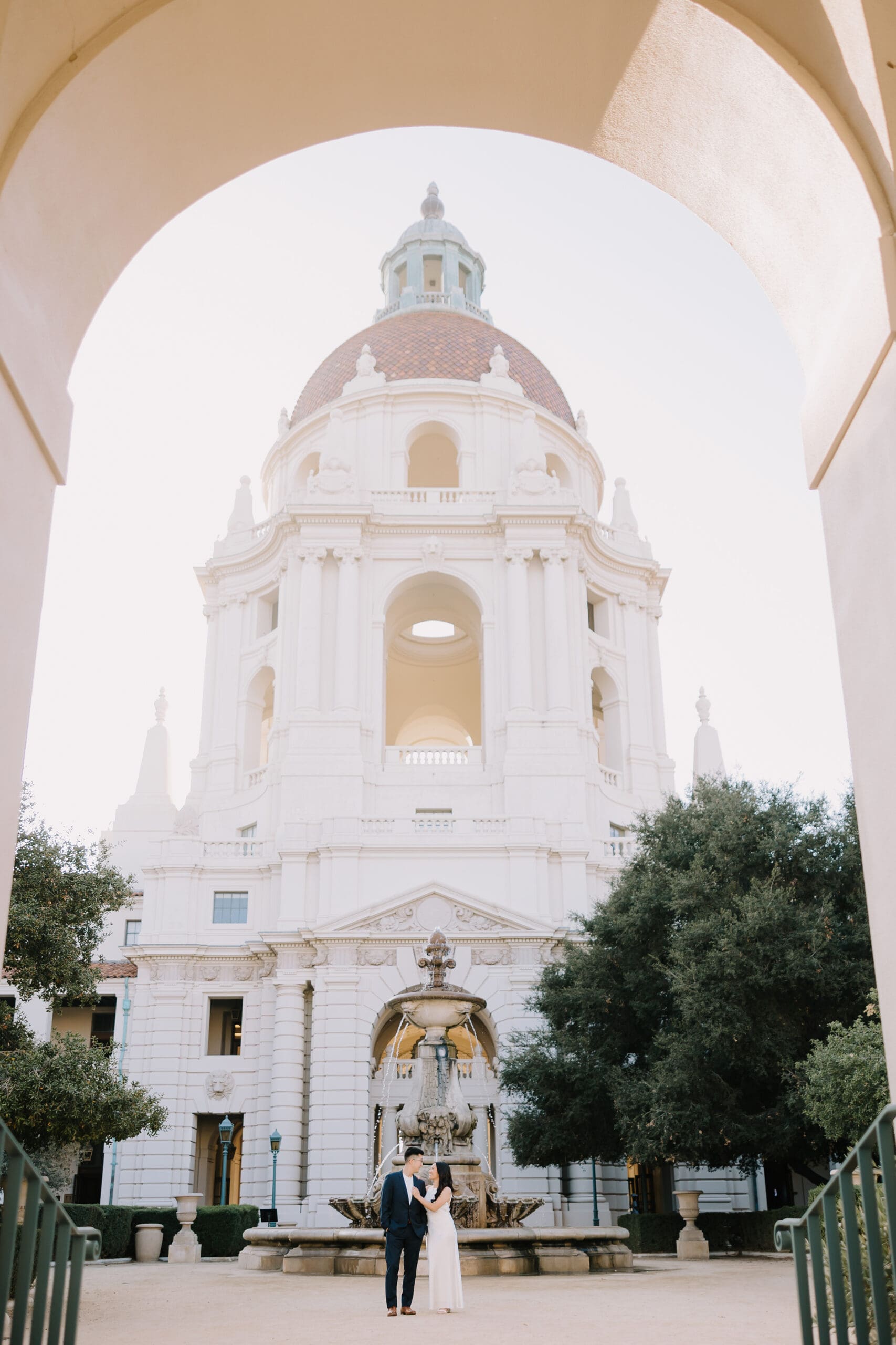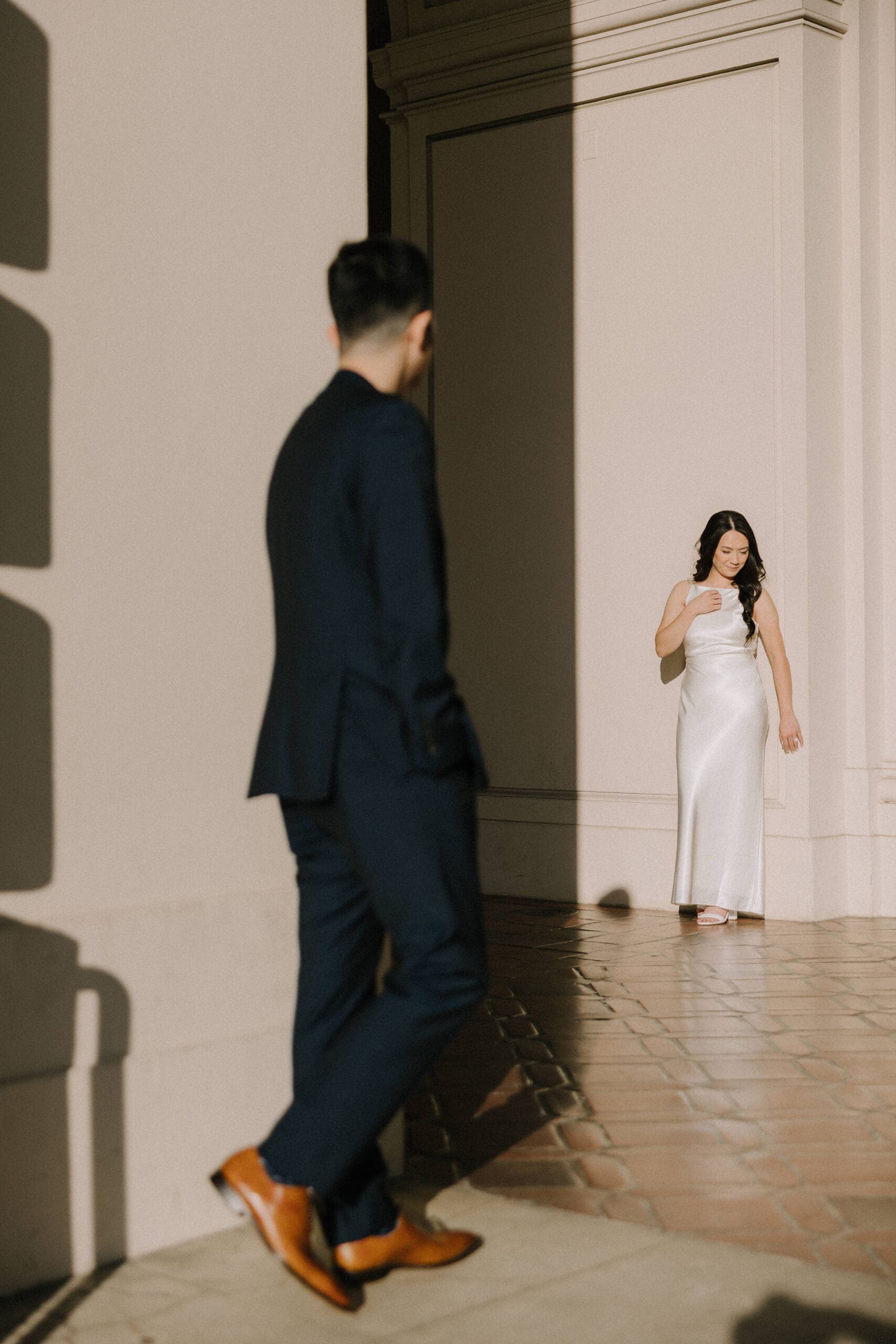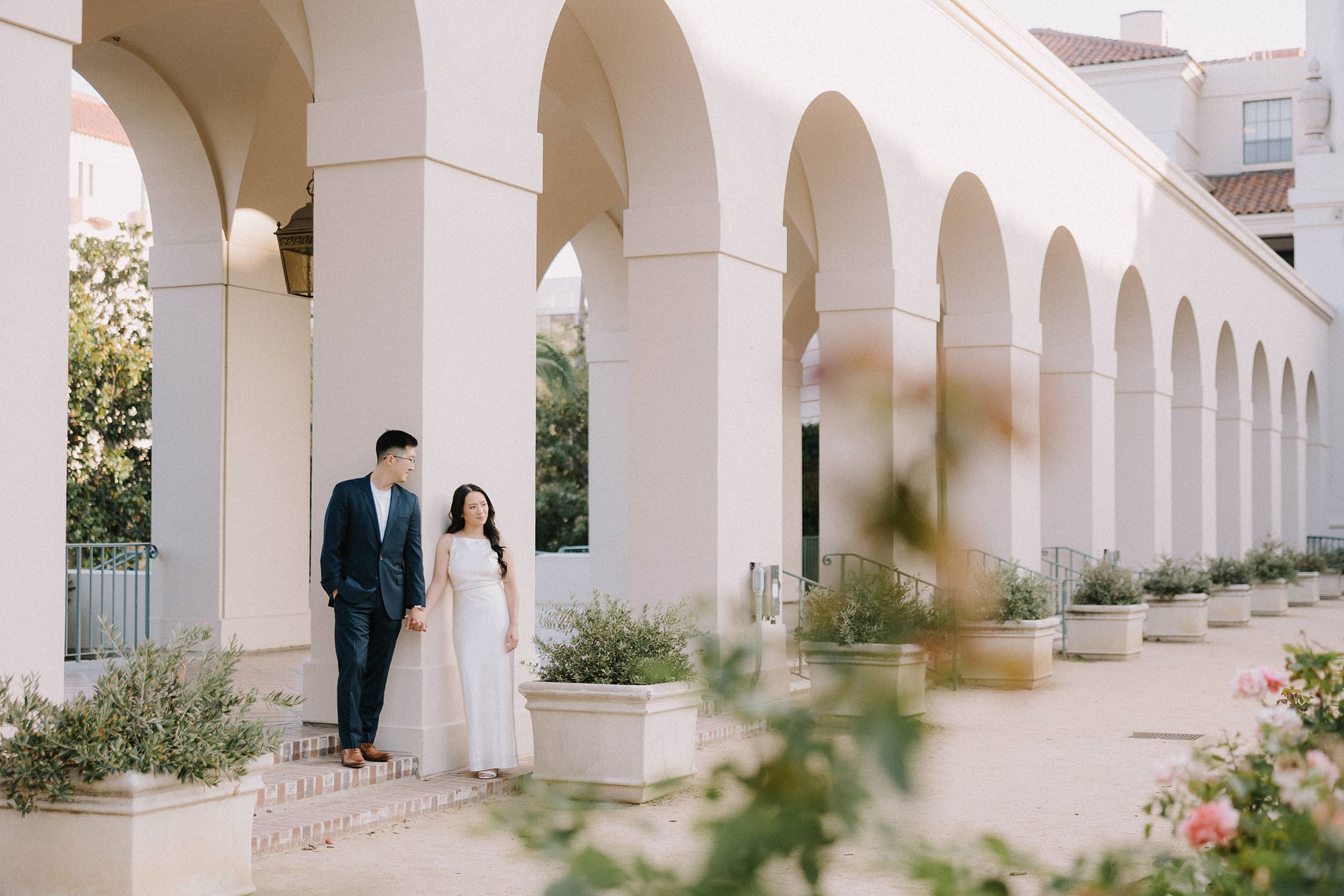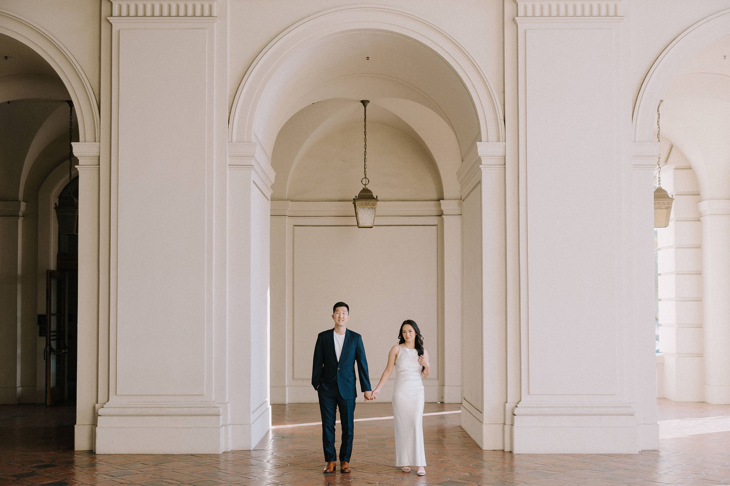 To add contrast and depth to their collection, we shifted gears and headed back to the city of Pasadena for a formal architectural segment. Juxtaposing the wild, organic feel of the forest with Pasadena’s refined structures created a balanced narrative. Think grand columns, historic buildings, and clean lines that complemented the couple’s sophisticated style.