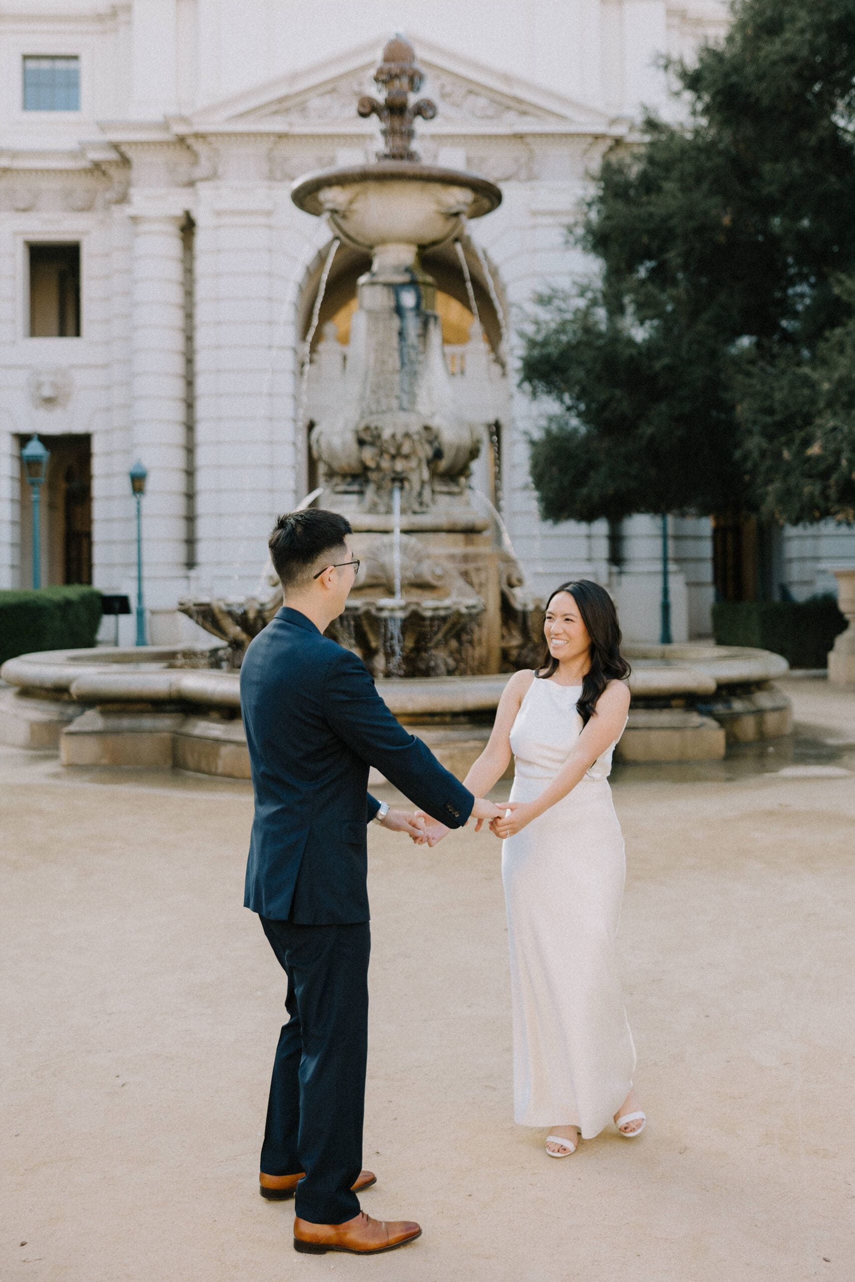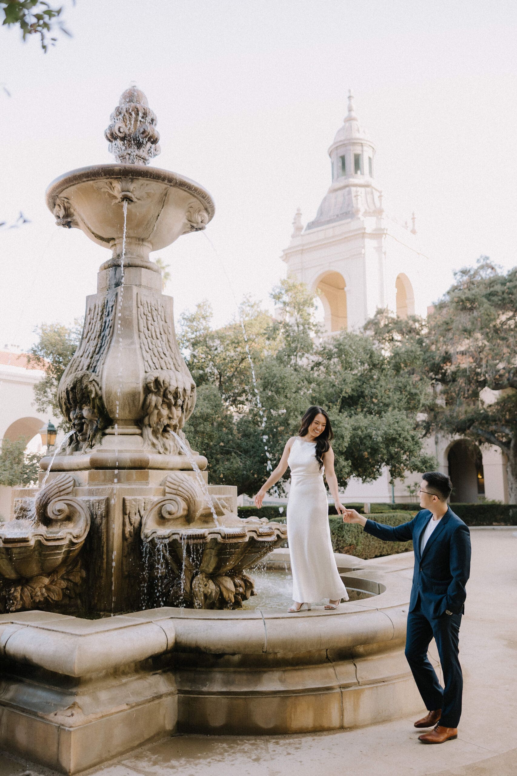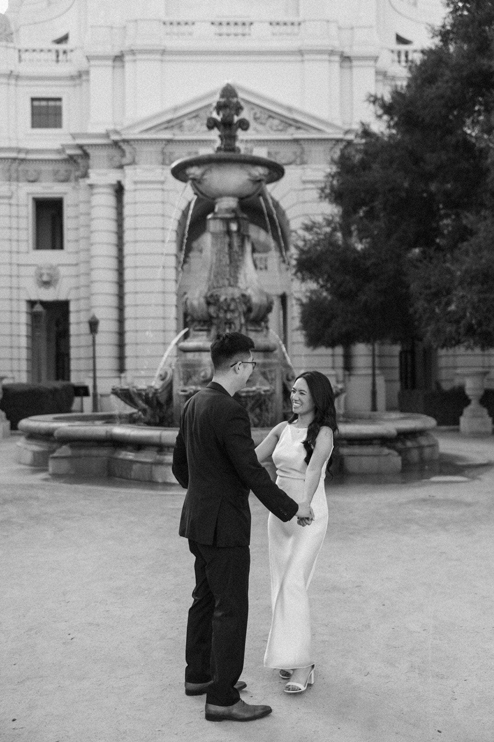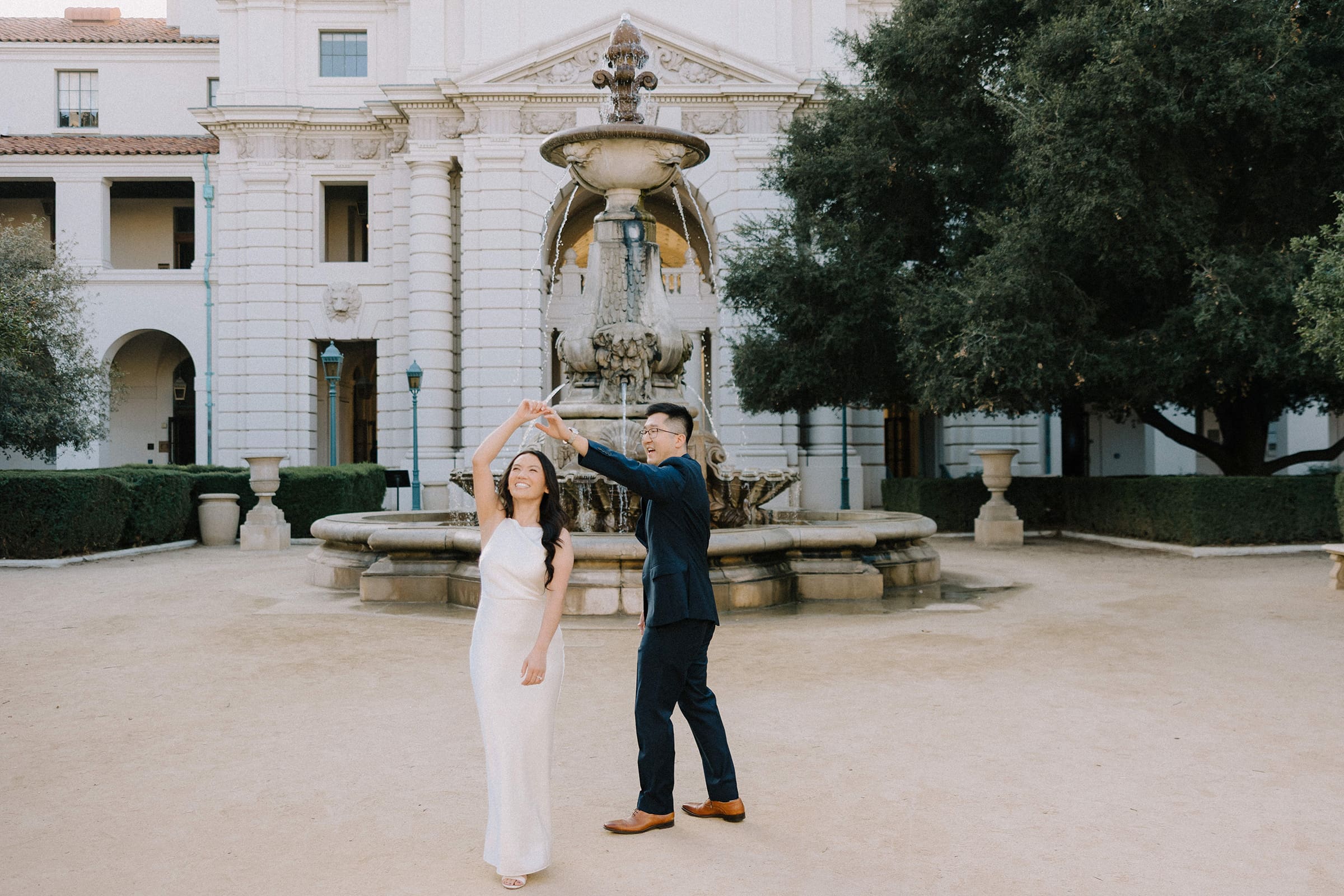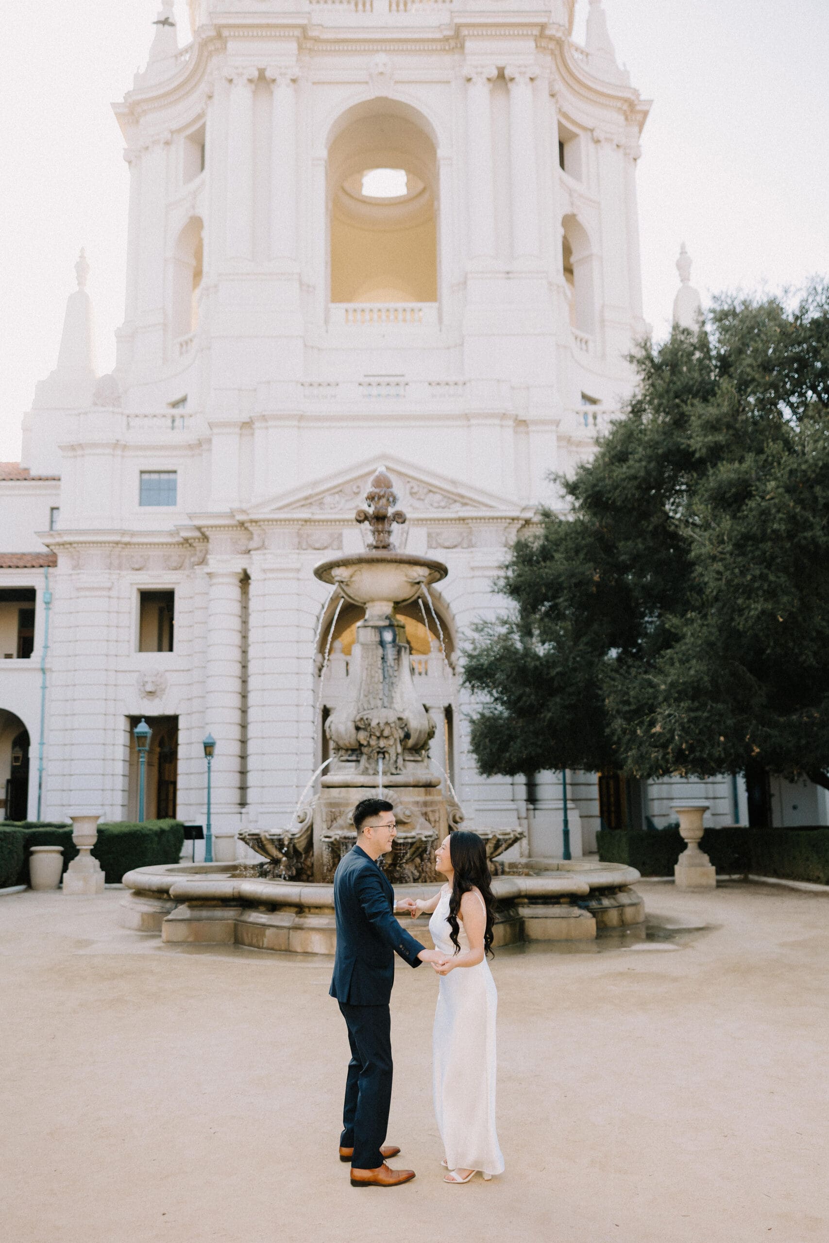 To add contrast and depth to their collection, we shifted gears and headed back to the city of Pasadena for a formal architectural segment. Juxtaposing the wild, organic feel of the forest with Pasadena’s refined structures created a balanced narrative. Think grand columns, historic buildings, and clean lines that complemented the couple’s sophisticated style.