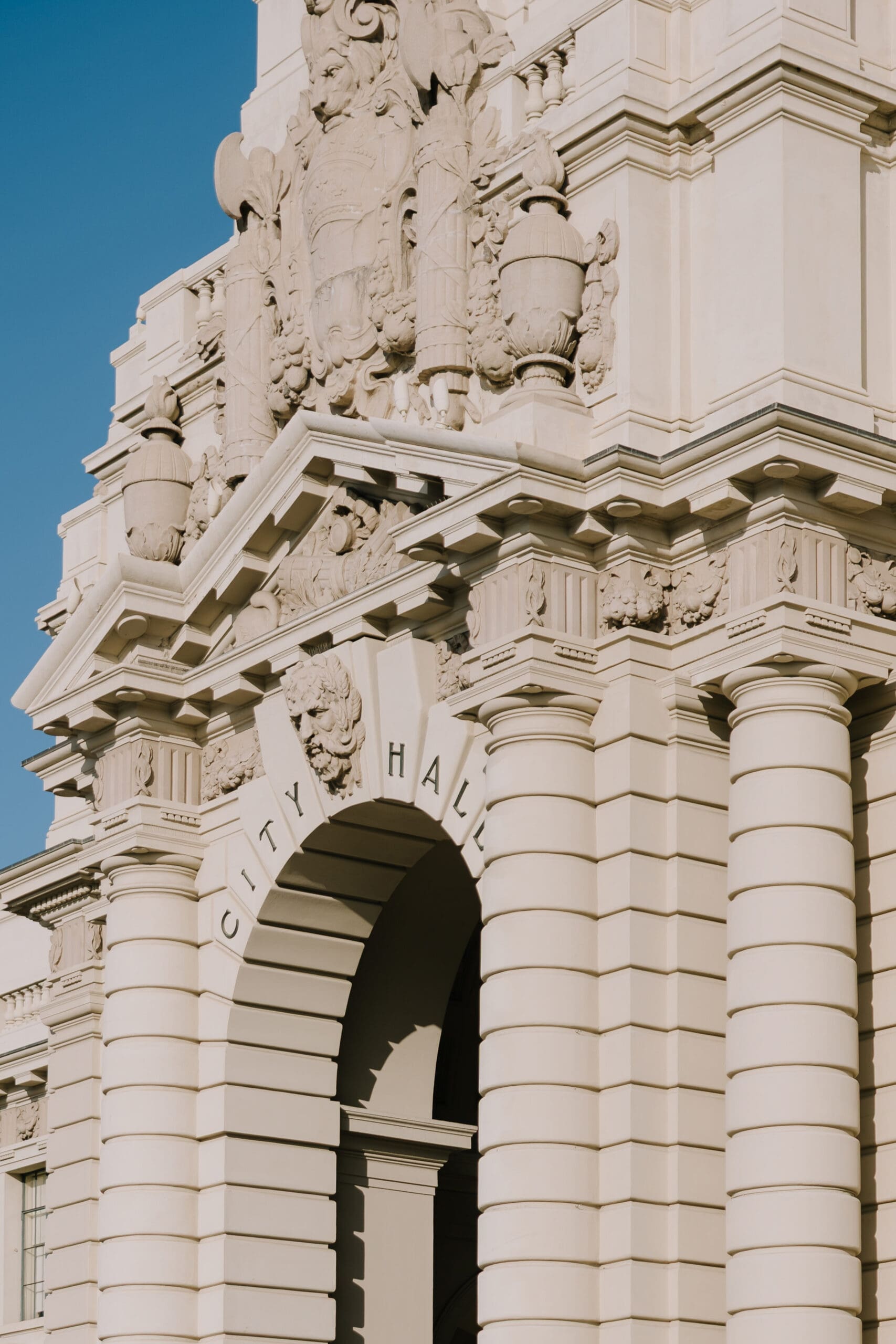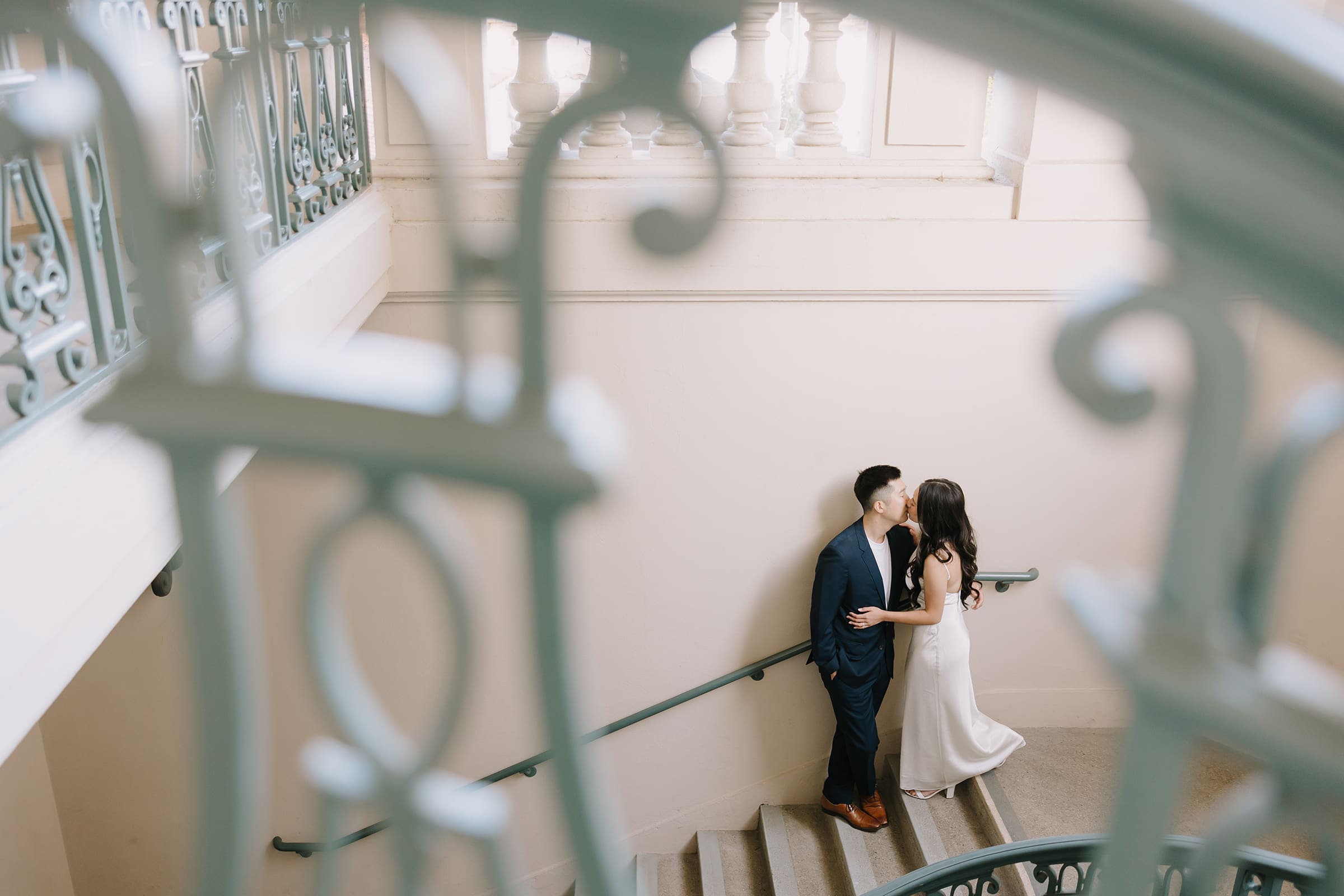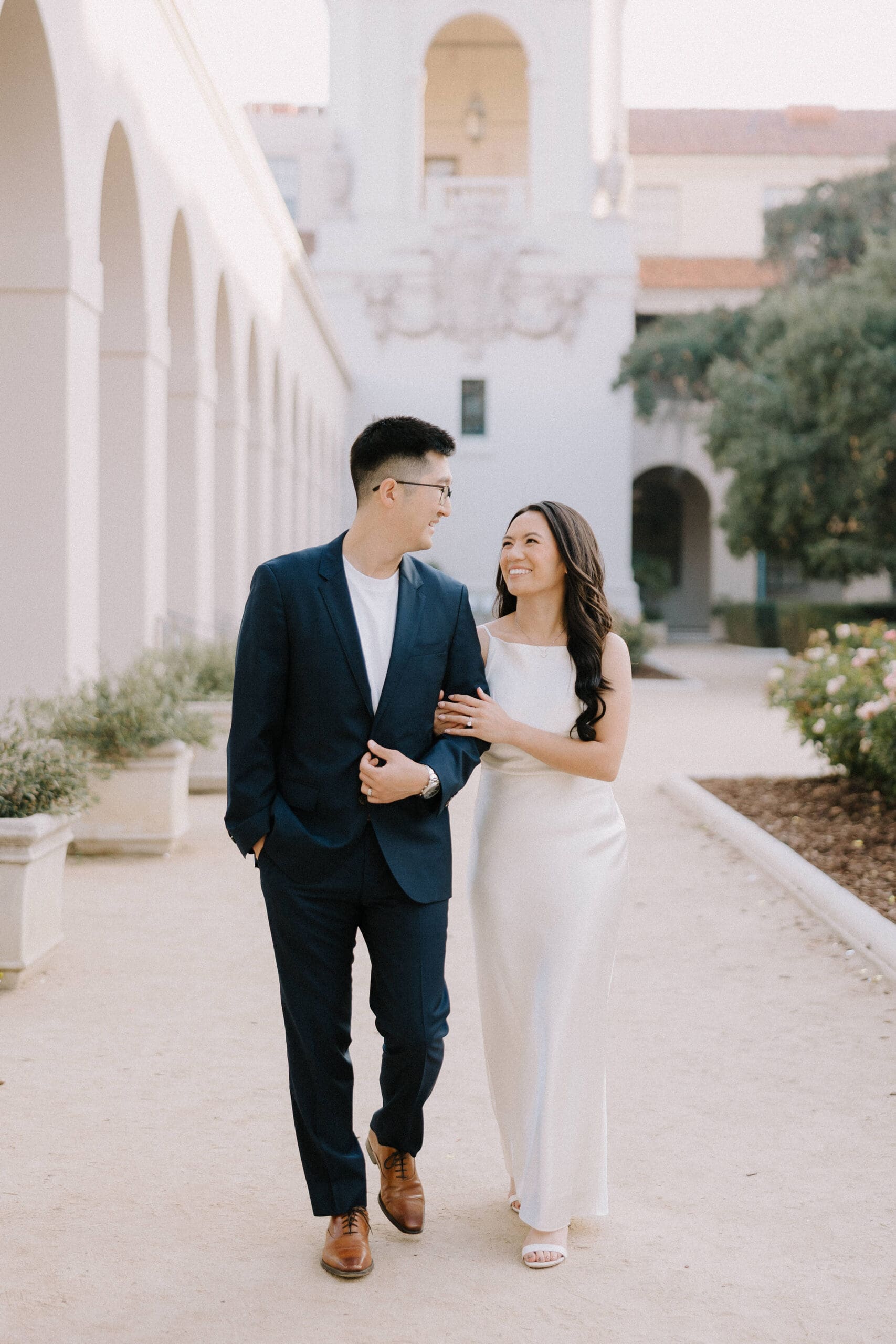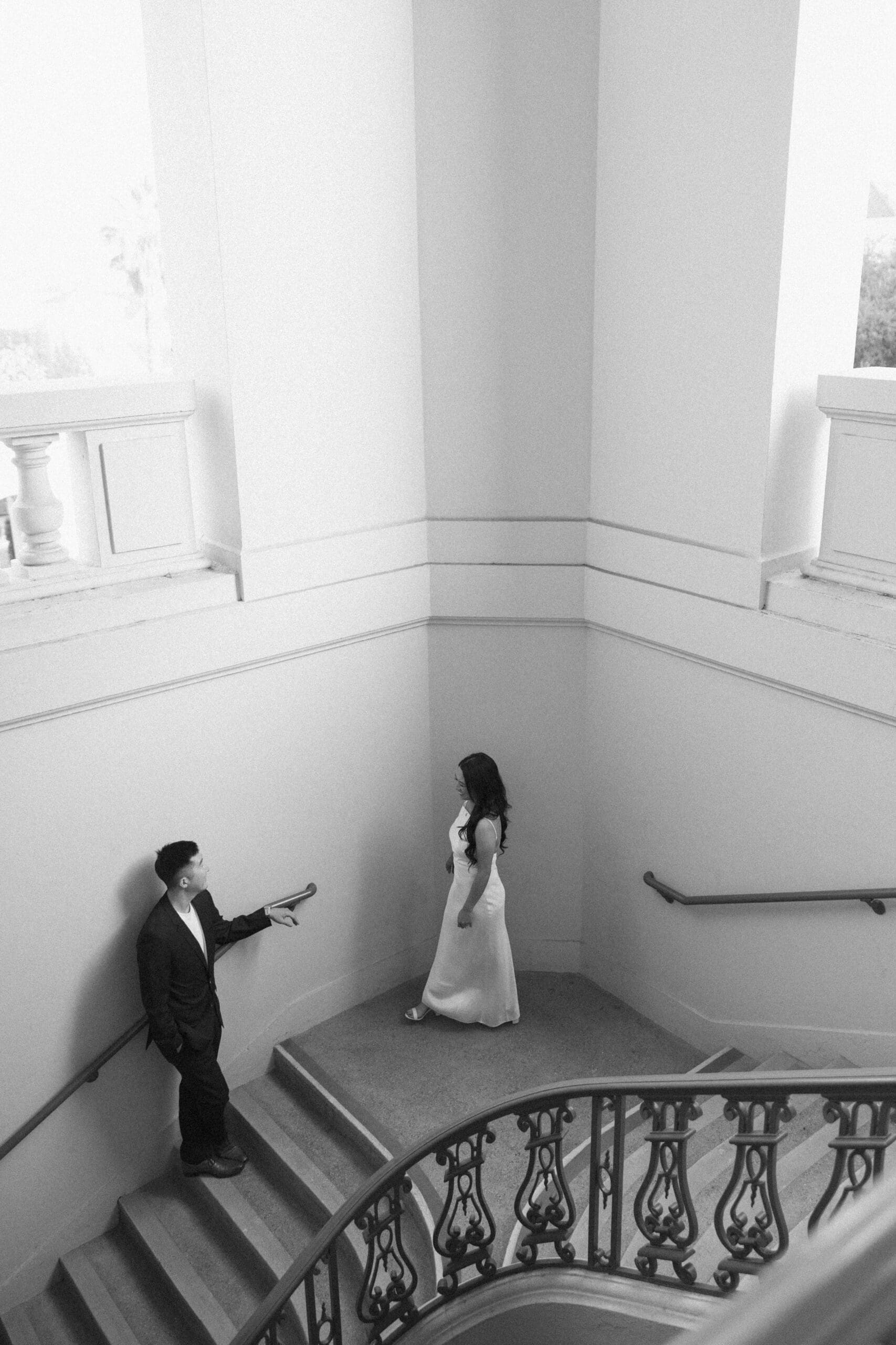 To add contrast and depth to their collection, we shifted gears and headed back to the city of Pasadena for a formal architectural segment. Juxtaposing the wild, organic feel of the forest with Pasadena’s refined structures created a balanced narrative. Think grand columns, historic buildings, and clean lines that complemented the couple’s sophisticated style.