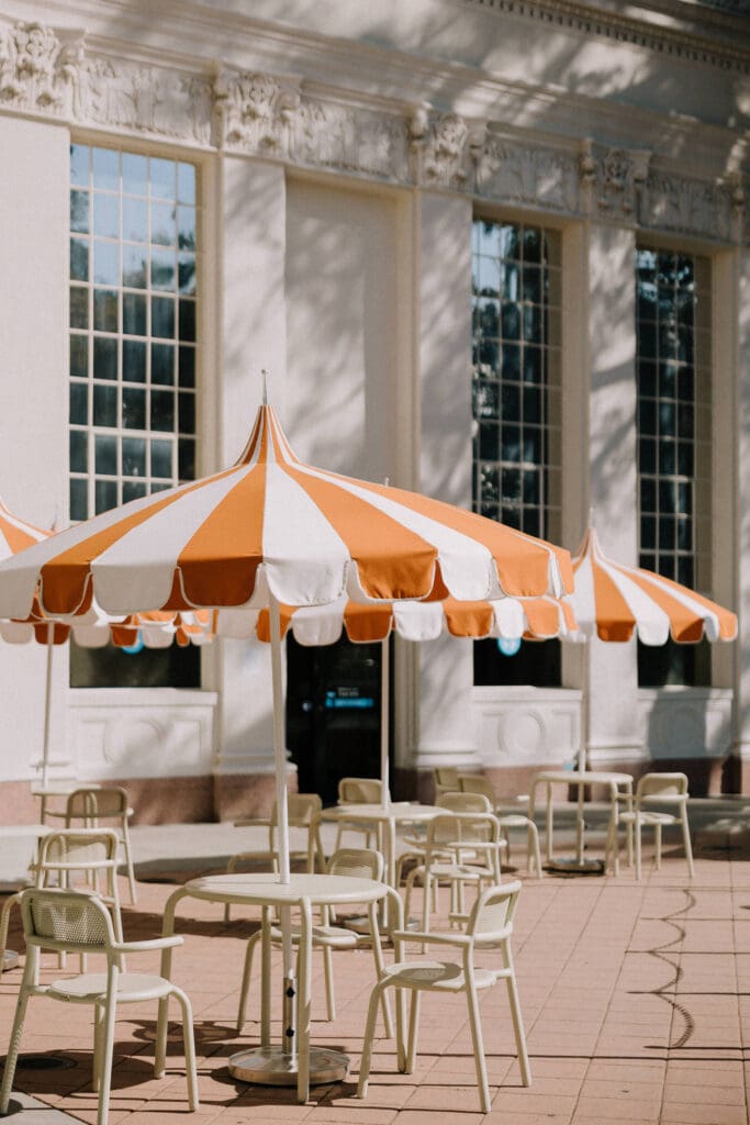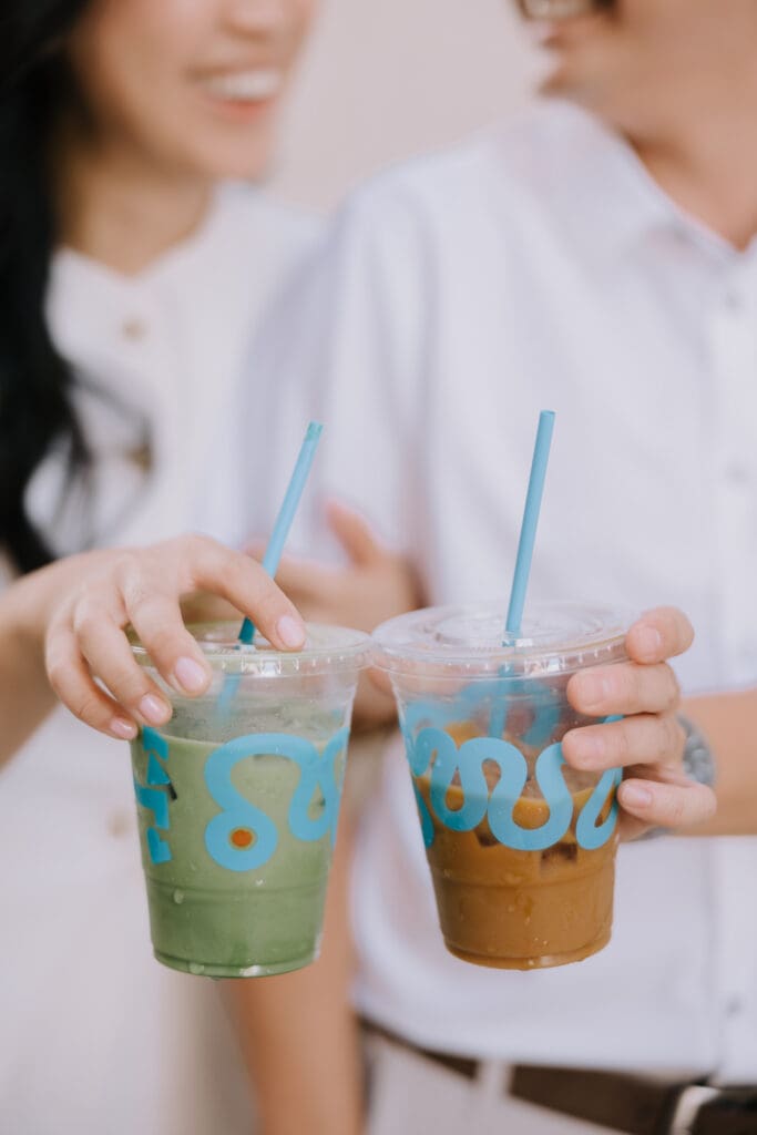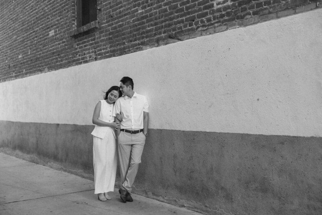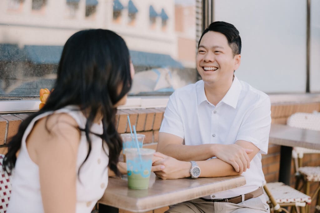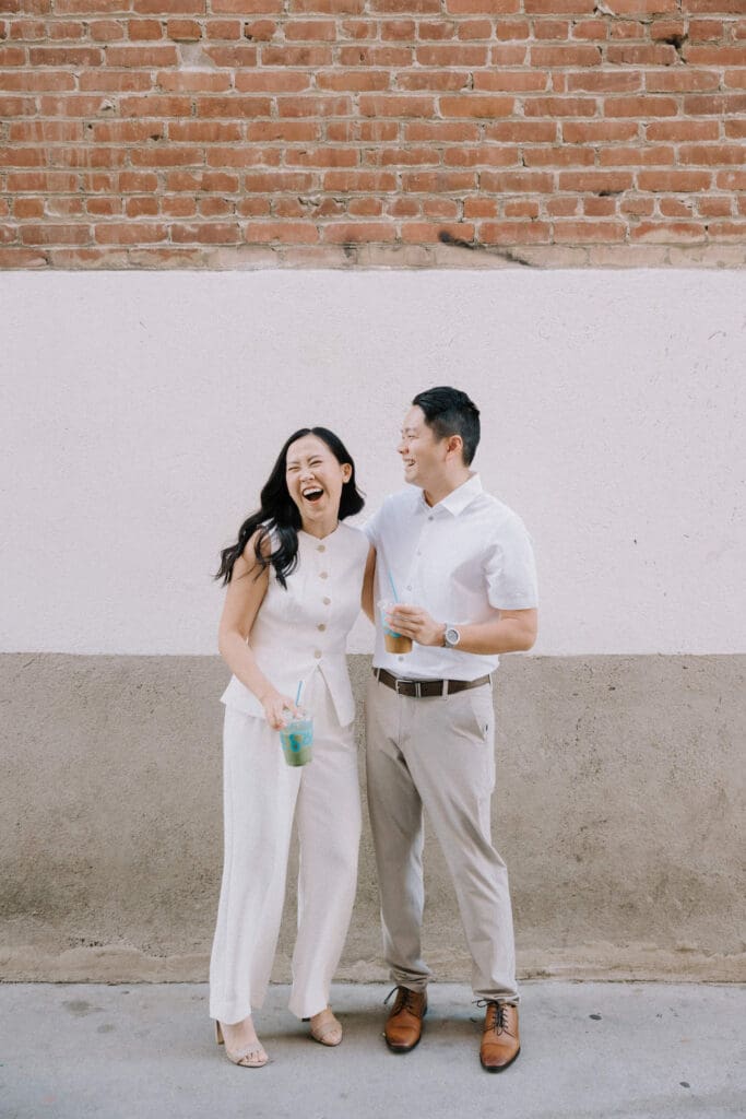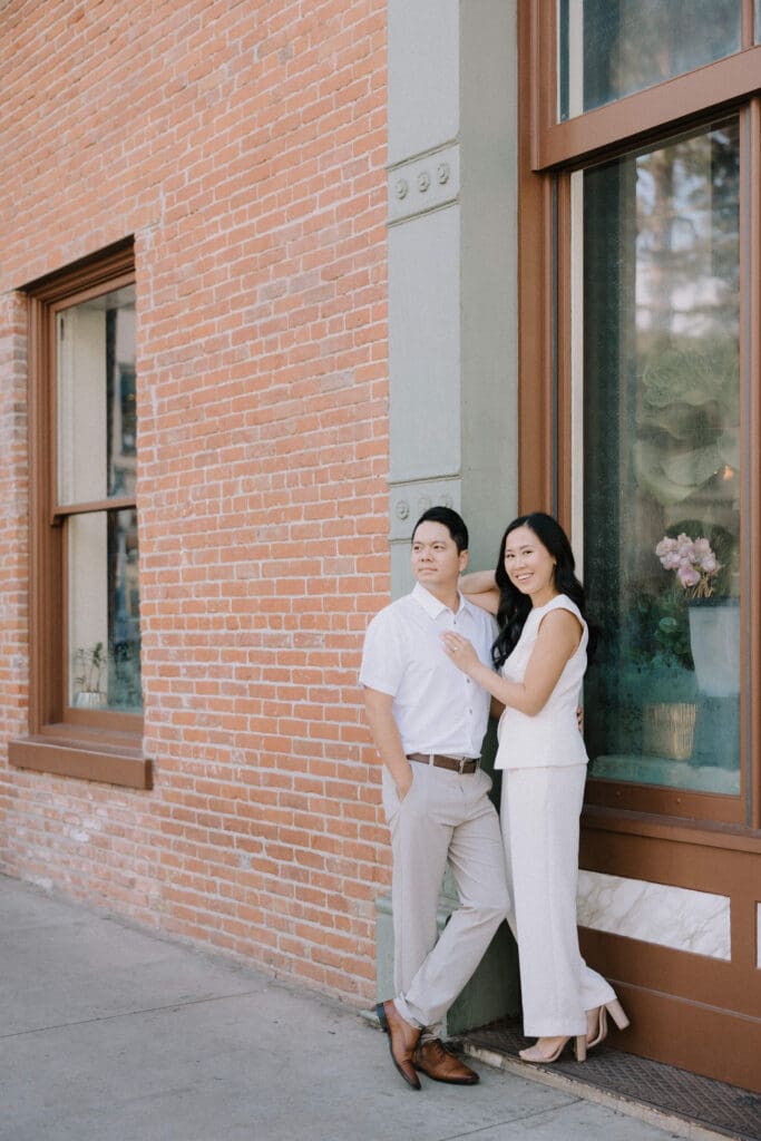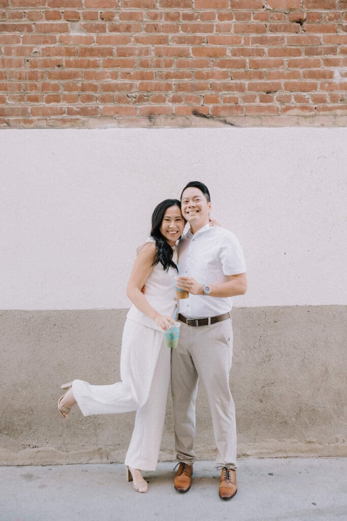 Thai and Minh started their day with a classic “date night” vibe—grabbing a warm sip of coffee and strolling past the vintage storefronts. The brick backdrops and mid-century aesthetic of the Orange Circle provided a warm, lived-in feel to their photos. It’s the perfect spot for couples who want their engagement photos to feel like a real-life Sunday morning.