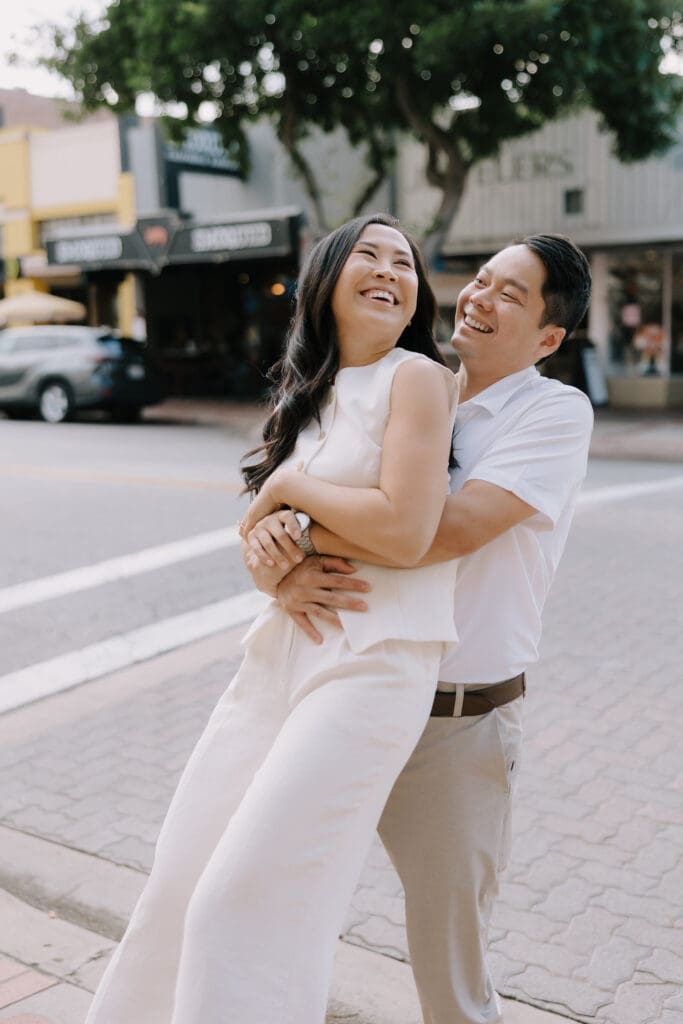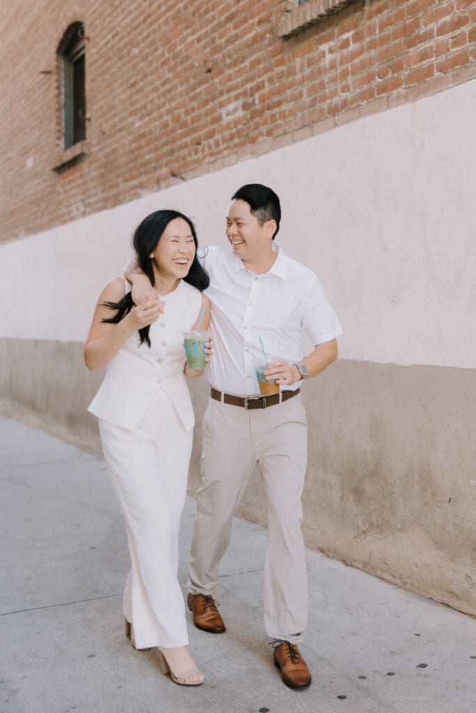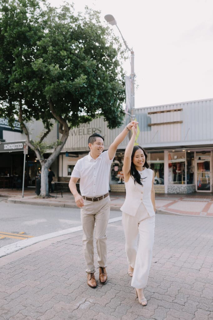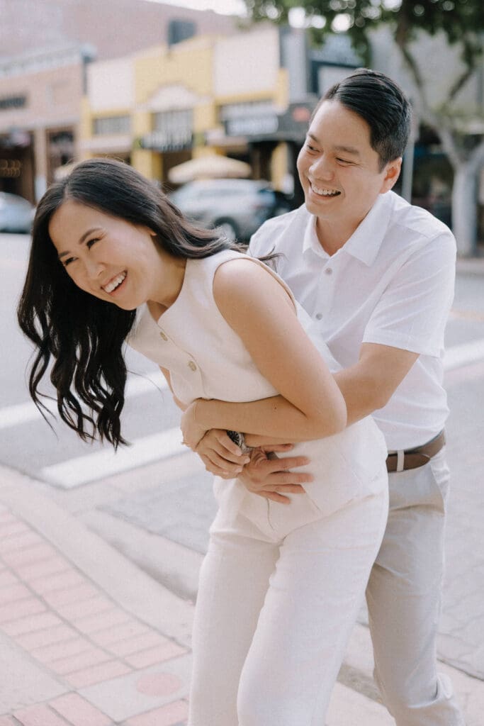As we walked around the downtown blocks, we captured the playful energy between Thai and Minh. Between the hidden alleyways and the iconic fountain at the center of the plaza, every corner of this district offers a new texture. The mix of urban history and vibrant street life makes an Old Town Orange engagement session feel timeless.