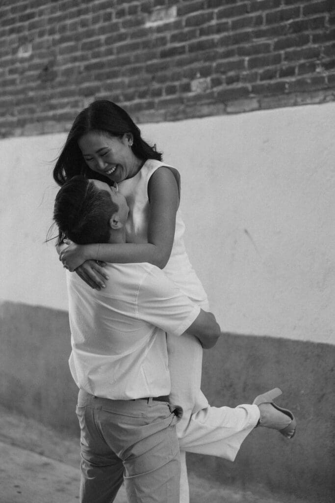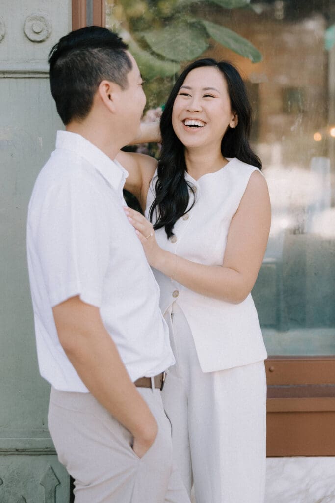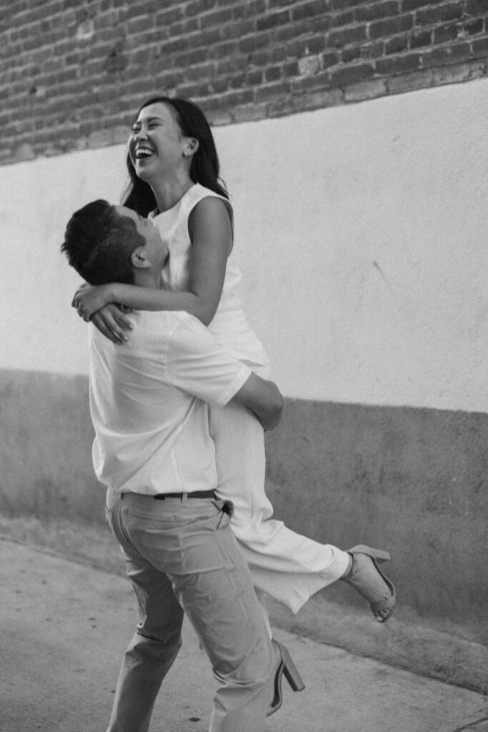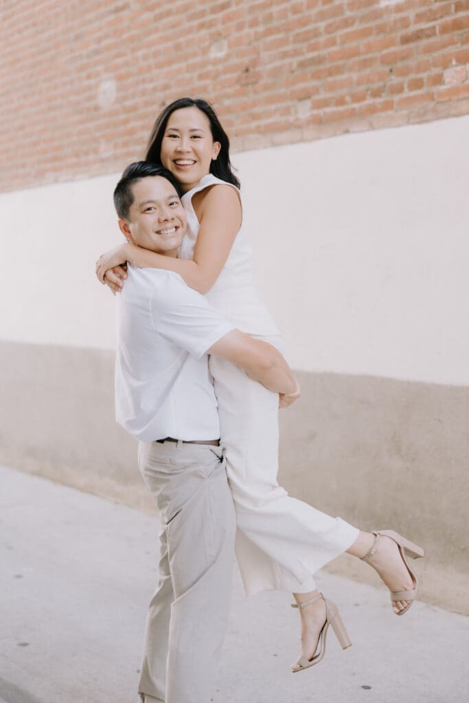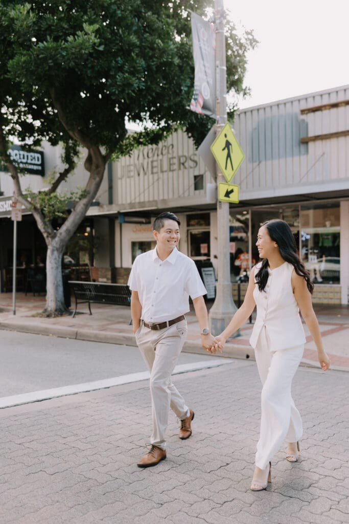 As we walked around the downtown blocks, we captured the playful energy between Thai and Minh. Between the hidden alleyways and the iconic fountain at the center of the plaza, every corner of this district offers a new texture. The mix of urban history and vibrant street life makes an Old Town Orange engagement session feel timeless.