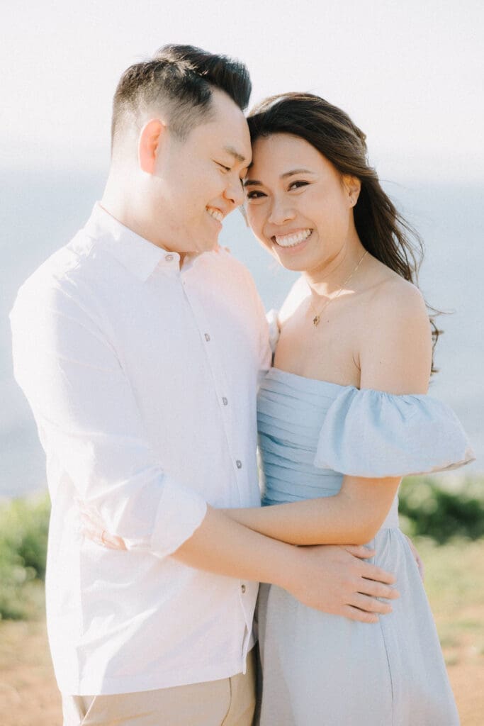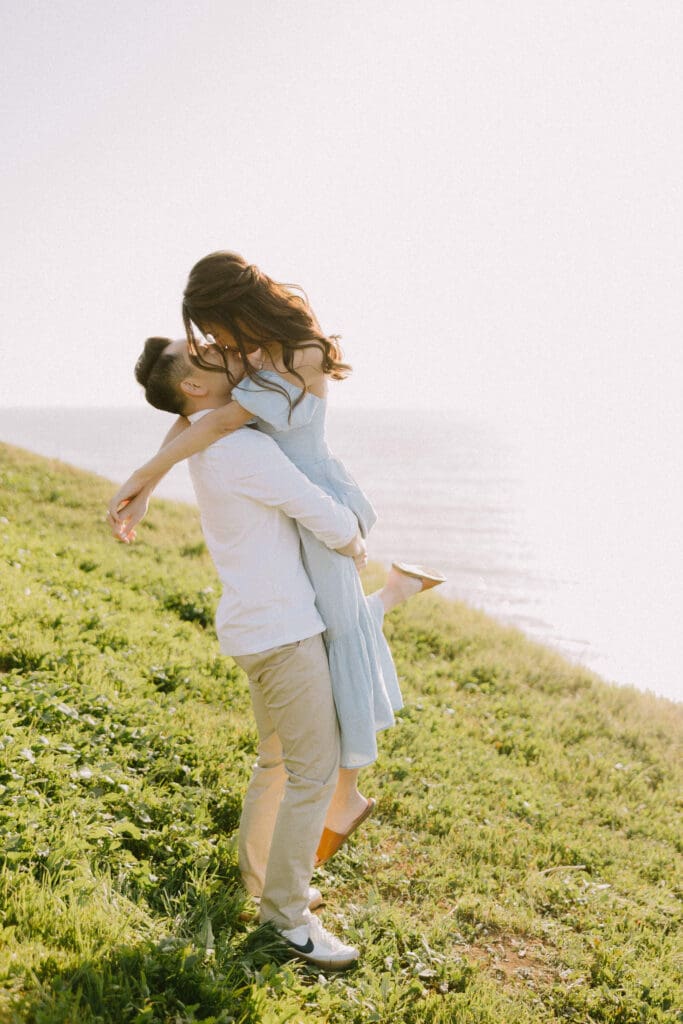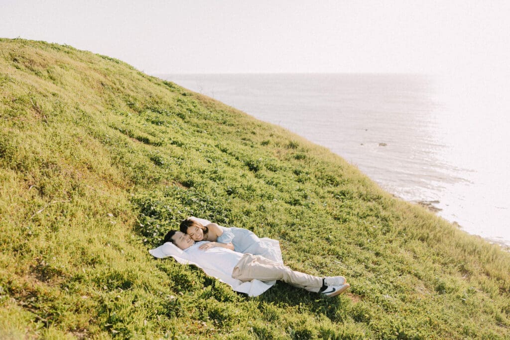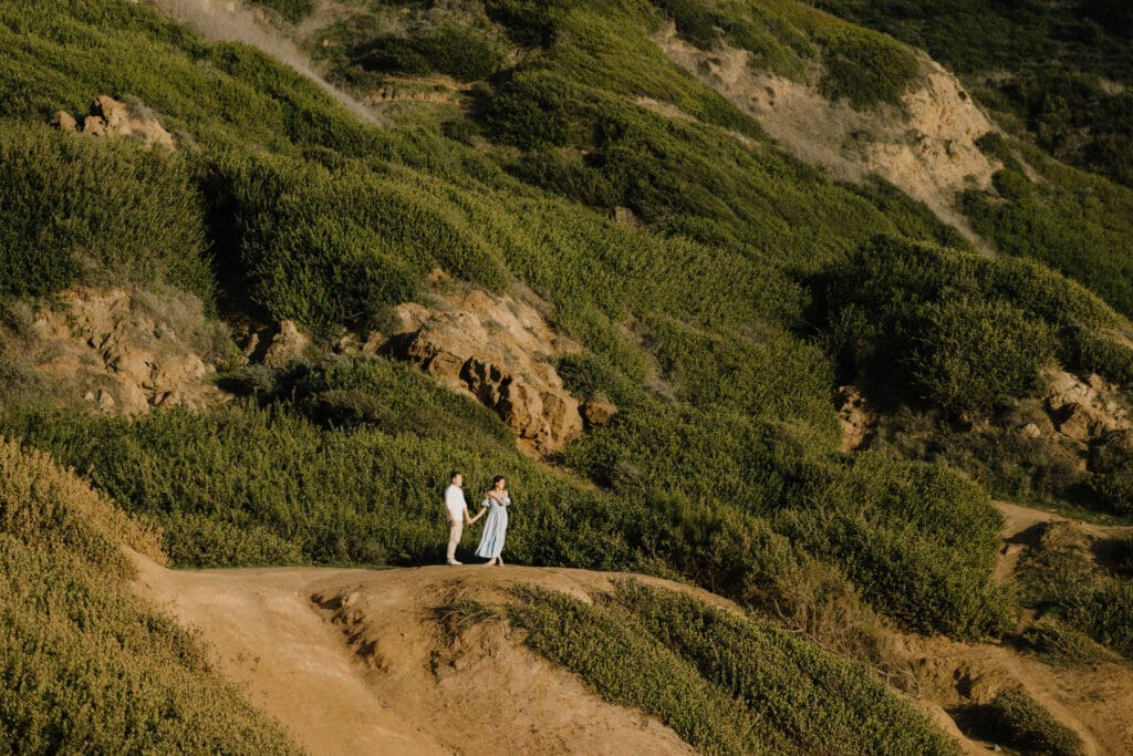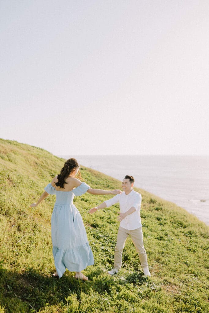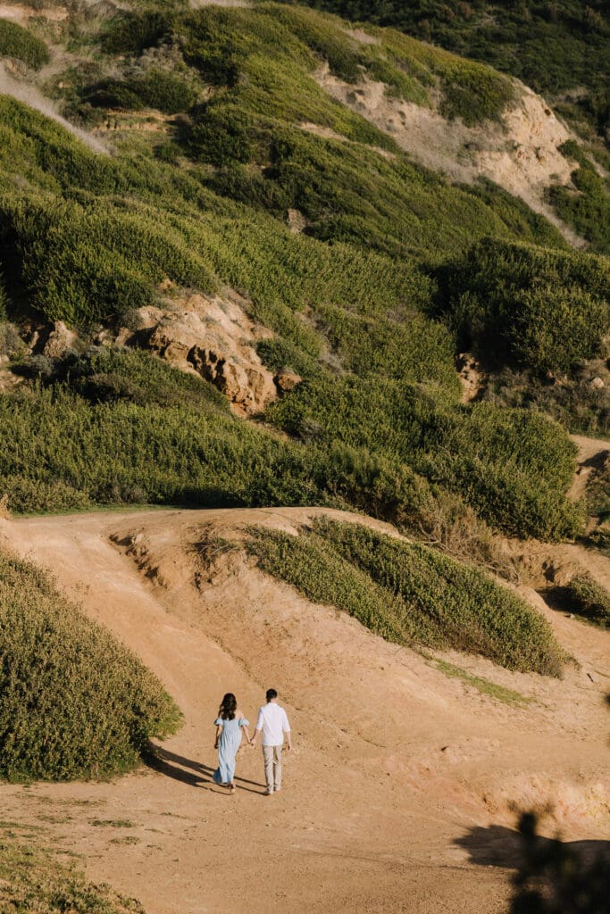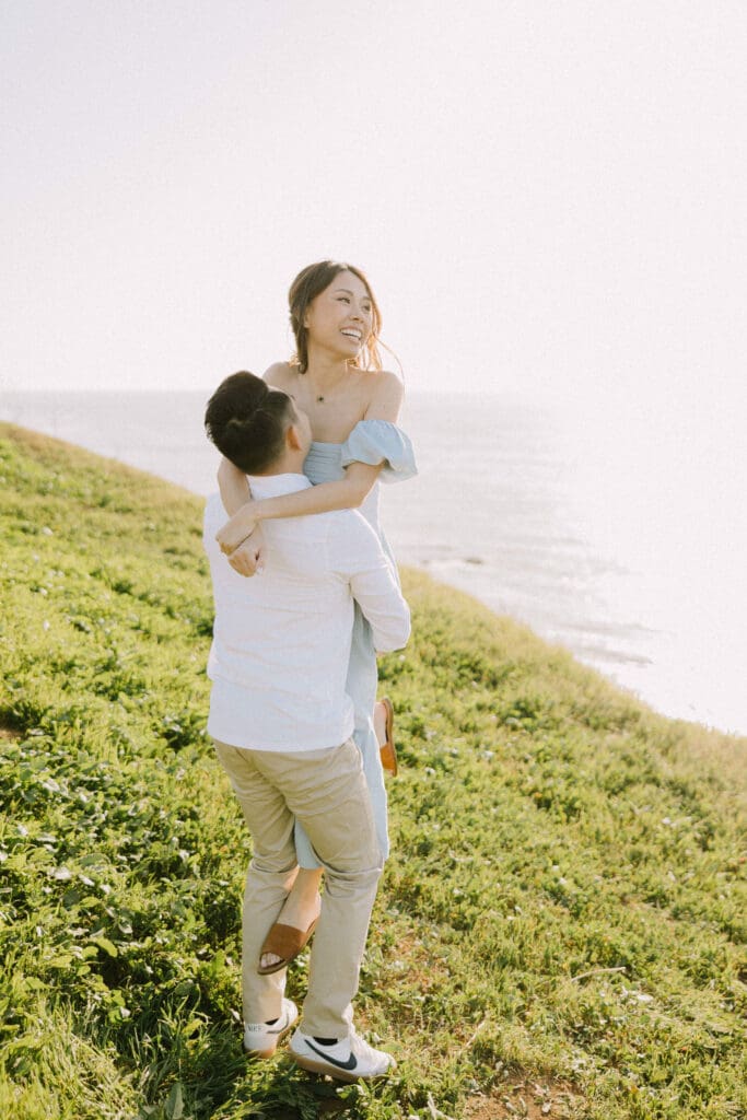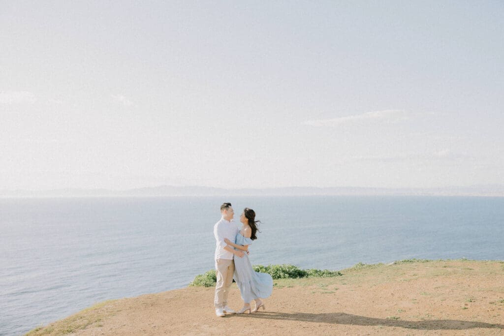 After finishing their drinks, we headed to the iconic cliffs of Palos Verdes. The couple wanted a “nature-y” vibe to contrast their urban start. The rolling hills and ocean views provided a stunning, scenic backdrop.