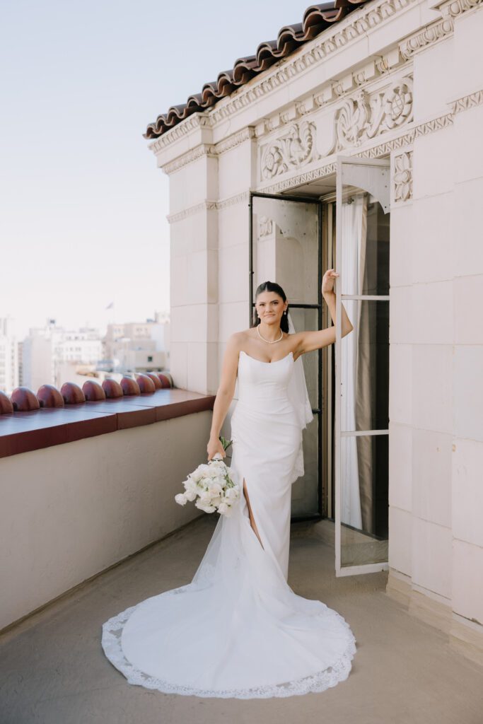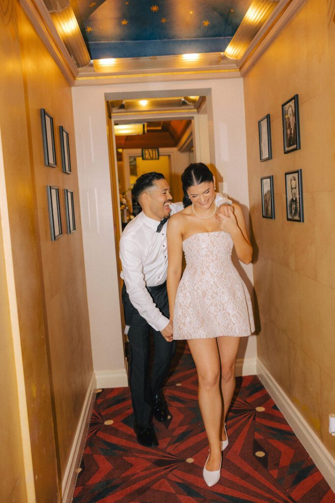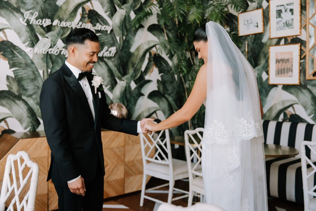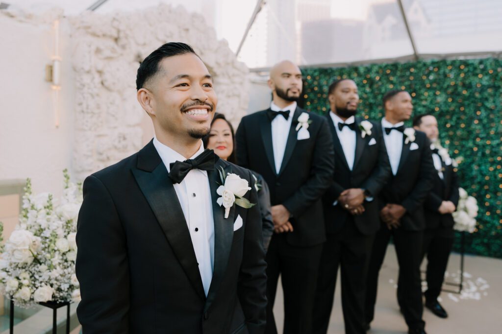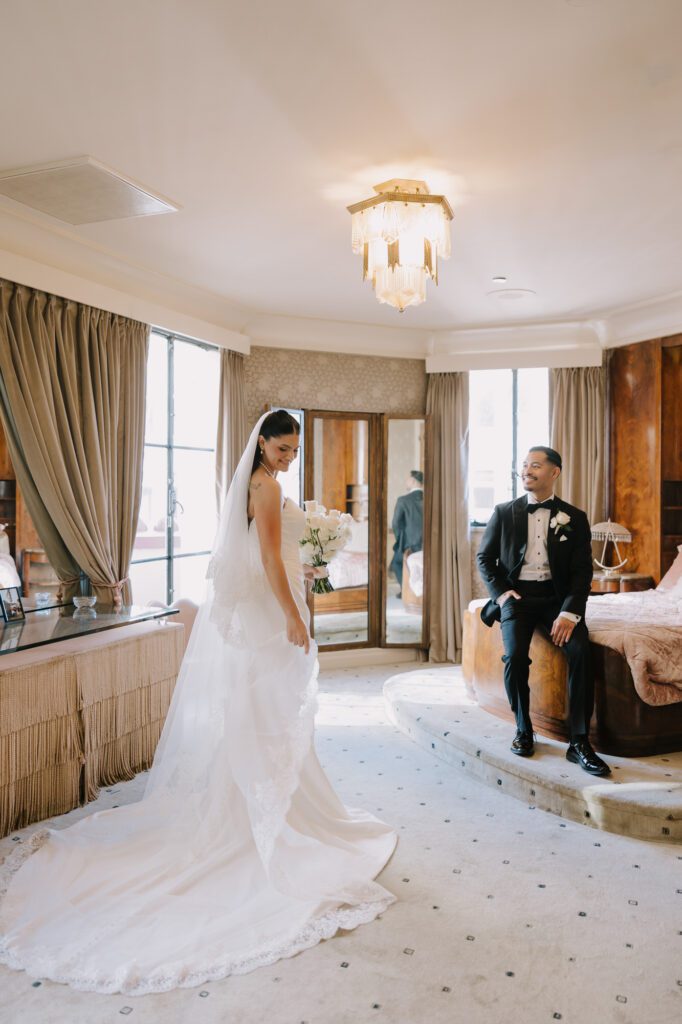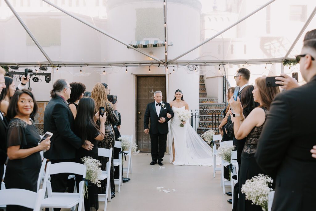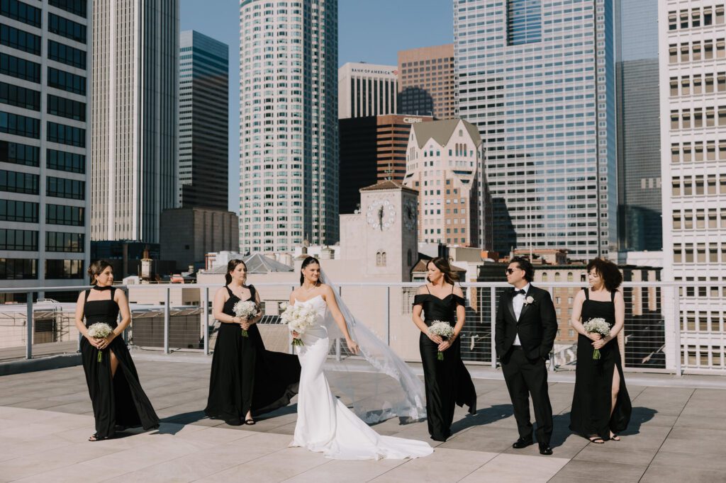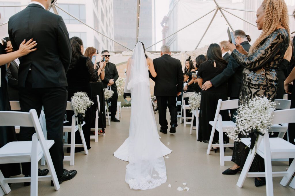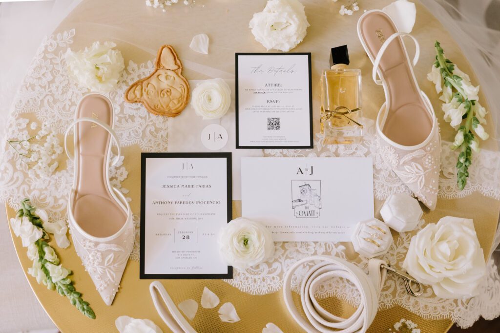 Built in 1928, the Oviatt is a masterclass in historic, vintage aesthetics. Its Art Deco architecture and intricate marble work offer a timeless backdrop that feels both cinematic and intimate. The couple fell in love with the logistical ease of the space—having the ceremony, cocktail hour, and reception all in one sky-high location, with the convenience of nearby hotels just a short stroll away.
