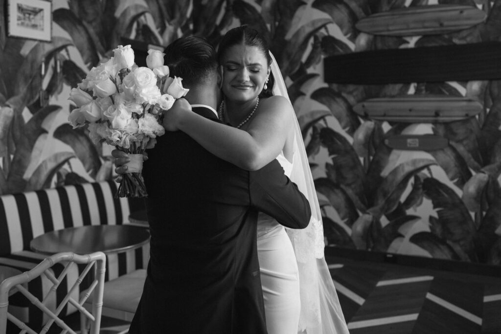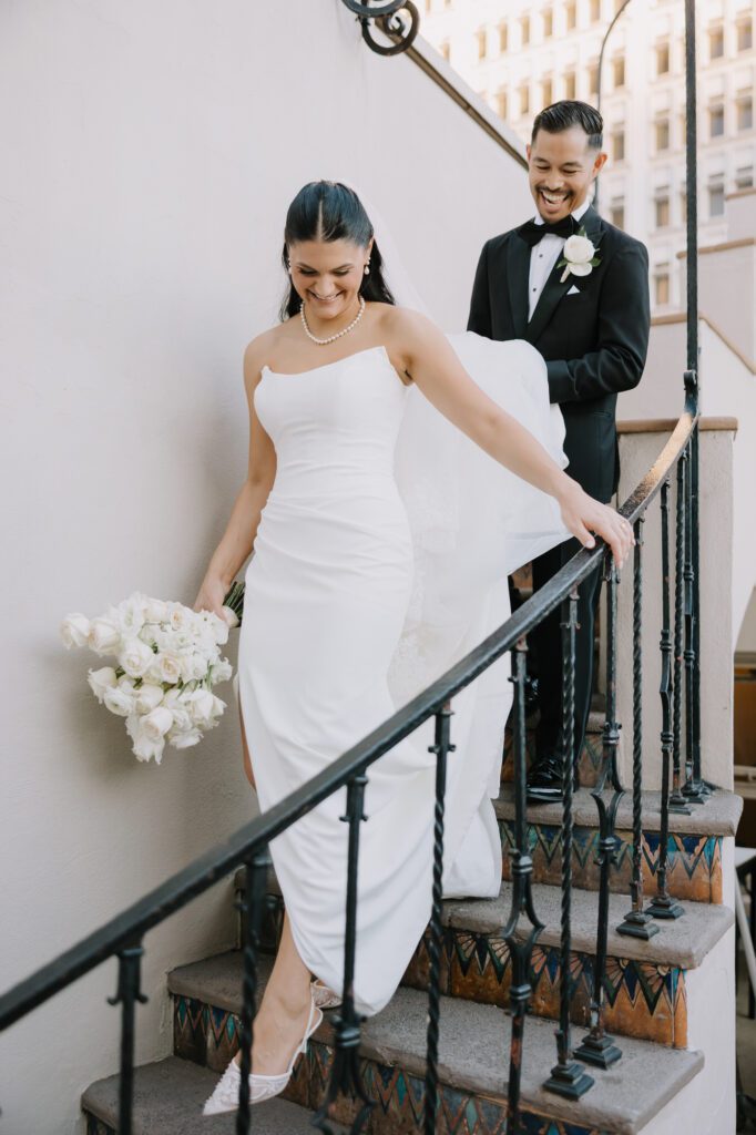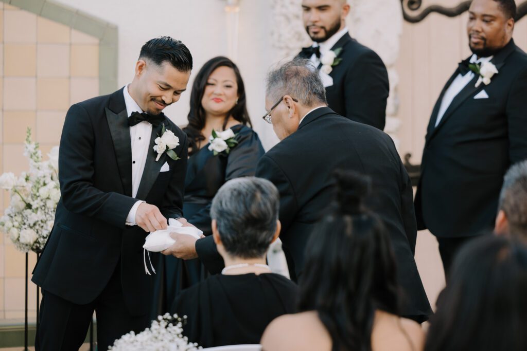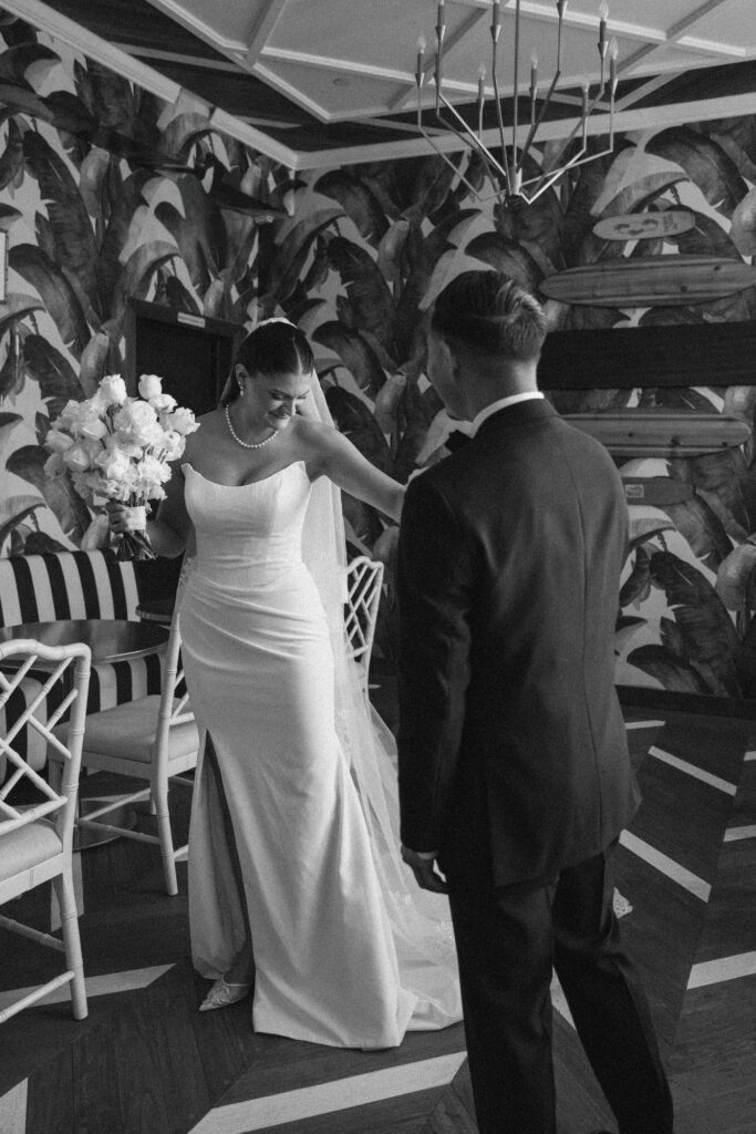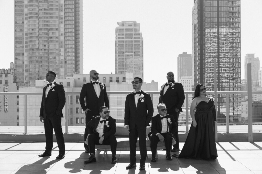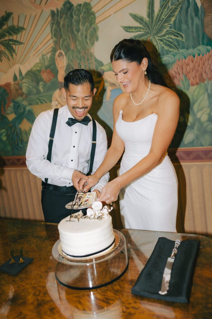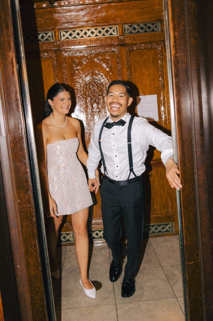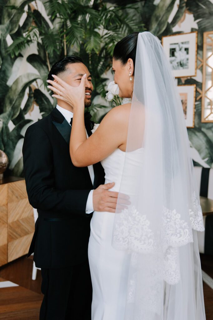 Built in 1928, the Oviatt is a masterclass in historic, vintage aesthetics. Its Art Deco architecture and intricate marble work offer a timeless backdrop that feels both cinematic and intimate. The couple fell in love with the logistical ease of the space—having the ceremony, cocktail hour, and reception all in one sky-high location, with the convenience of nearby hotels just a short stroll away.