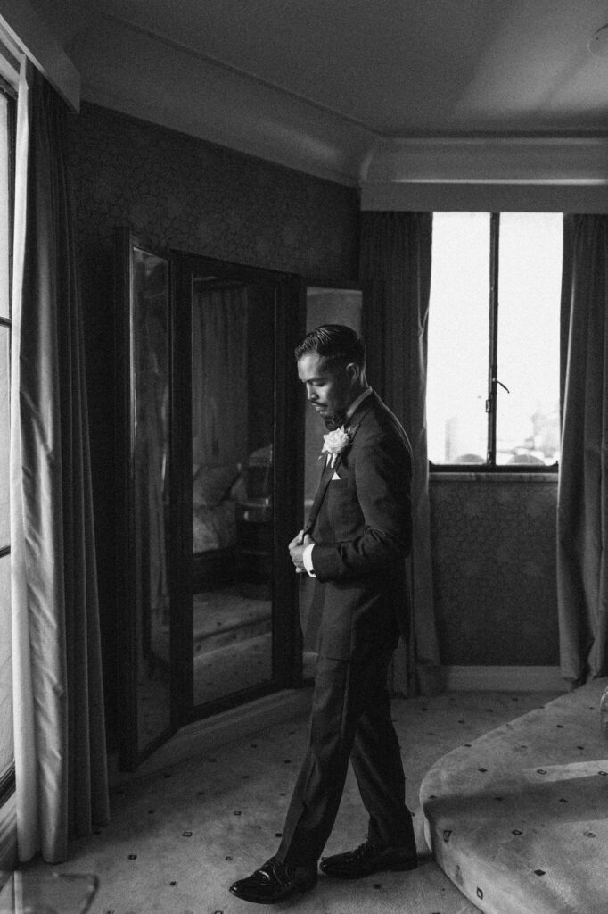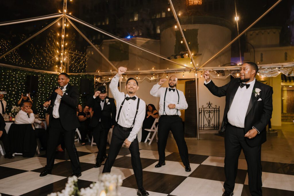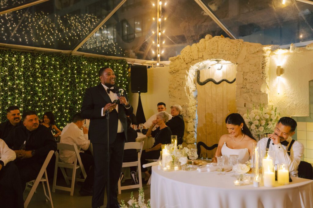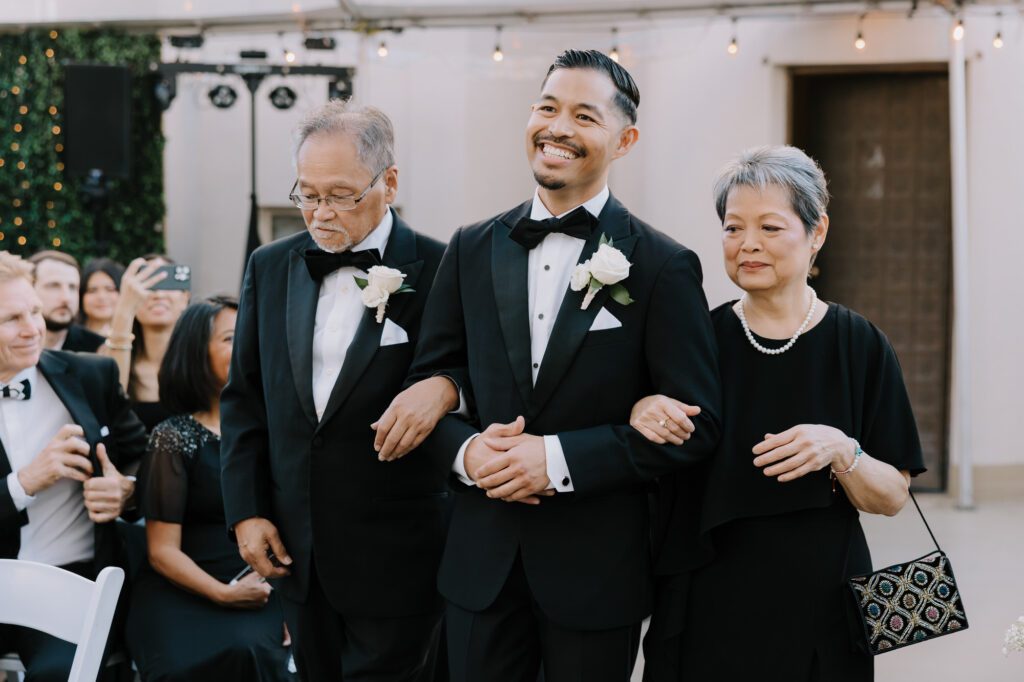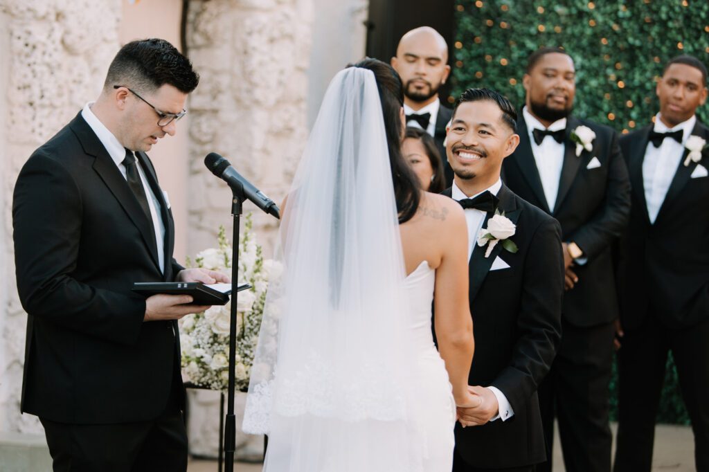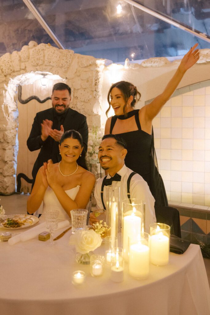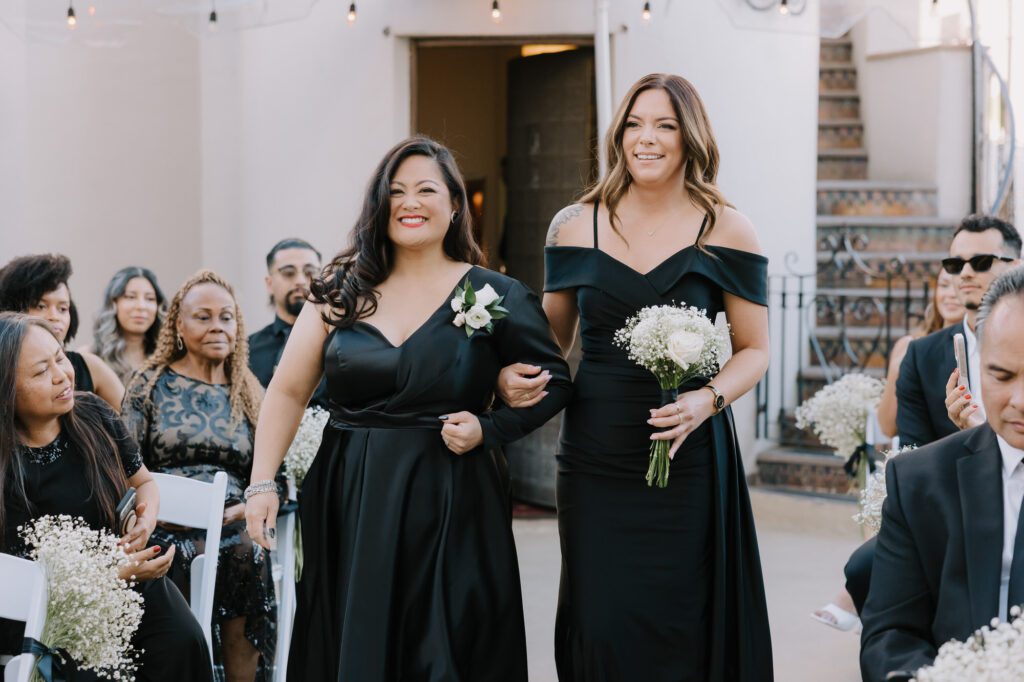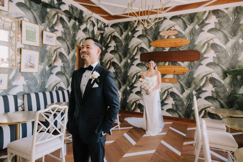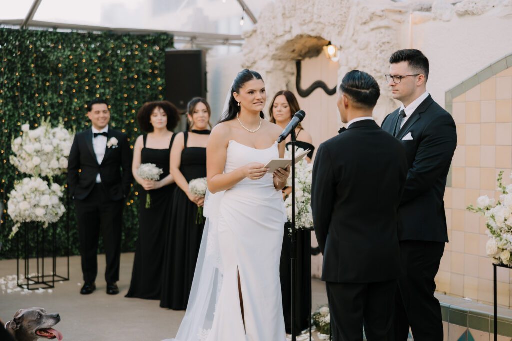 Built in 1928, the Oviatt is a masterclass in historic, vintage aesthetics. Its Art Deco architecture and intricate marble work offer a timeless backdrop that feels both cinematic and intimate. The couple fell in love with the logistical ease of the space—having the ceremony, cocktail hour, and reception all in one sky-high location, with the convenience of nearby hotels just a short stroll away.