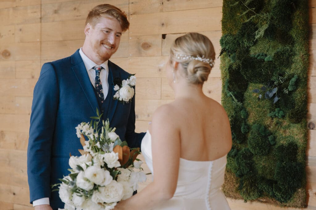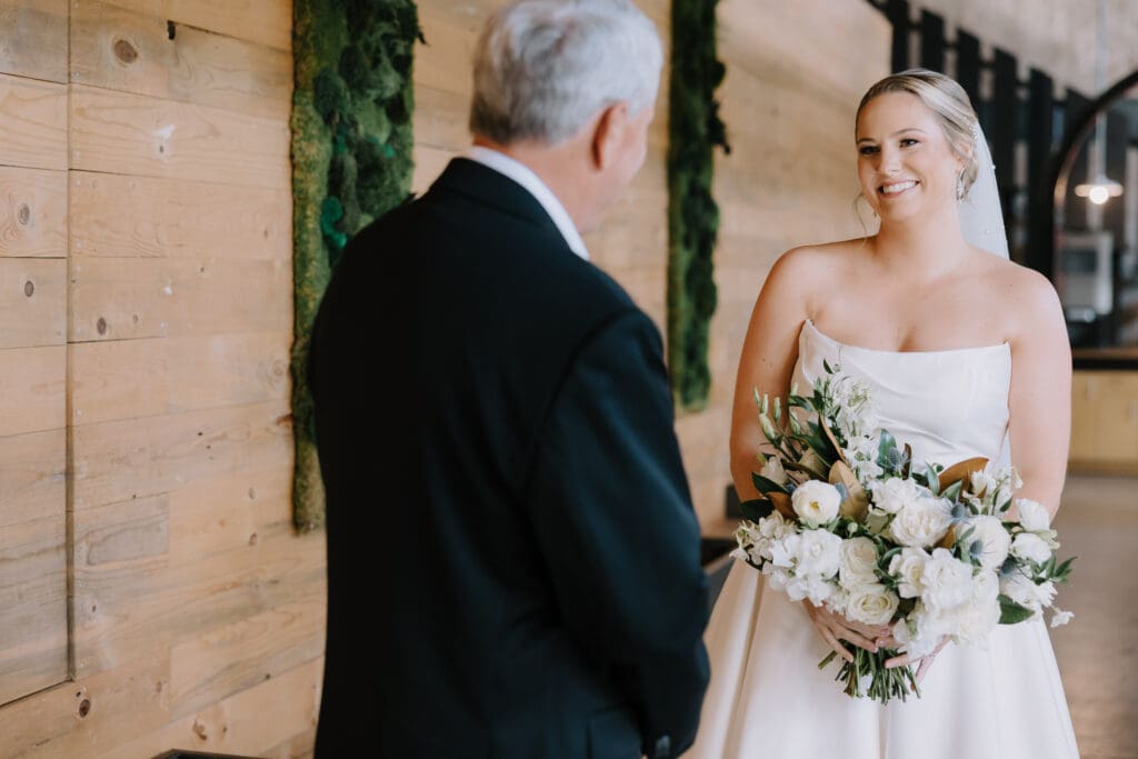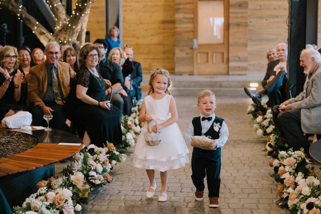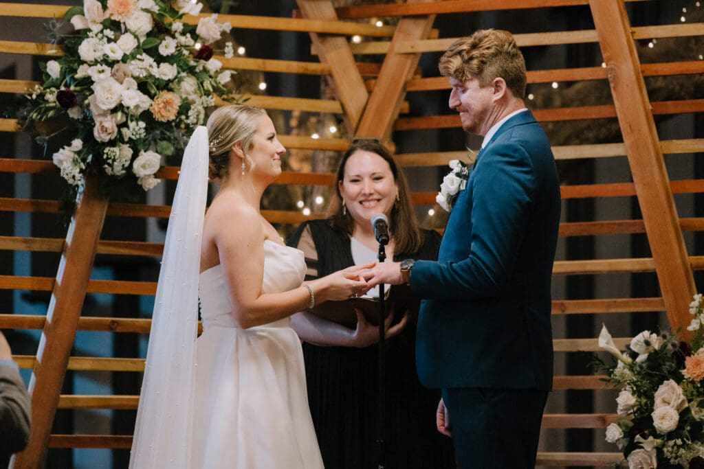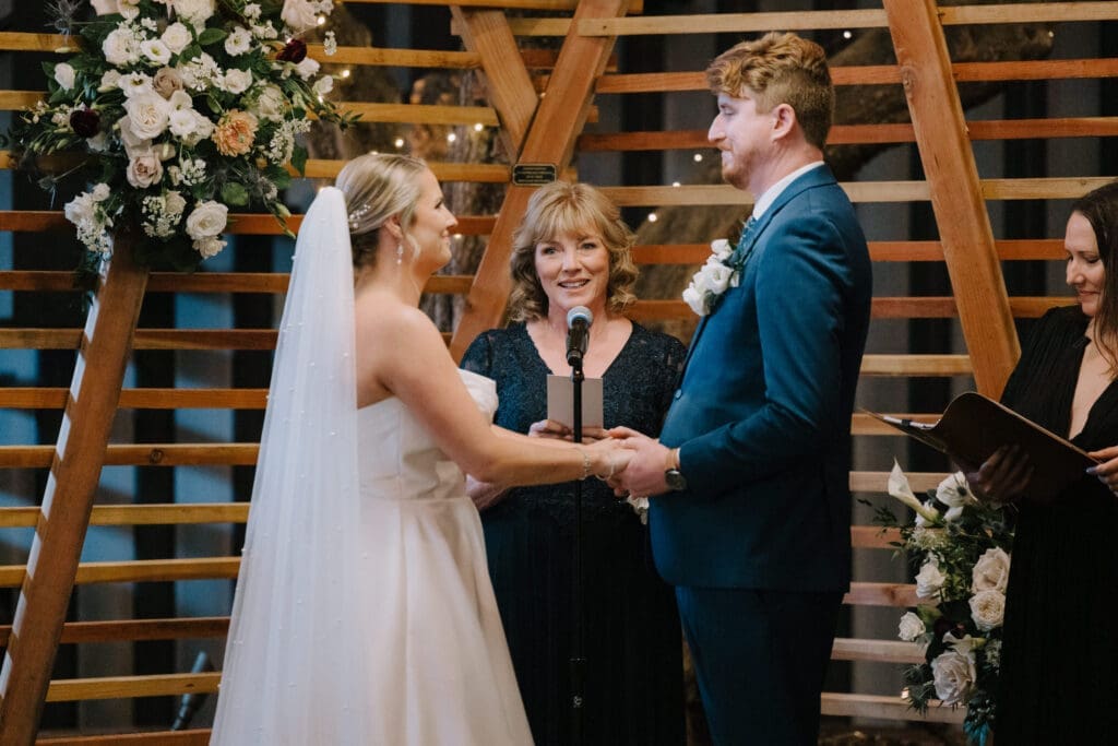 The couple exchanged vows in the venue’s iconic Farmhouse Chapel. With its vaulted ceilings, vintage wood cladding, and massive swinging doors, the chapel offers a “venue within a venue” feel. It provided a cozy, sacred atmosphere for the ceremony before the heavy timber doors opened to reveal the larger celebration awaiting in the main hall.