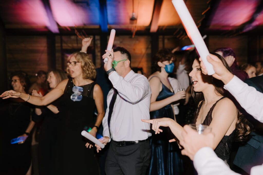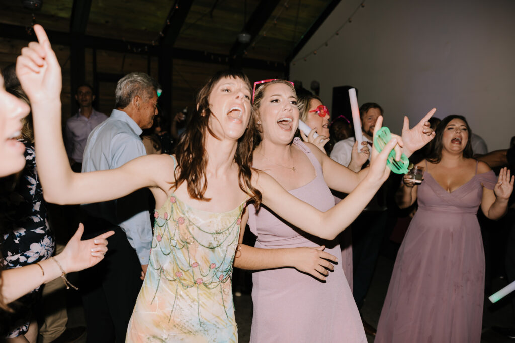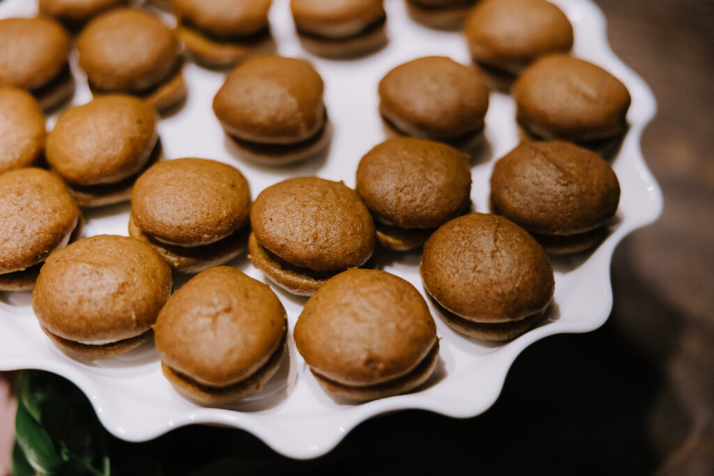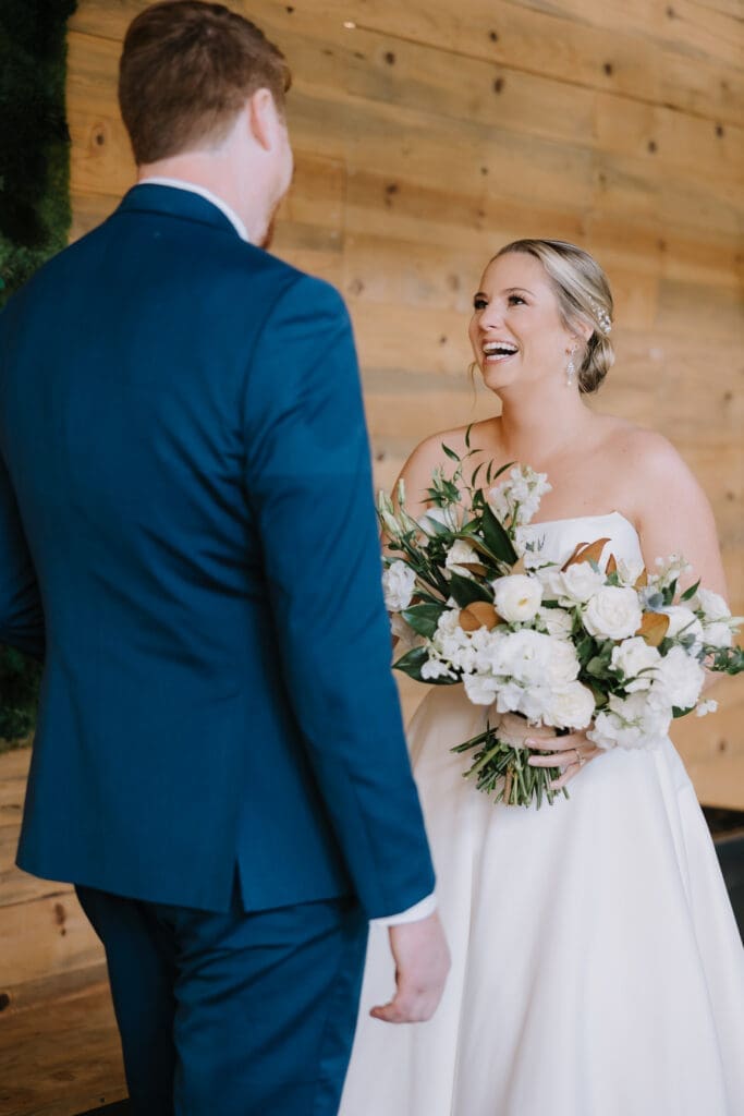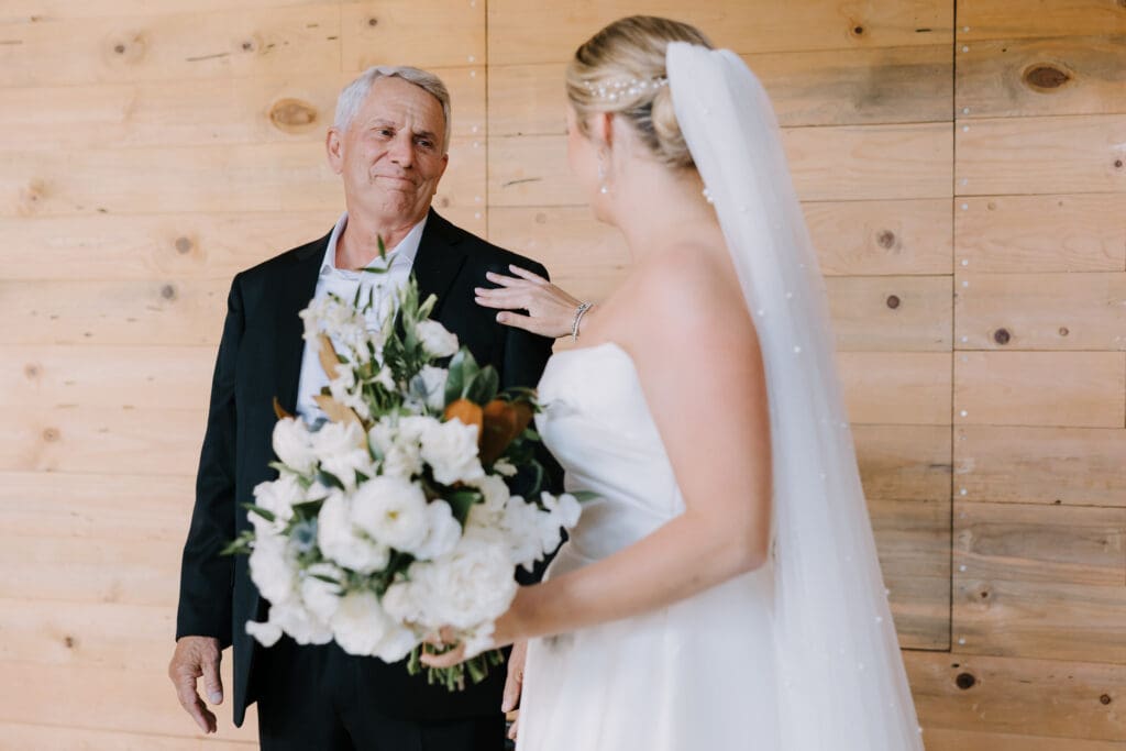 The couple exchanged vows in the venue’s iconic Farmhouse Chapel. With its vaulted ceilings, vintage wood cladding, and massive swinging doors, the chapel offers a “venue within a venue” feel. It provided a cozy, sacred atmosphere for the ceremony before the heavy timber doors opened to reveal the larger celebration awaiting in the main hall.
