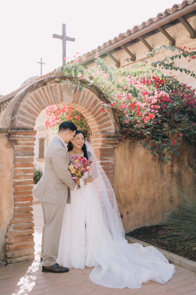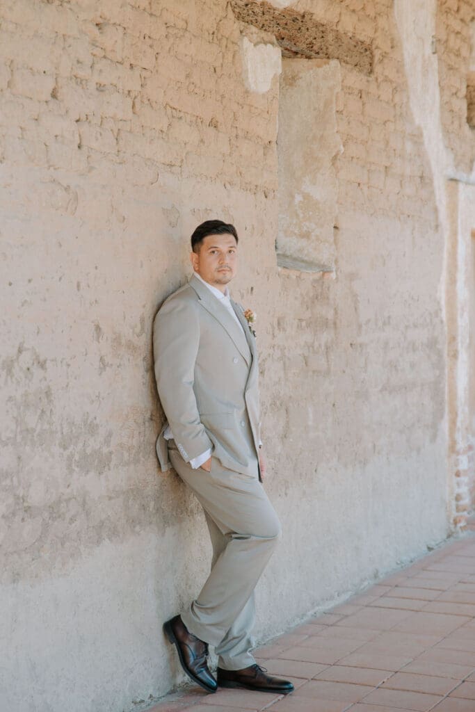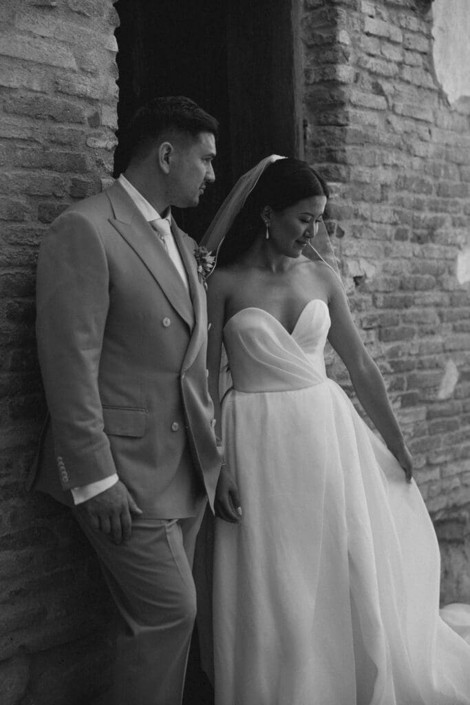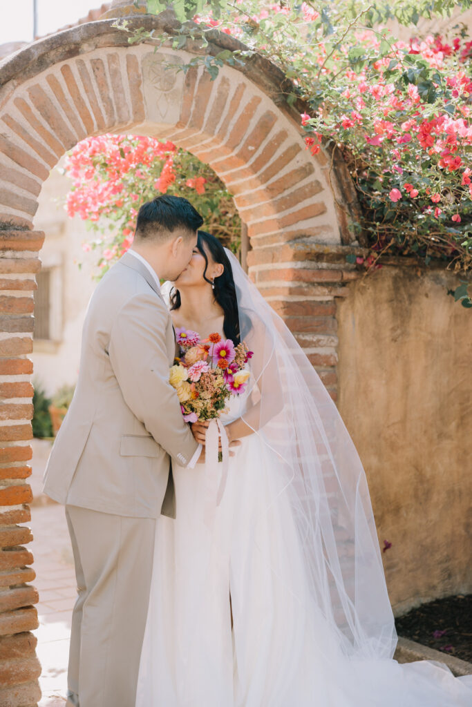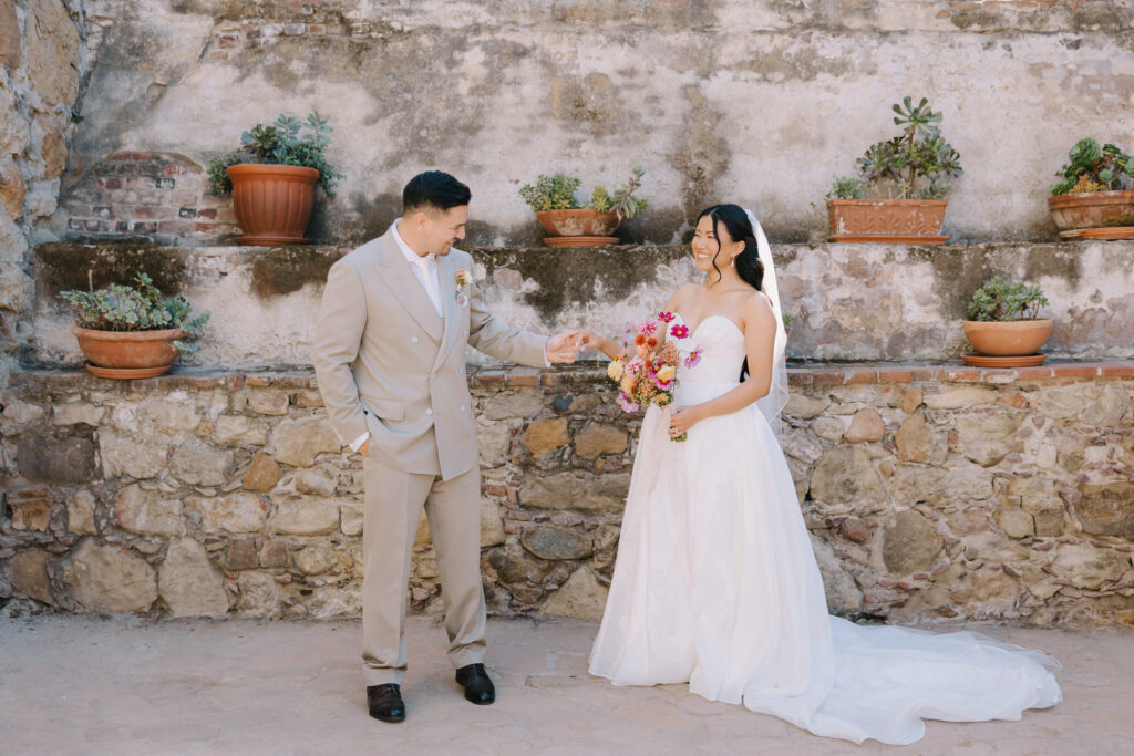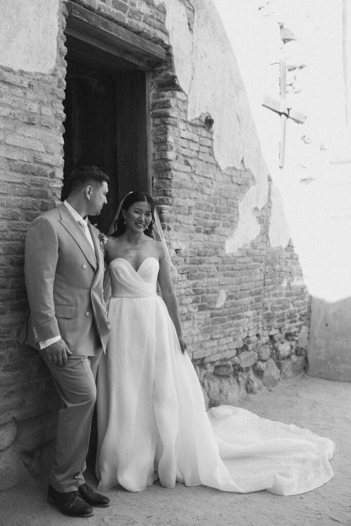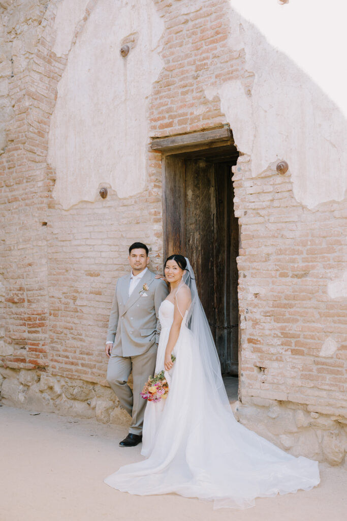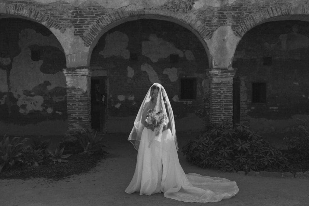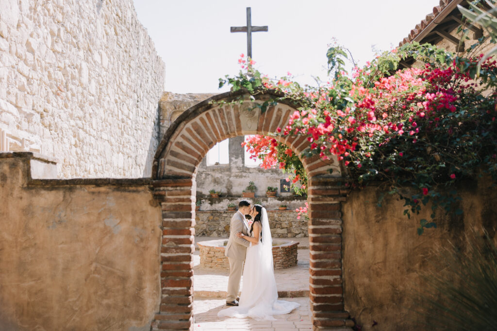 We began the day at the iconic Mission San Juan Capistrano. Known as the “Jewel of the Missions,” its weathered stone arches and blooming bougainvillea provided a cinematic backdrop for the couple’s portraits. Alyssa’s gown glowed against the rustic textures, creating a sophisticated “Old World” feel before the festivities even began.