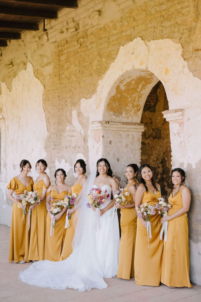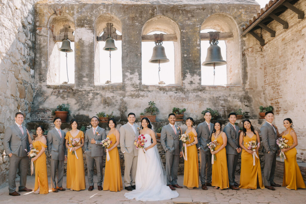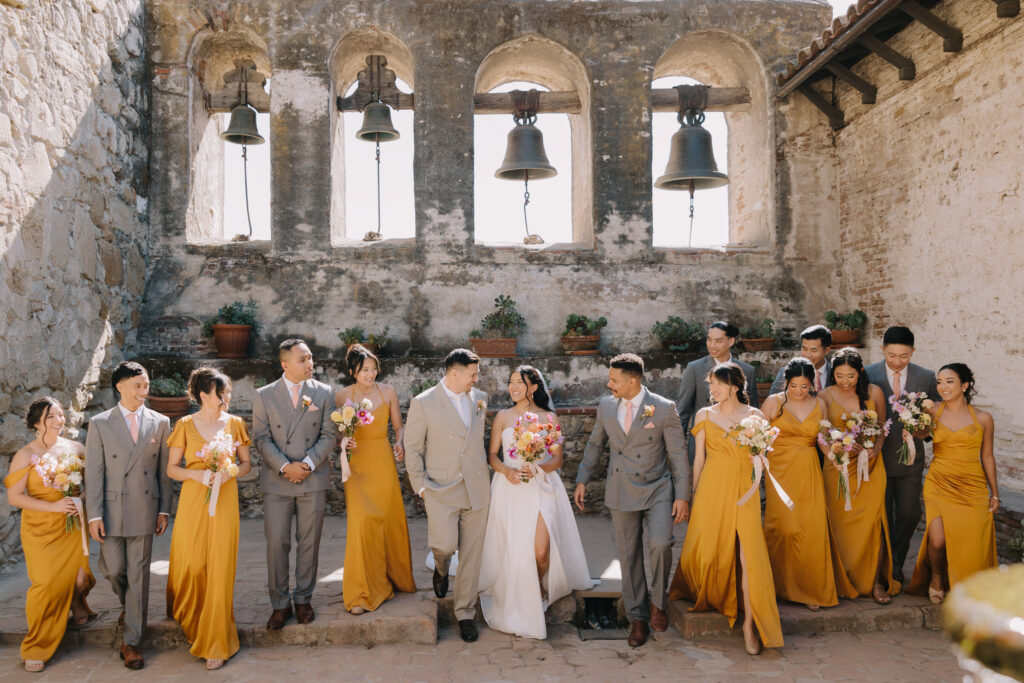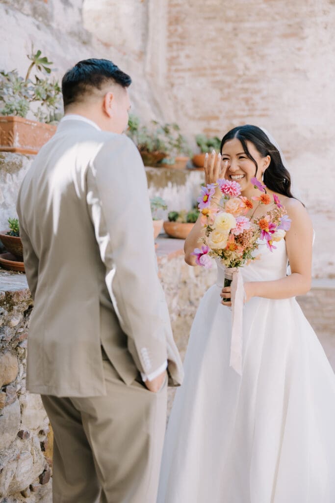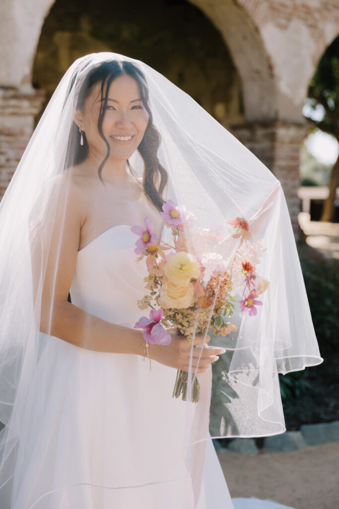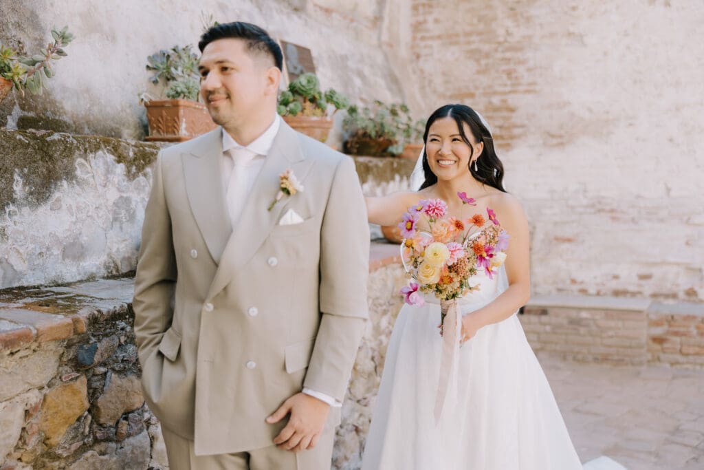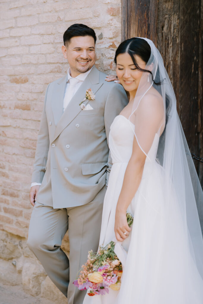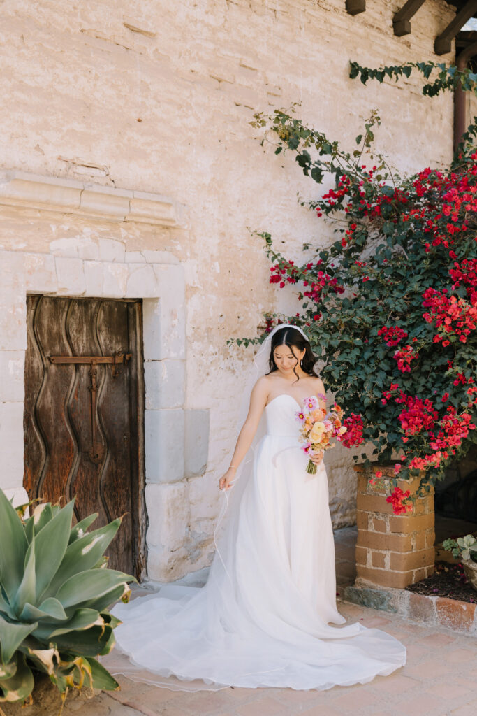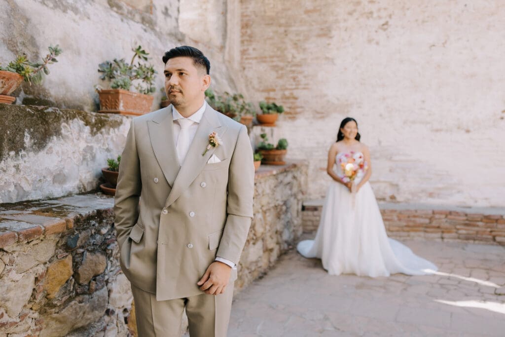 We began the day at the iconic Mission San Juan Capistrano. Known as the “Jewel of the Missions,” its weathered stone arches and blooming bougainvillea provided a cinematic backdrop for the couple’s portraits. Alyssa’s gown glowed against the rustic textures, creating a sophisticated “Old World” feel before the festivities even began.