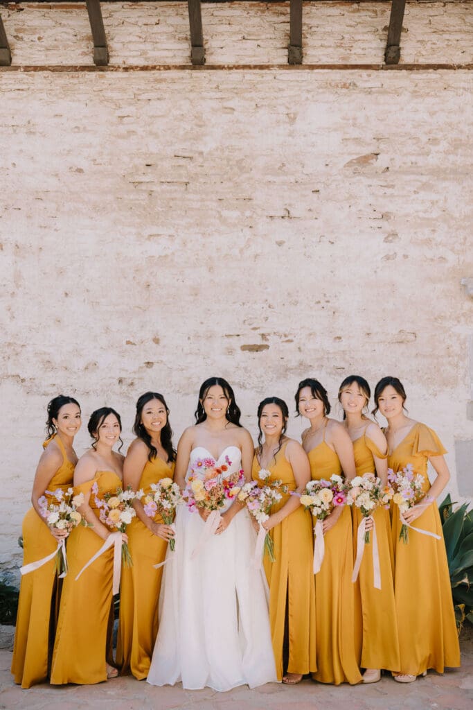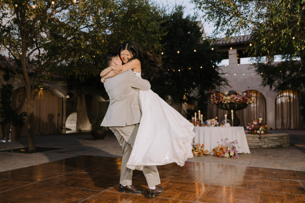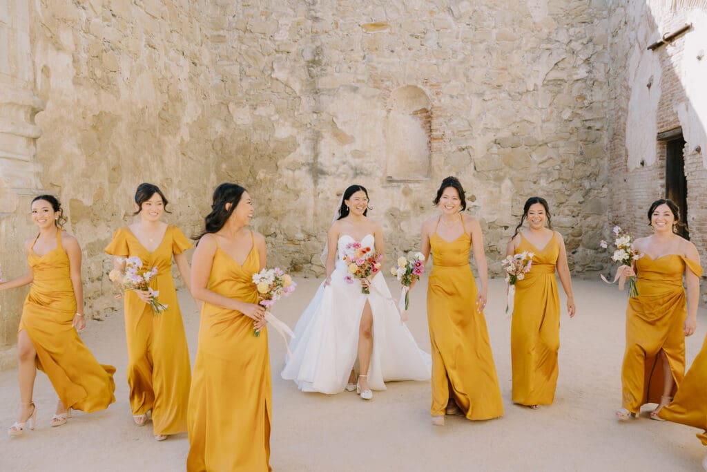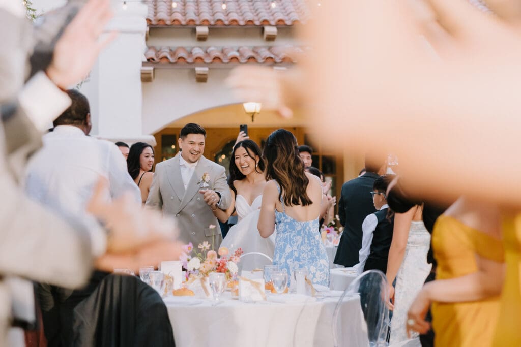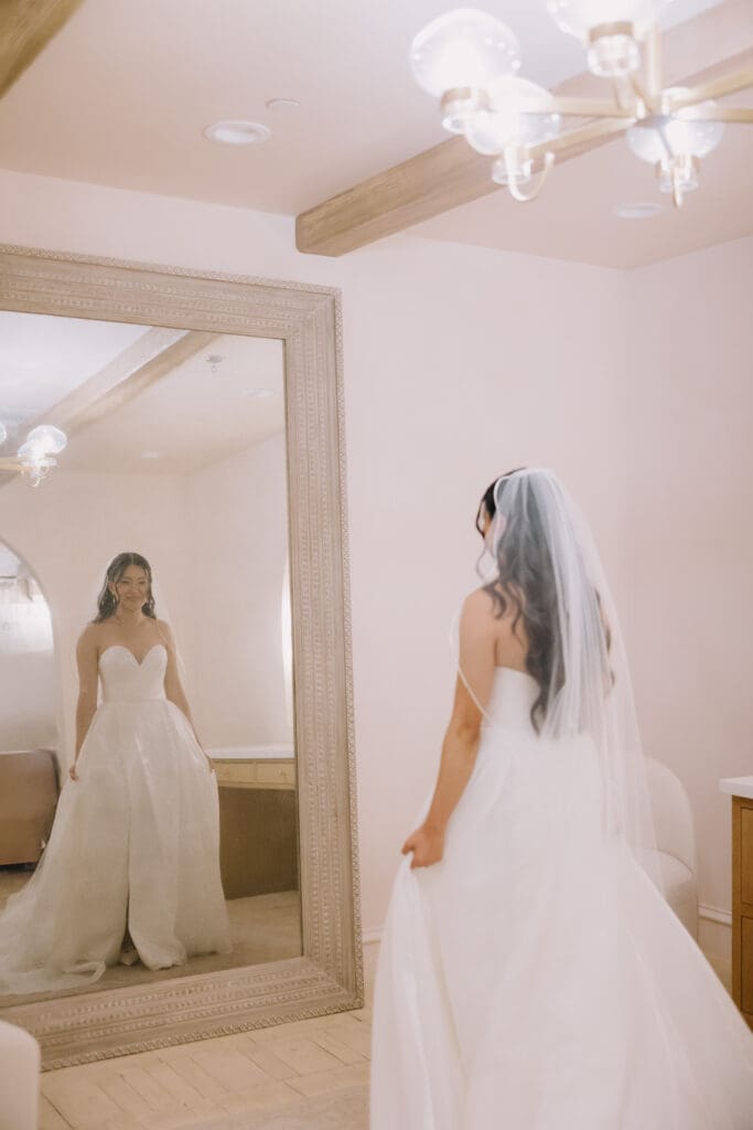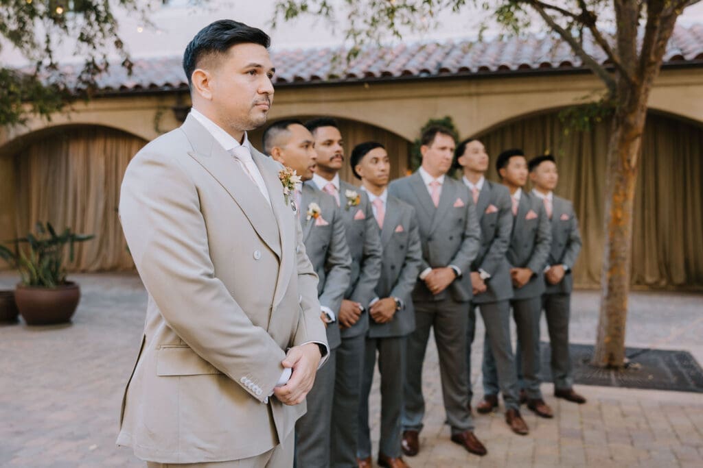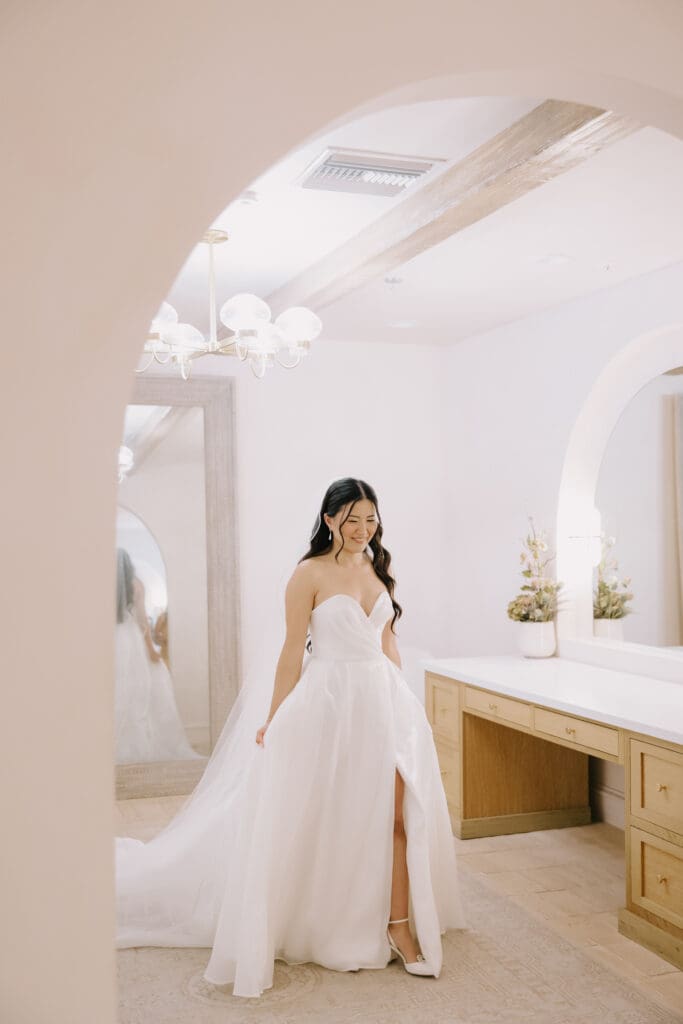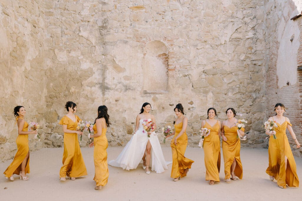 We began the day at the iconic Mission San Juan Capistrano. Known as the “Jewel of the Missions,” its weathered stone arches and blooming bougainvillea provided a cinematic backdrop for the couple’s portraits. Alyssa’s gown glowed against the rustic textures, creating a sophisticated “Old World” feel before the festivities even began.