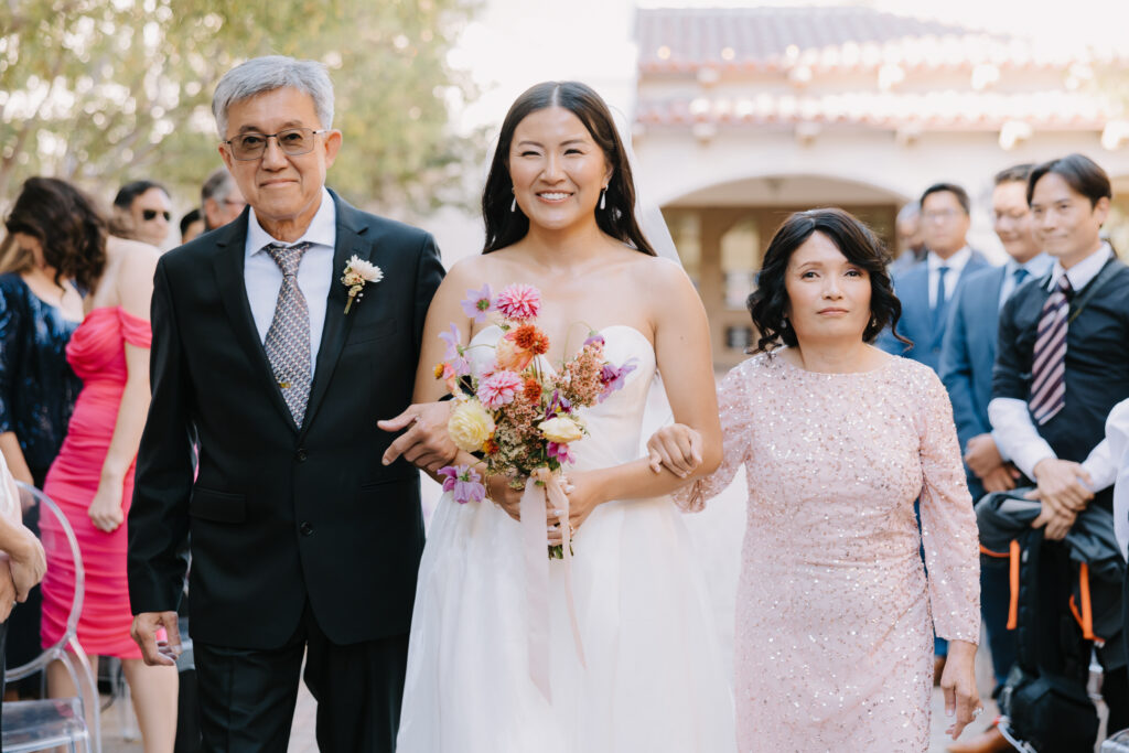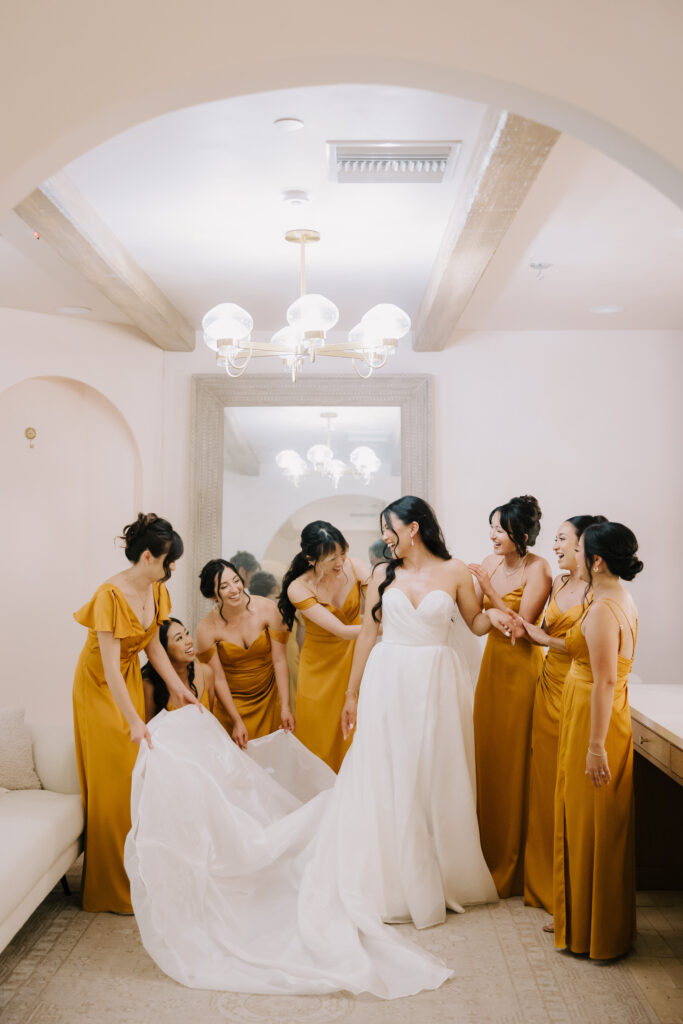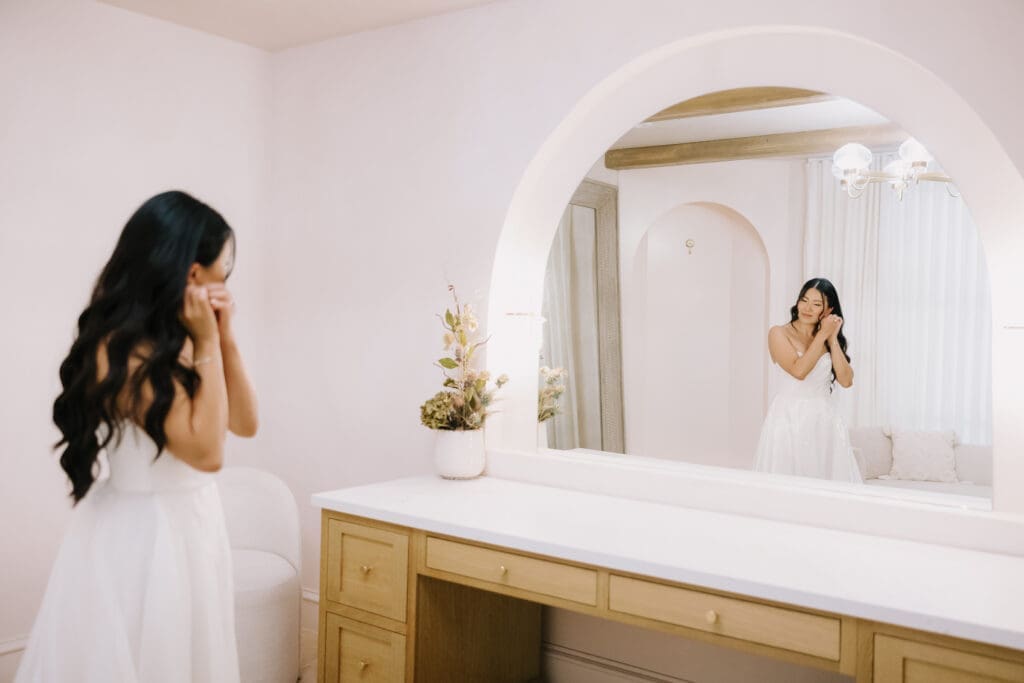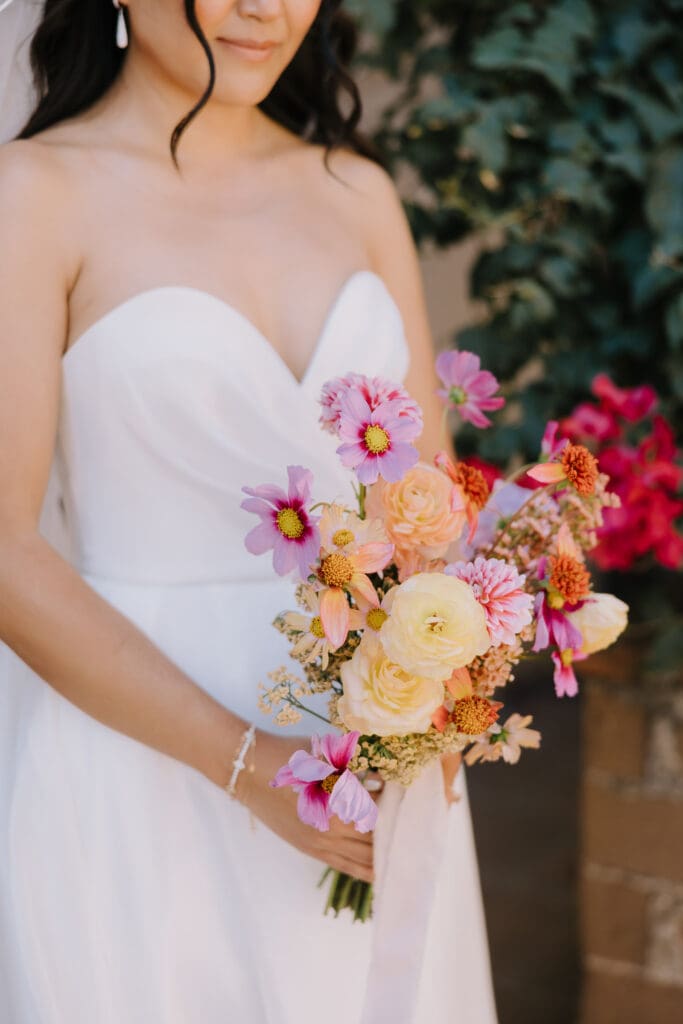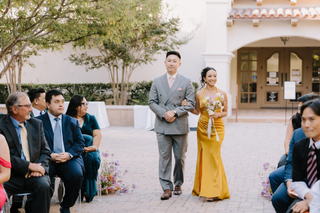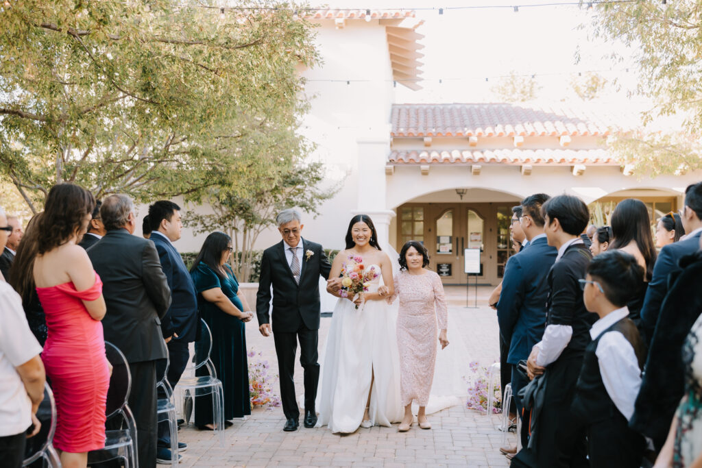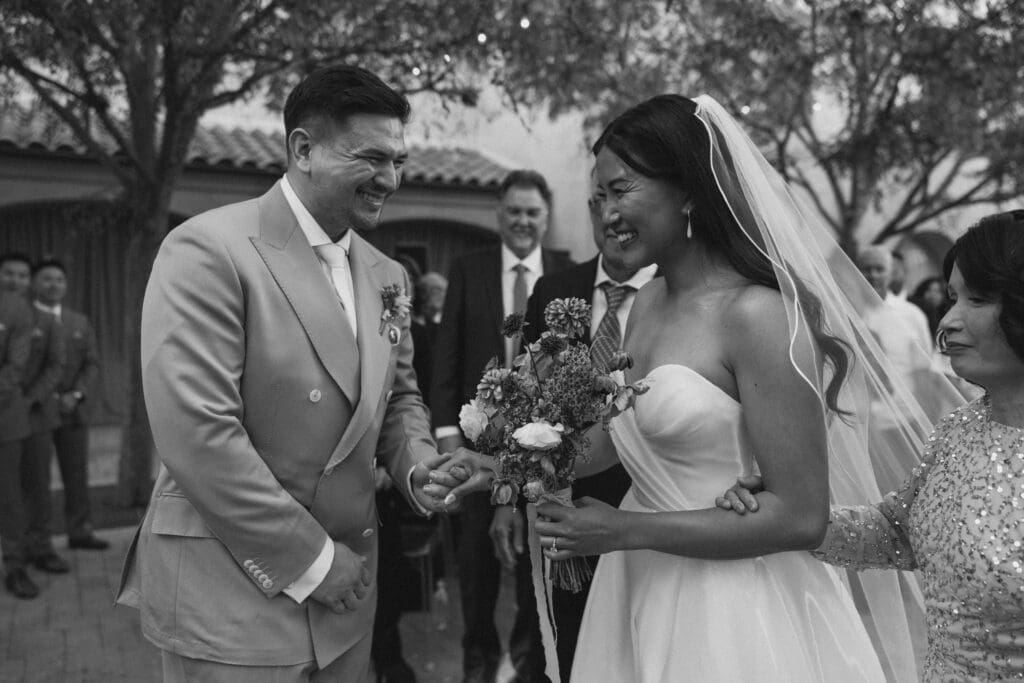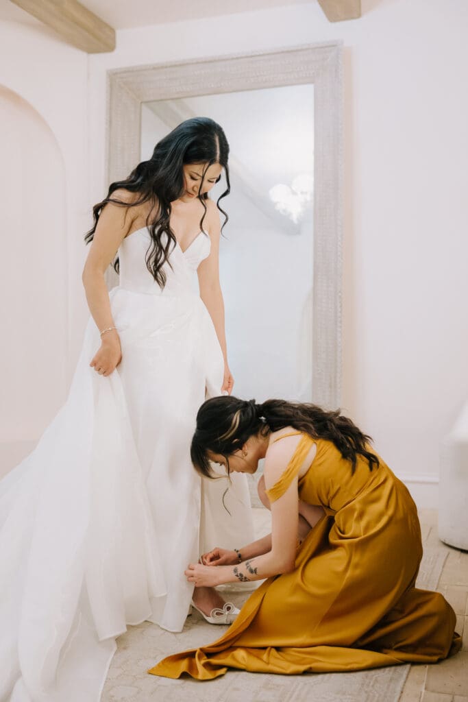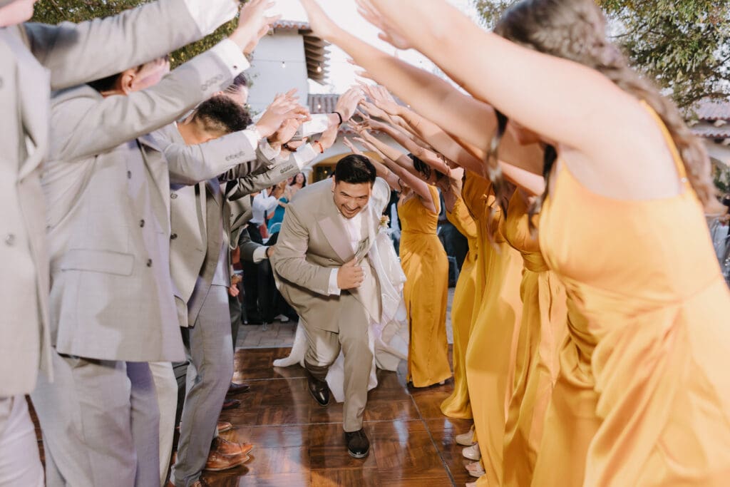We began the day at the iconic Mission San Juan Capistrano. Known as the “Jewel of the Missions,” its weathered stone arches and blooming bougainvillea provided a cinematic backdrop for the couple’s portraits. Alyssa’s gown glowed against the rustic textures, creating a sophisticated “Old World” feel before the festivities even began.