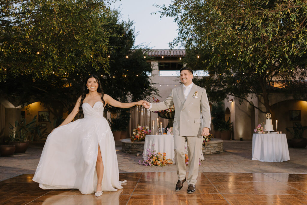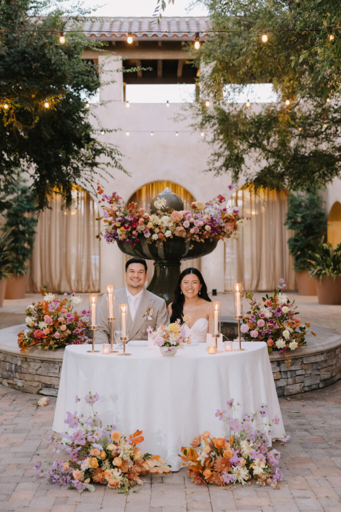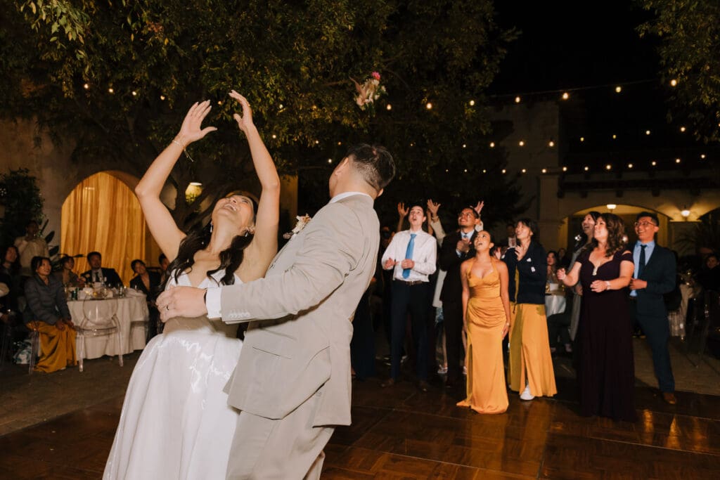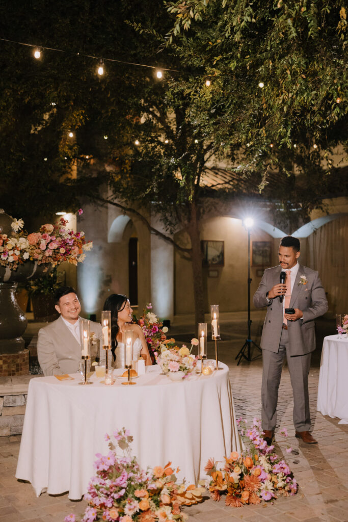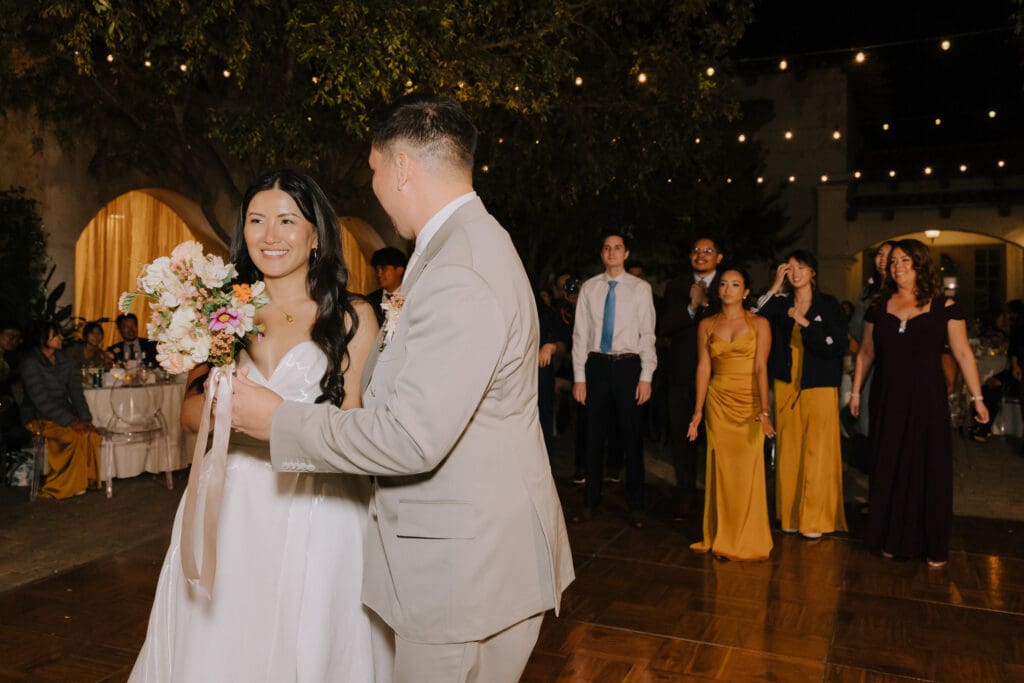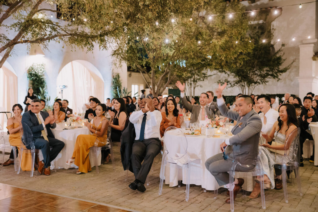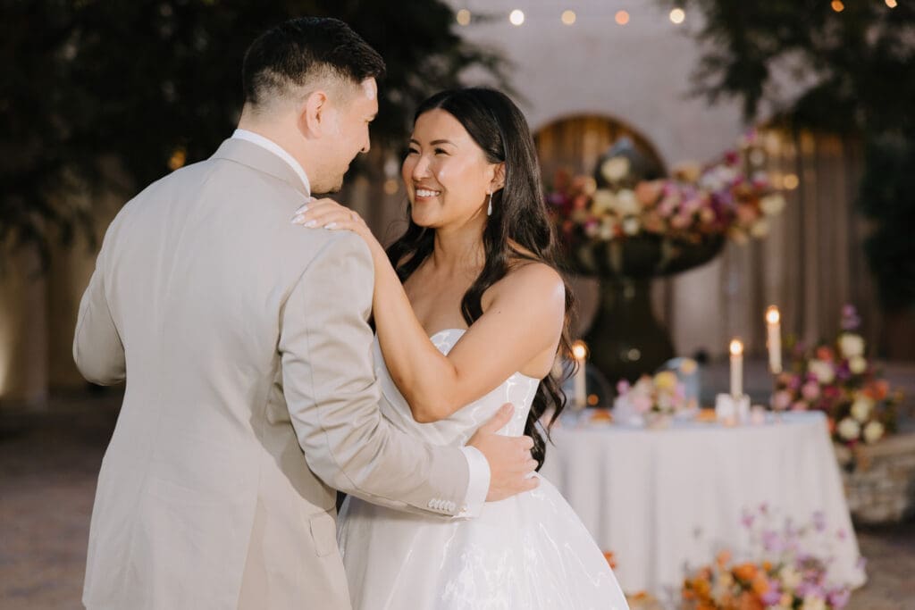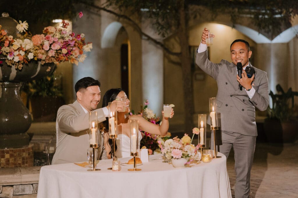 As the sun set, the gold-rimmed tablescapes caught the light, and the plaza transformed into a private Mediterranean estate. This Serra Plaza San Juan Capistrano wedding perfectly balanced the grandeur of a luxury event with the warmth of an outdoor summer night.