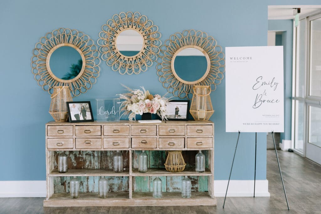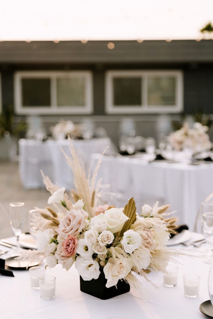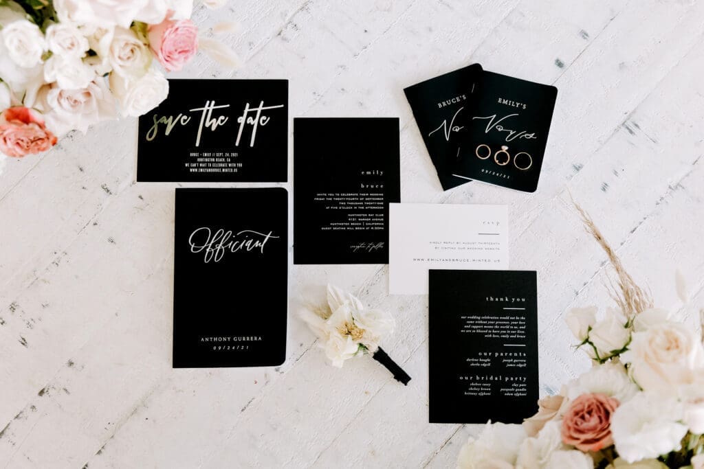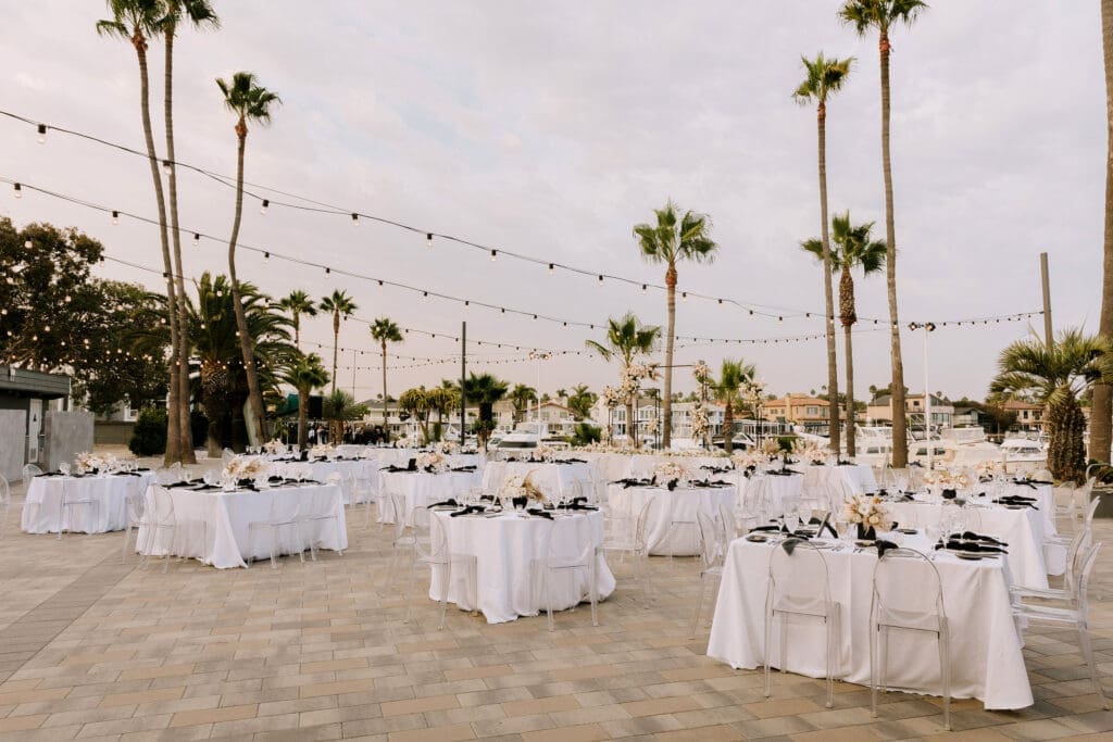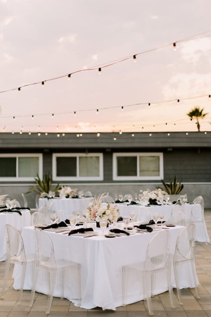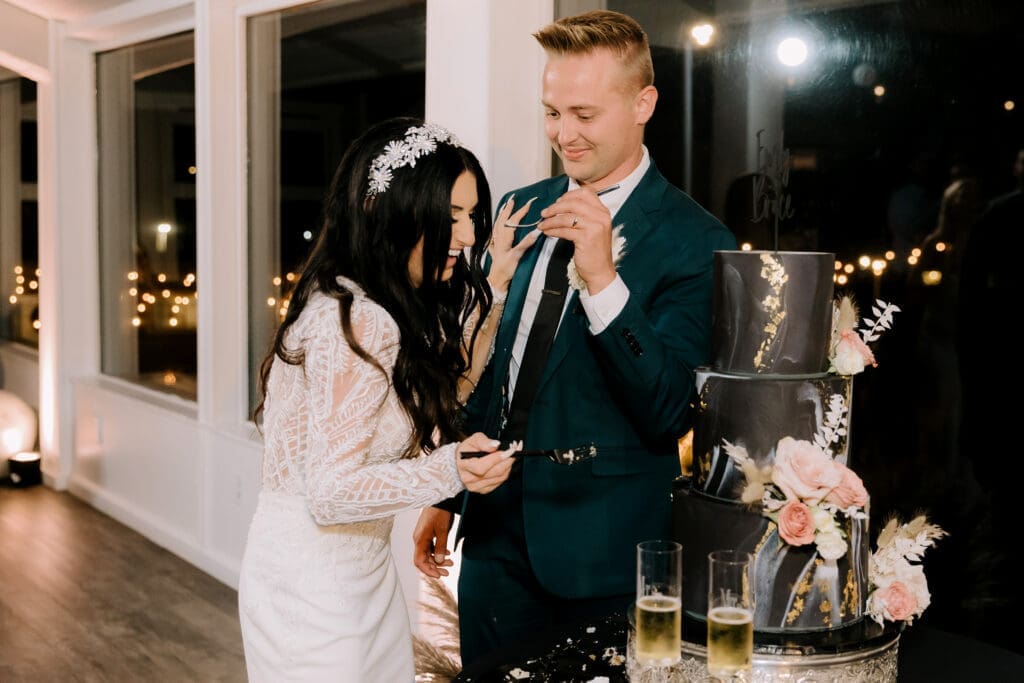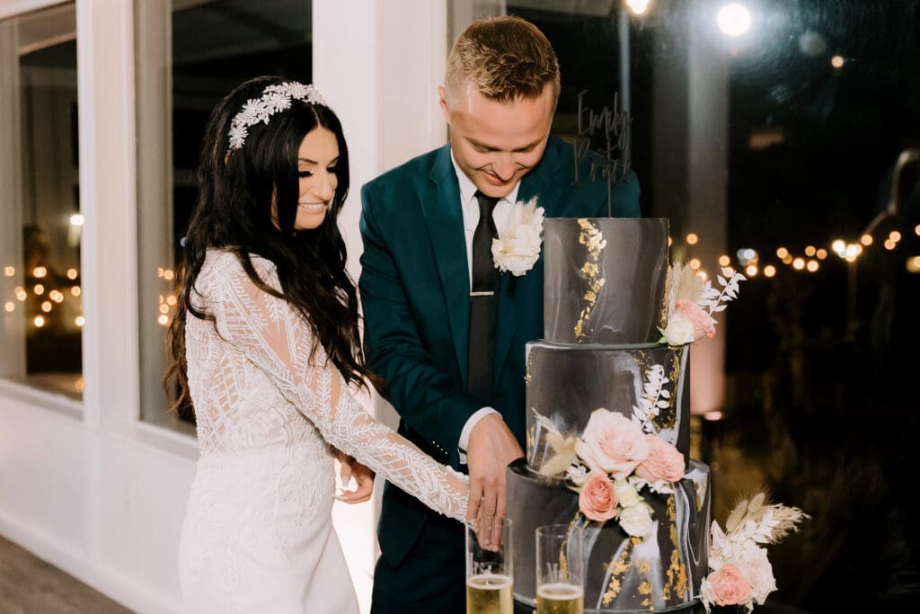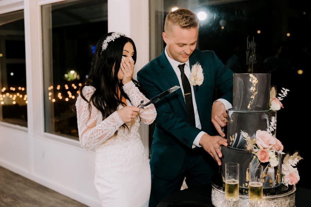 The design for this day was nothing short of picturesque. Specifically, the deep blue tones of the venue walls and the crashing Pacific waves provided a stunning natural canvas. To create a striking contrast, Bruce and Emily chose to incorporate bold yet graceful black accents. Consequently, the dark tones “popped” against the coastal scenery, proving that black is a sophisticated choice for a beach-side celebration.