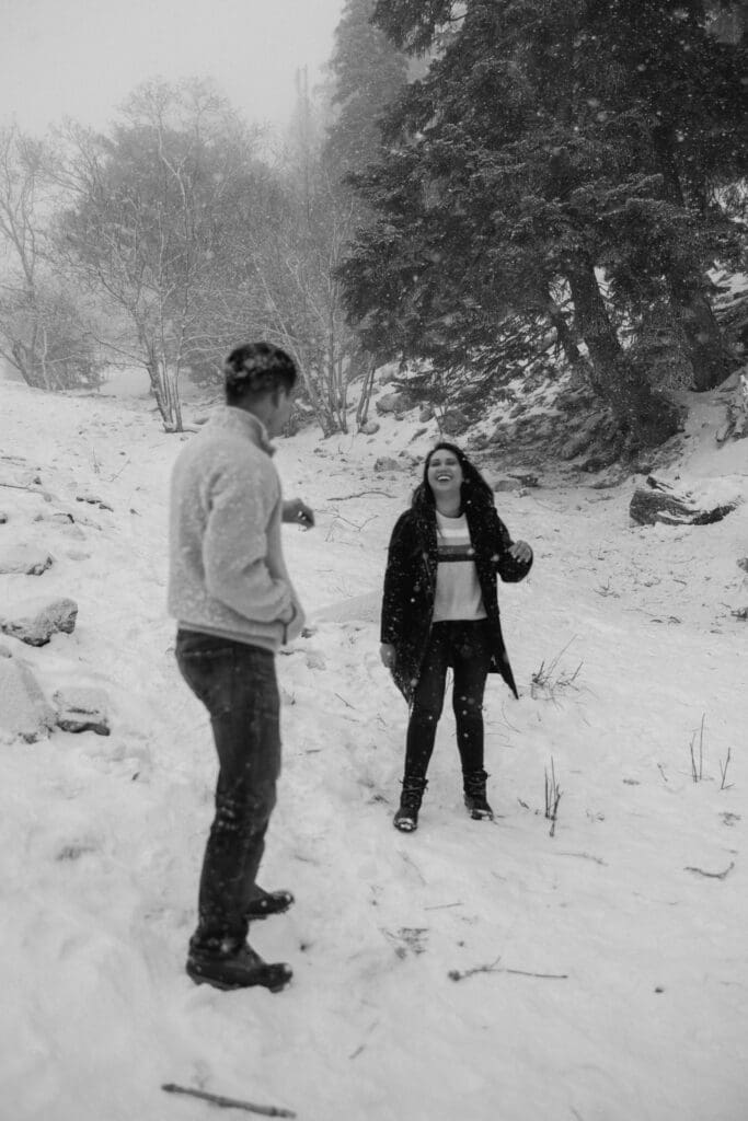 Inspired by the recent winter storms, the couple chose a snow-filled theme to reflect their adventurous spirit. The snowy woodland setting provided the perfect backdrop for their joy and excitement. As they explored the crisp, white landscape, the peacefulness of the woods brought them closer together. This session served as a beautiful reminder that the simplest experiences—like a walk in the woods—are often the most meaningful.
