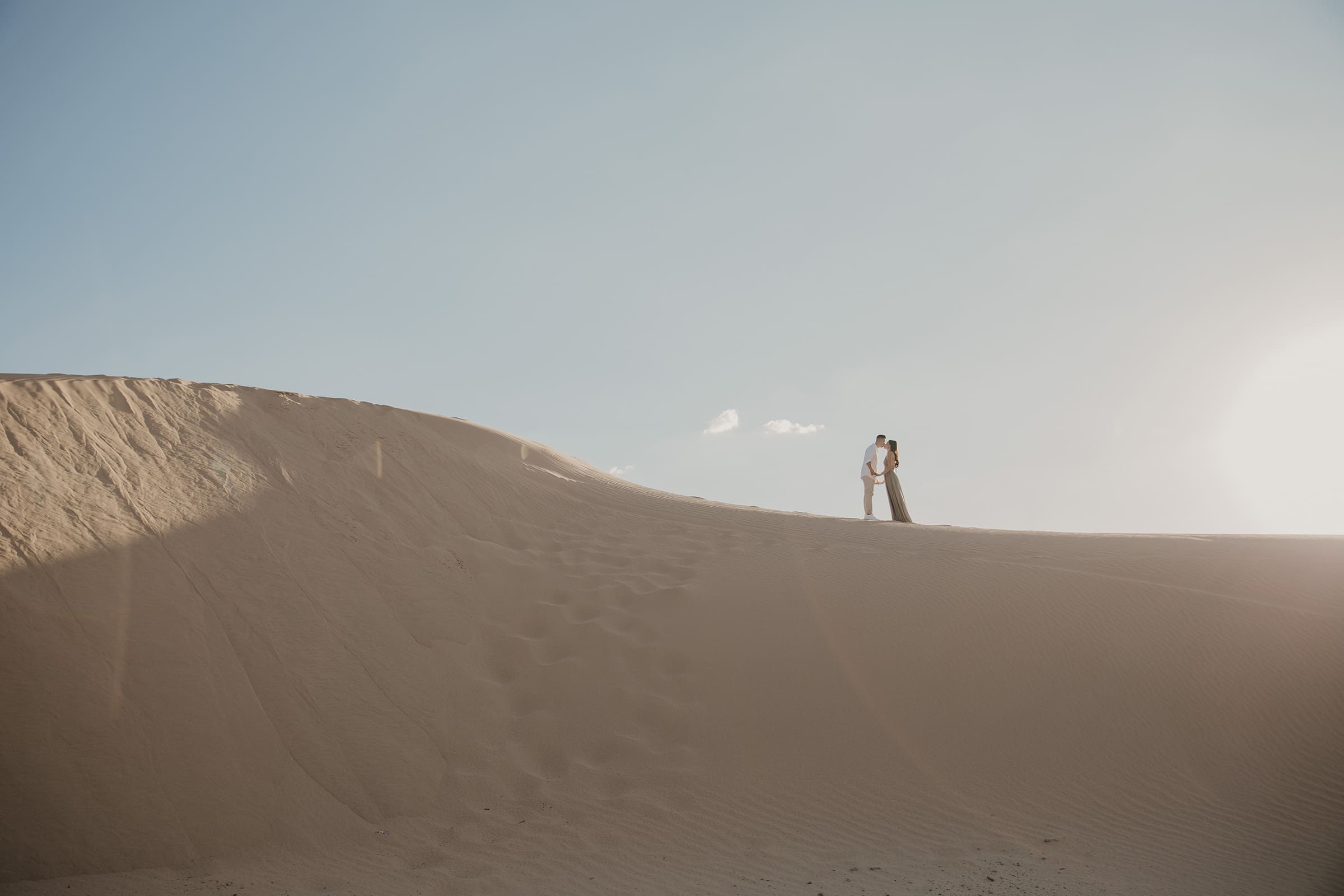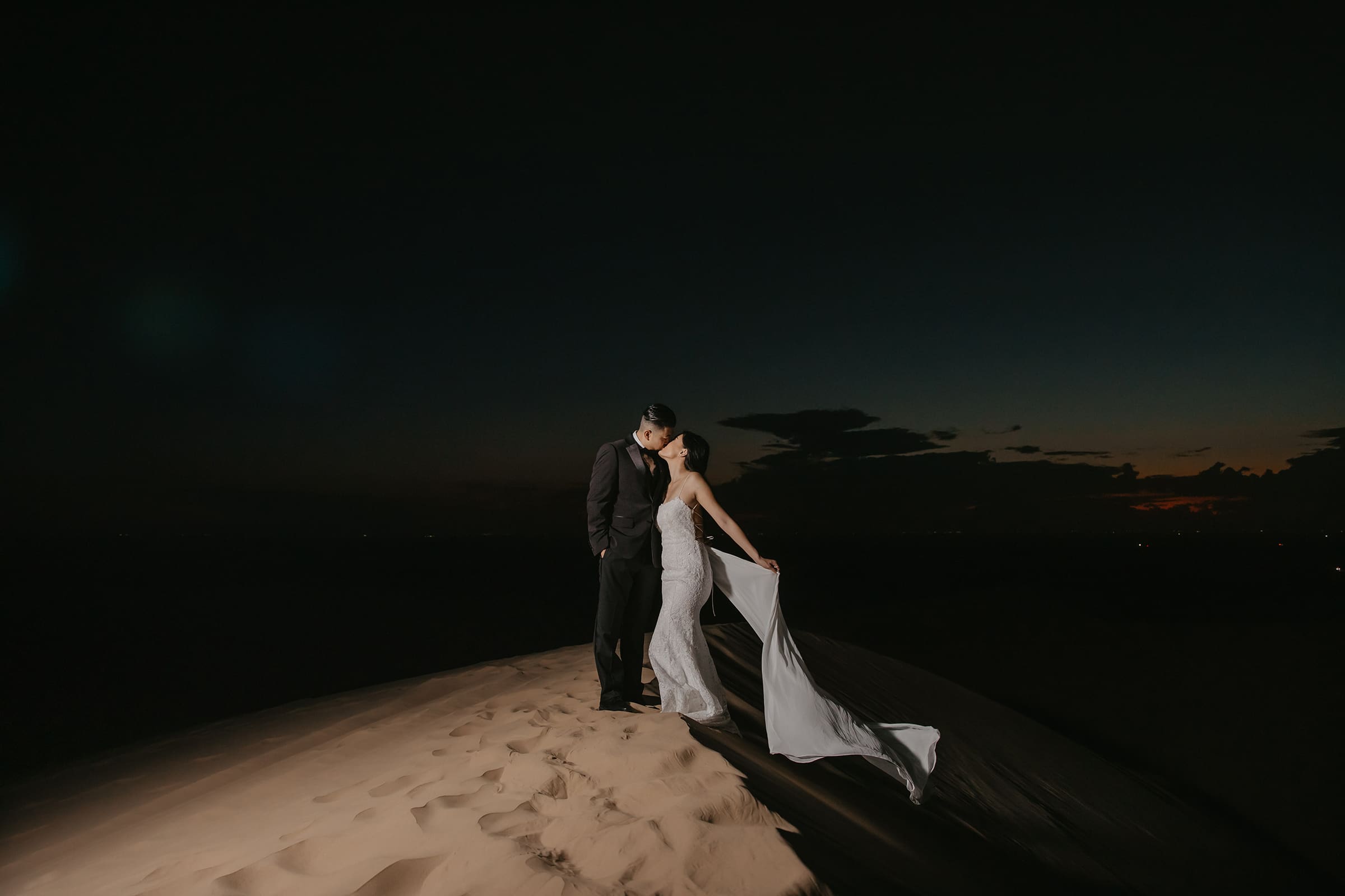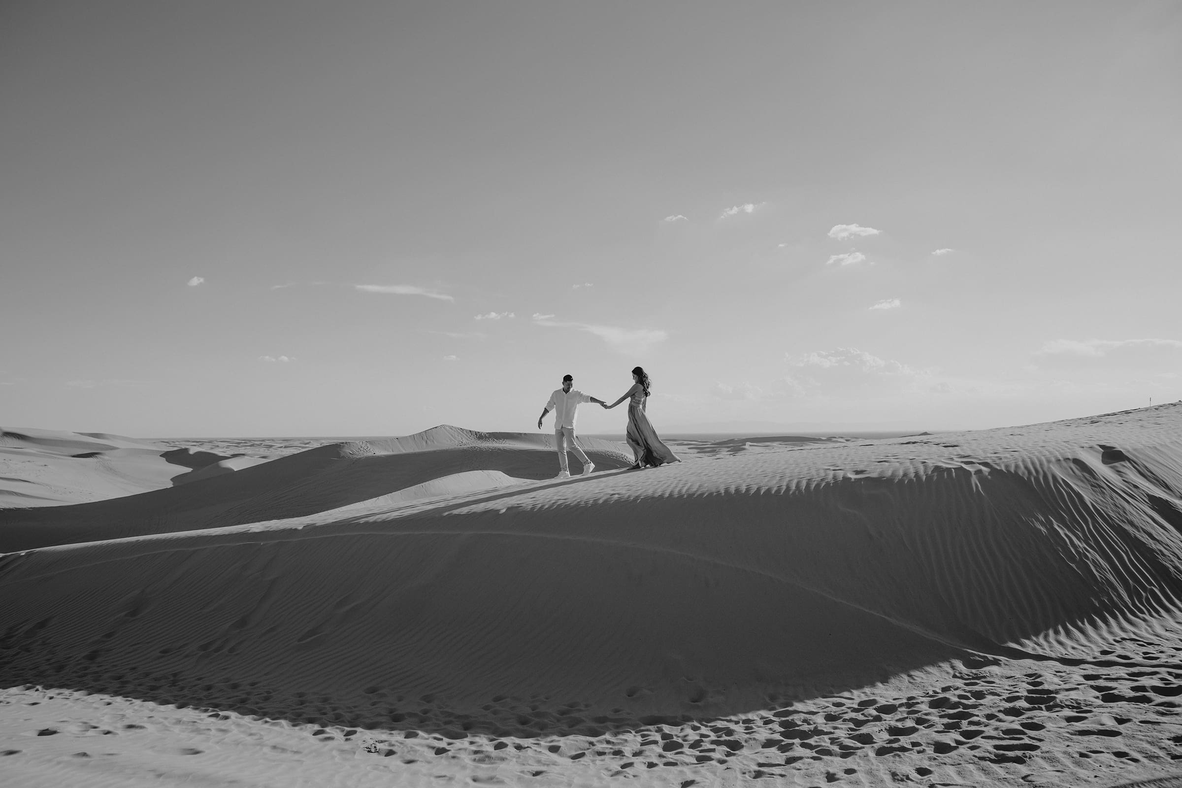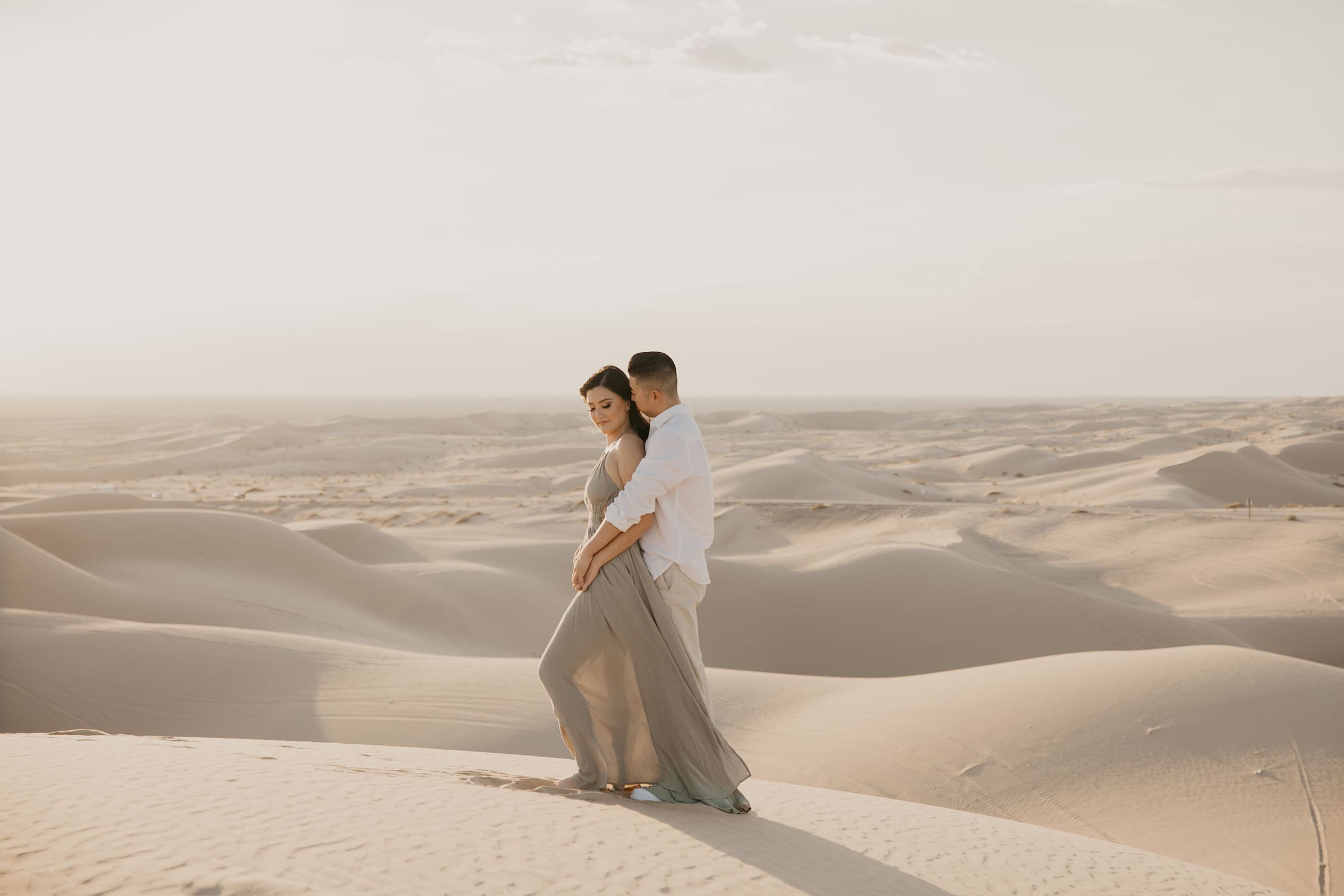 We chased the light as it softened into twilight, capturing intimate moments amid the vast desert landscape—hands intertwined, playful glances, and quiet embraces that spoke volumes. The session extended into the evening, embracing the magic of low light and long shadows, turning the dunes into a private stage for their love story.