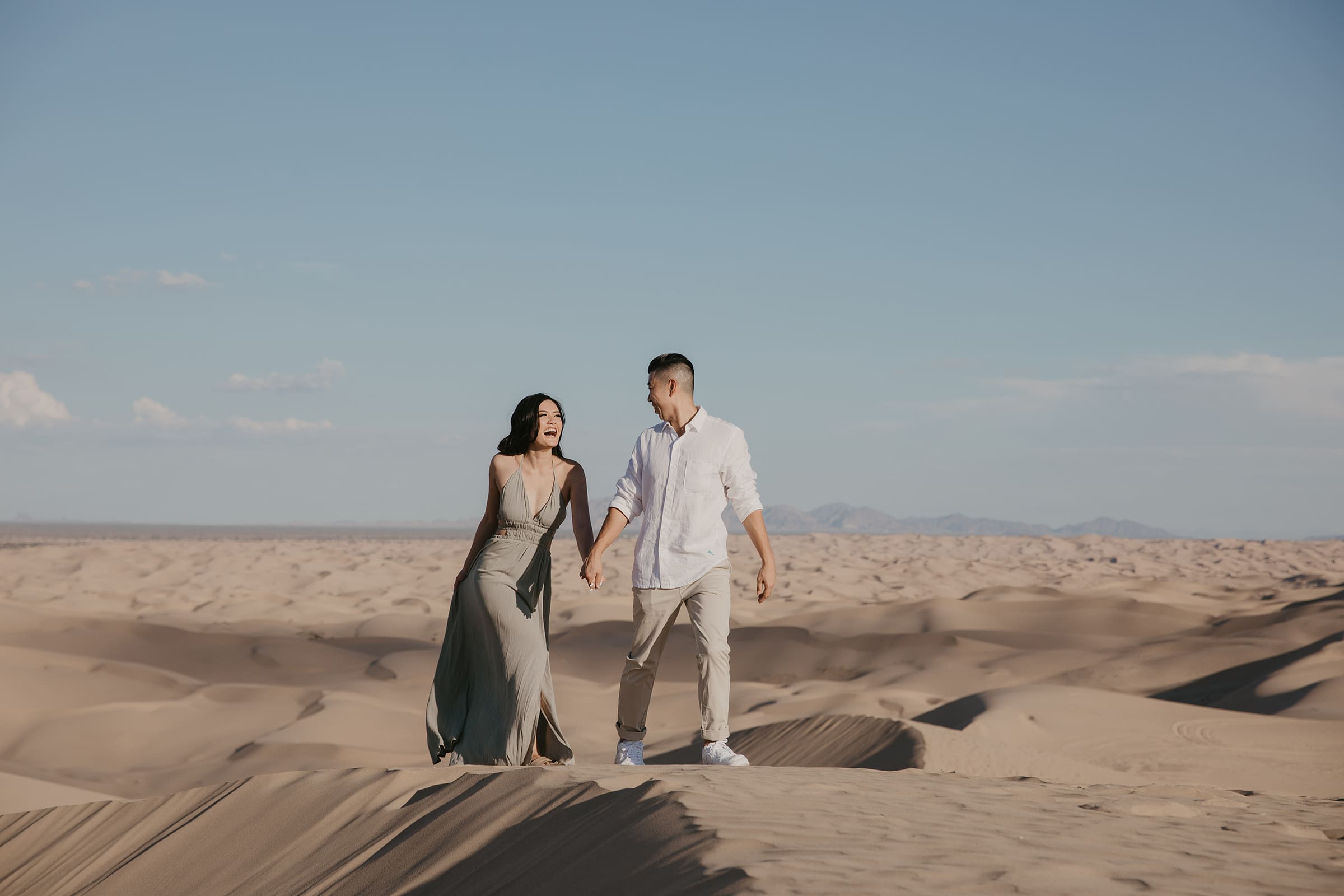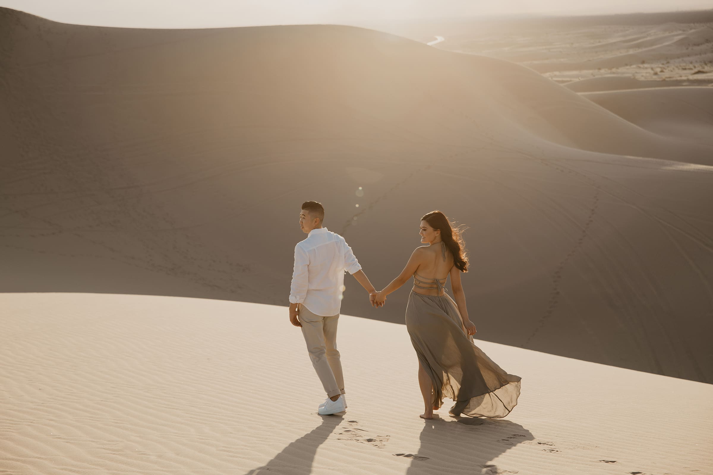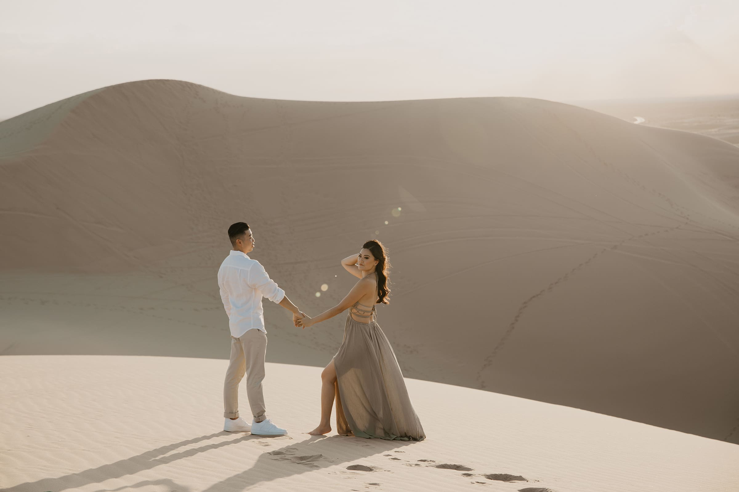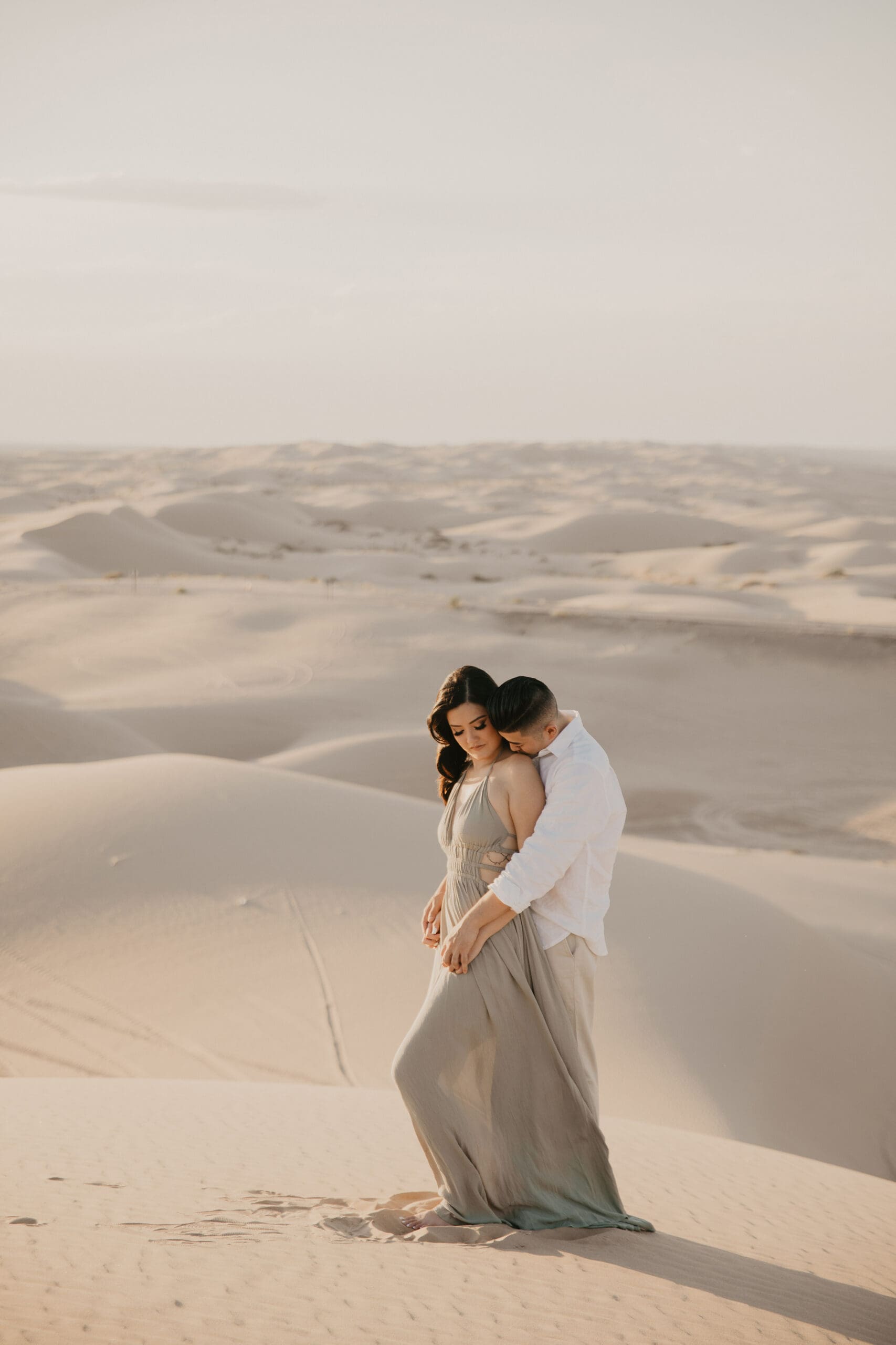 We chased the light as it softened into twilight, capturing intimate moments amid the vast desert landscape—hands intertwined, playful glances, and quiet embraces that spoke volumes. The session extended into the evening, embracing the magic of low light and long shadows, turning the dunes into a private stage for their love story.