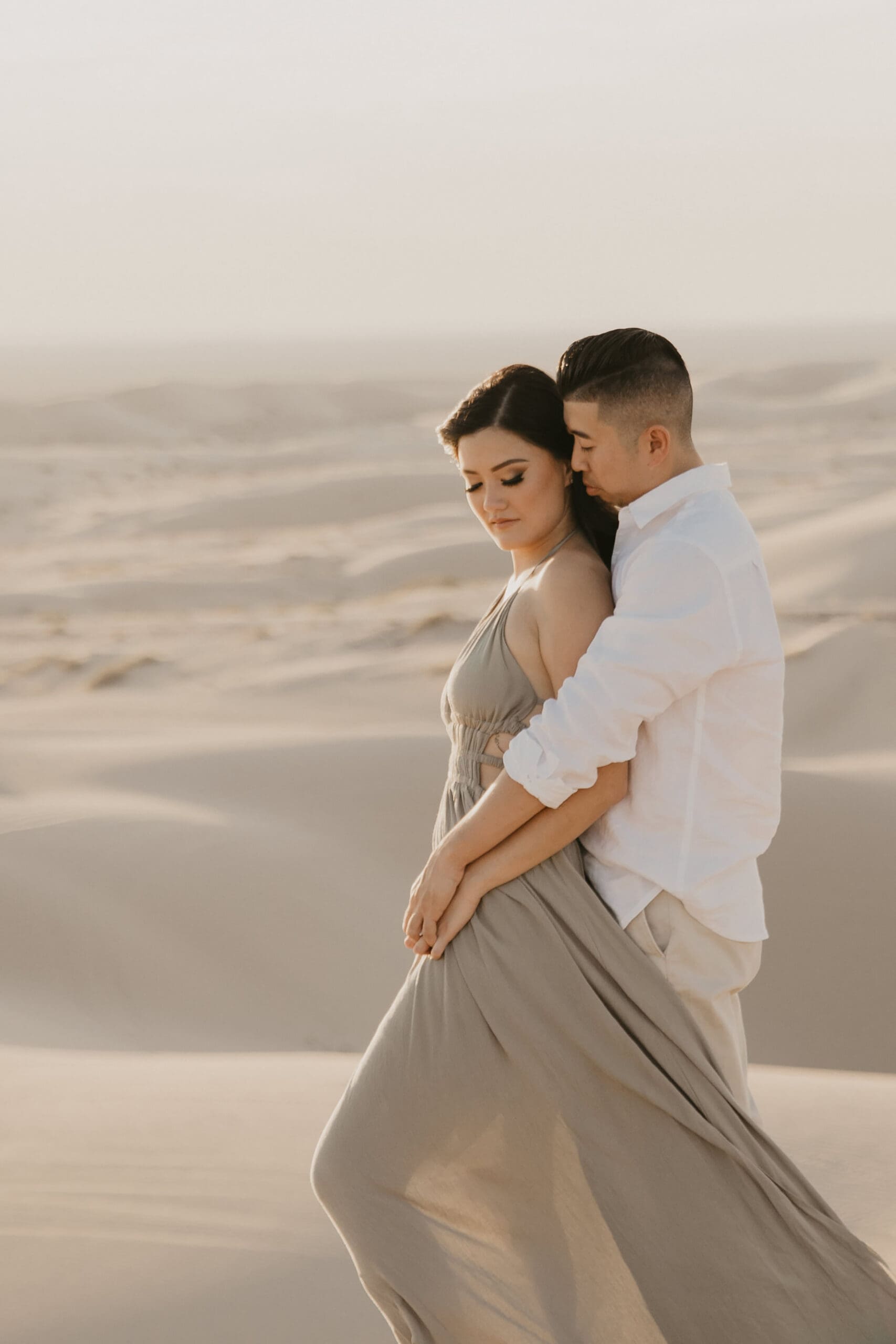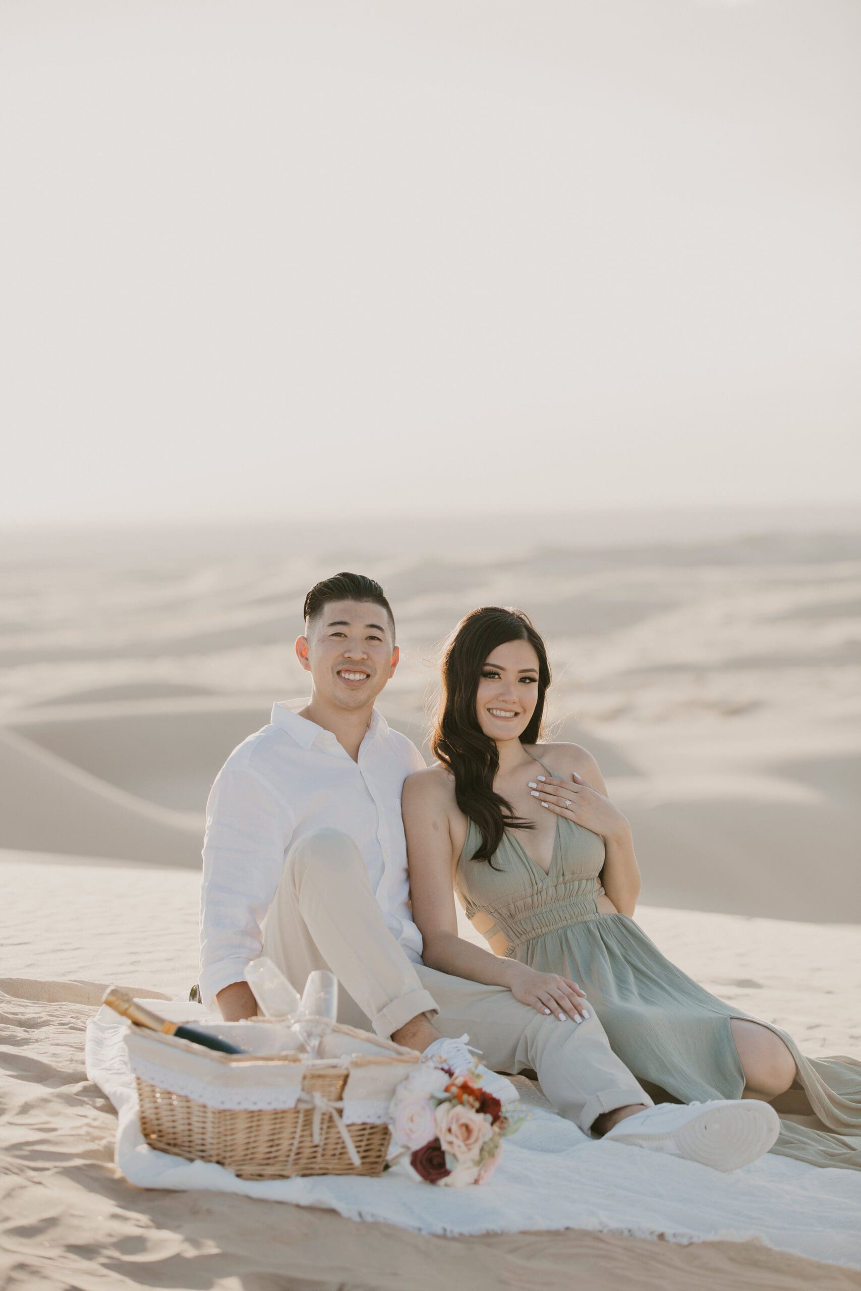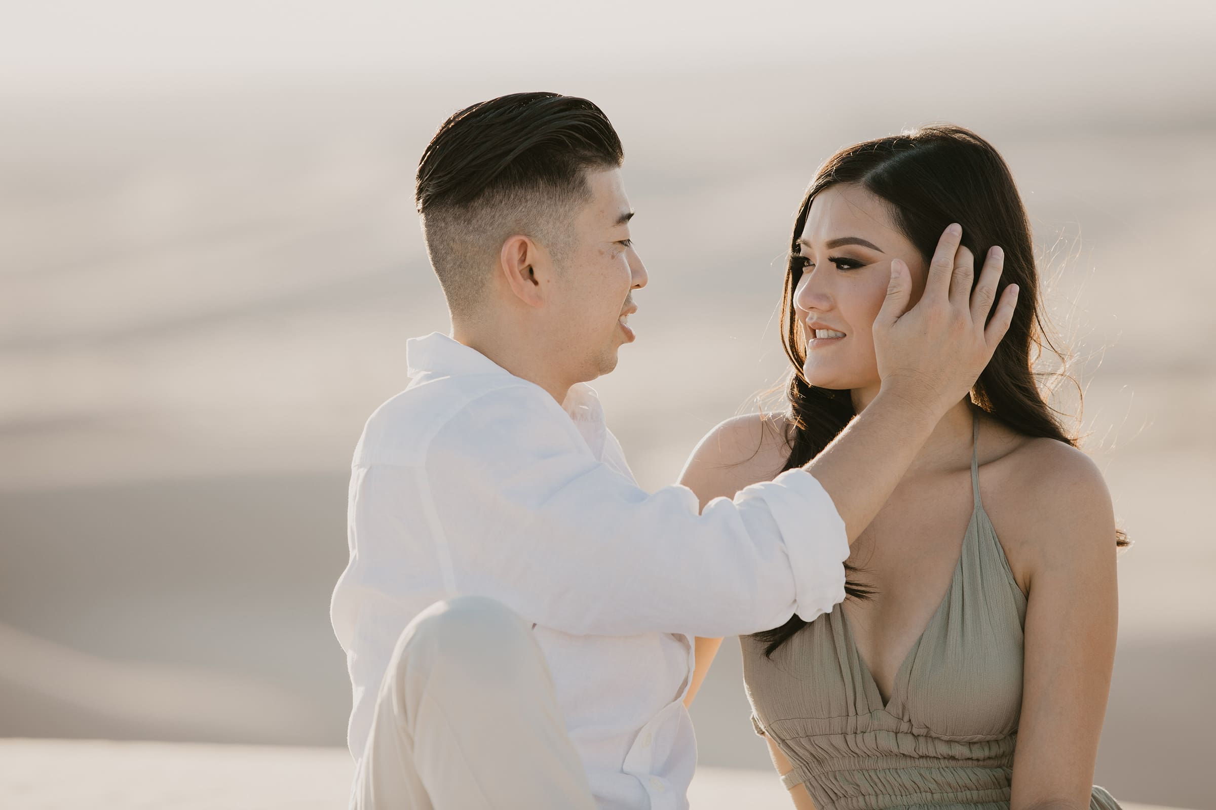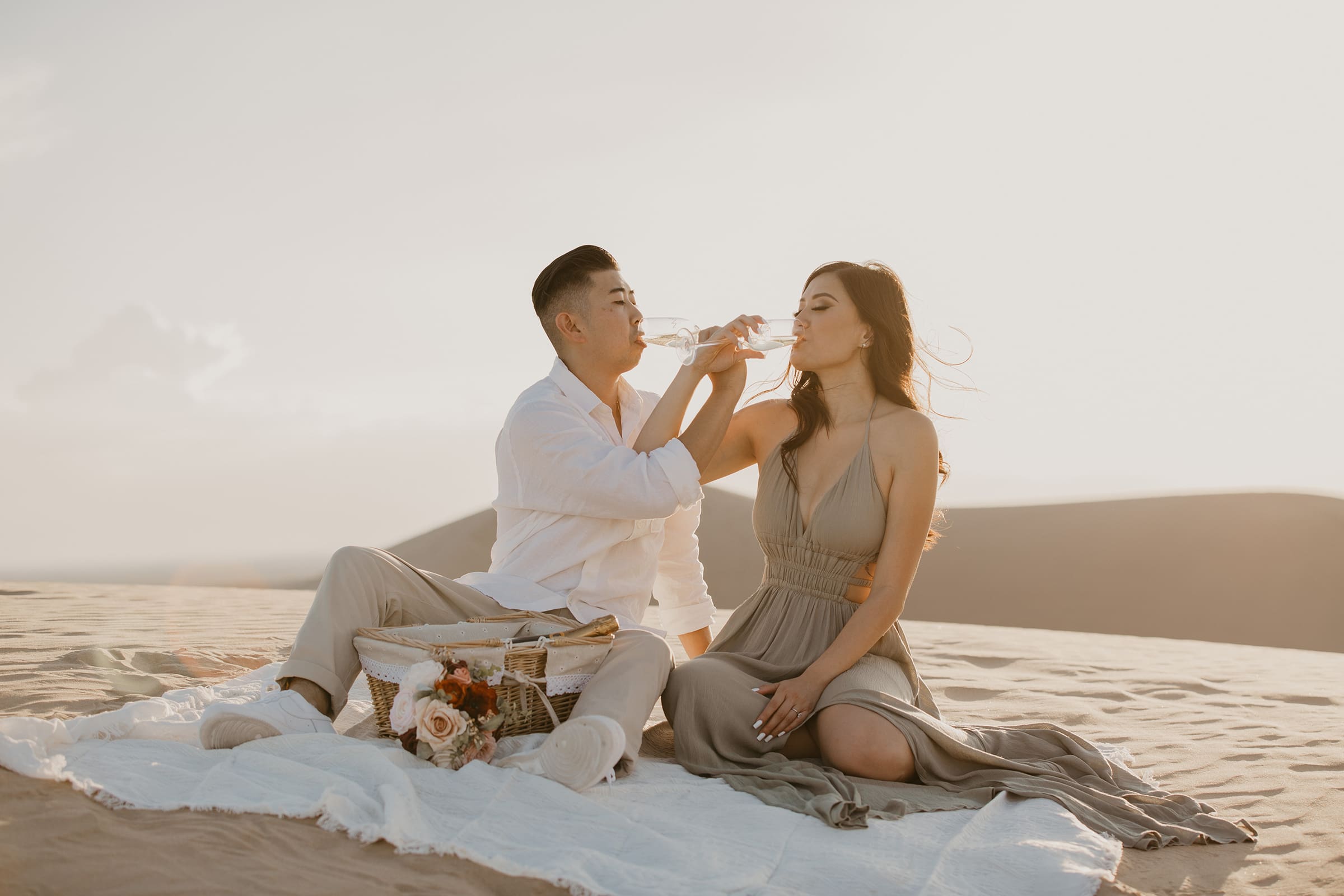 For their engagement session, choosing the California sand dunes was a natural fit for this couple who thrive on adventure. The endless golden hills, shifting sands, and dramatic sunset hues created a cinematic setting that echoed their journey from that first blind date to this milestone moment. Vicky’s white dress billowed in the breeze, contrasting beautifully against the warm tones of the dunes, while Jon stood by her side, their laughter and connection shining through every frame.