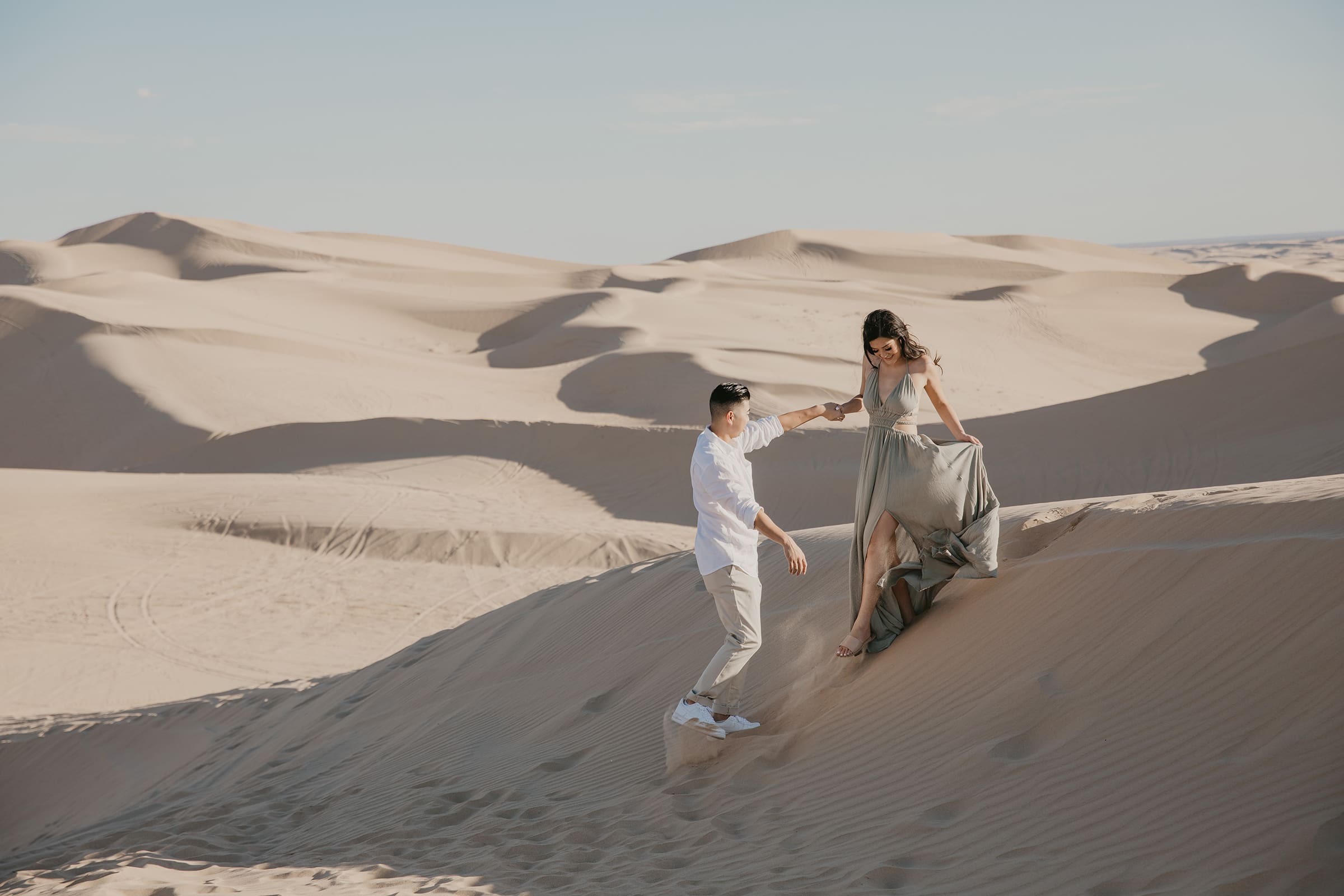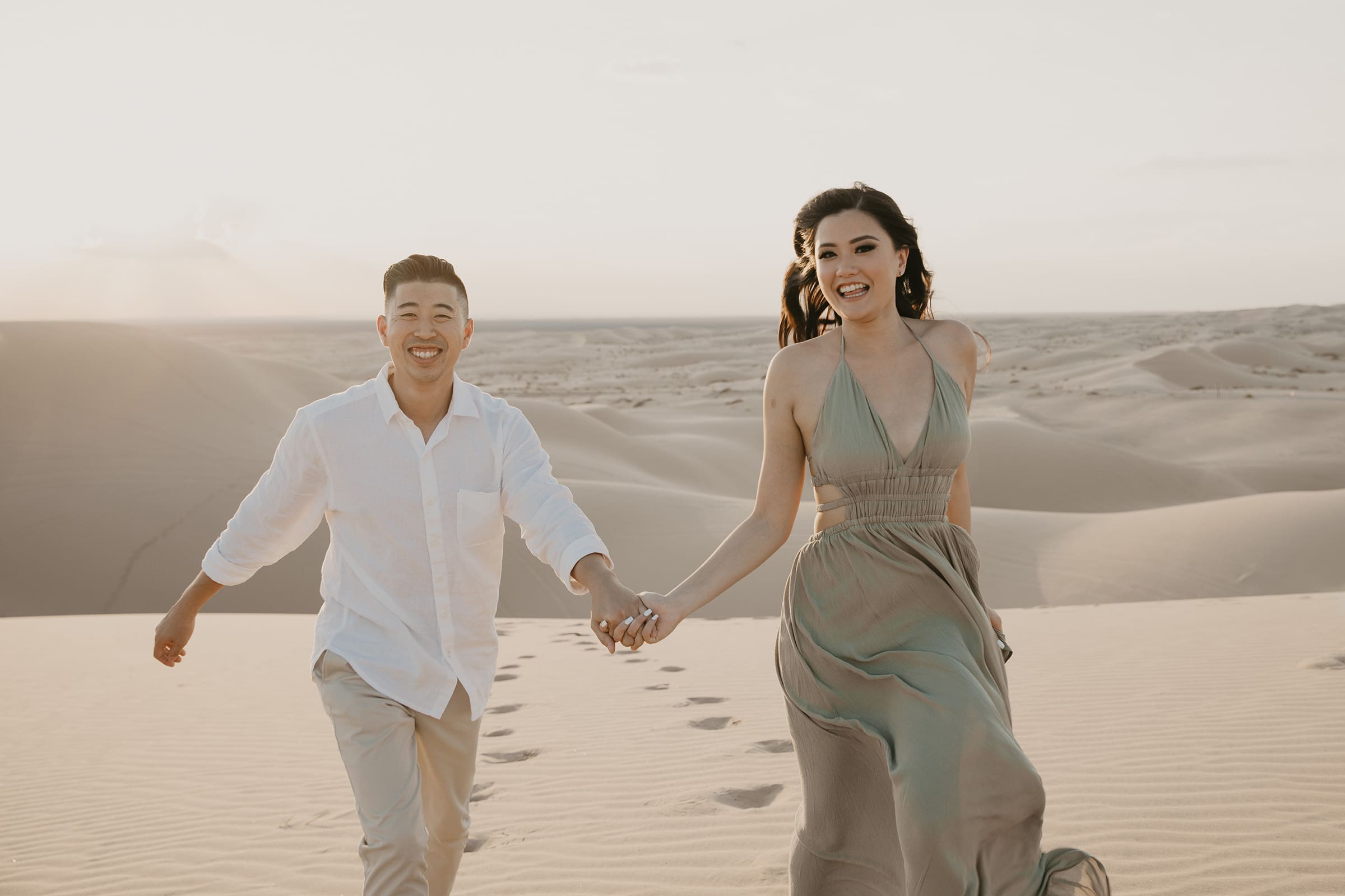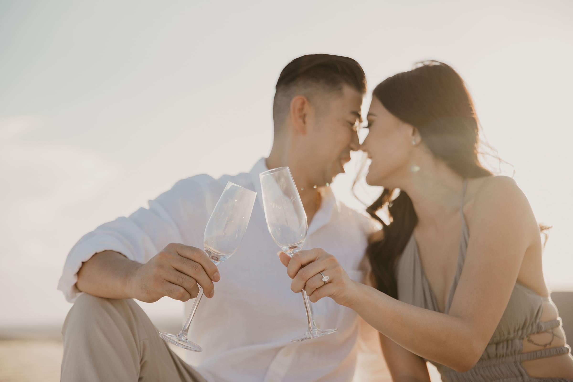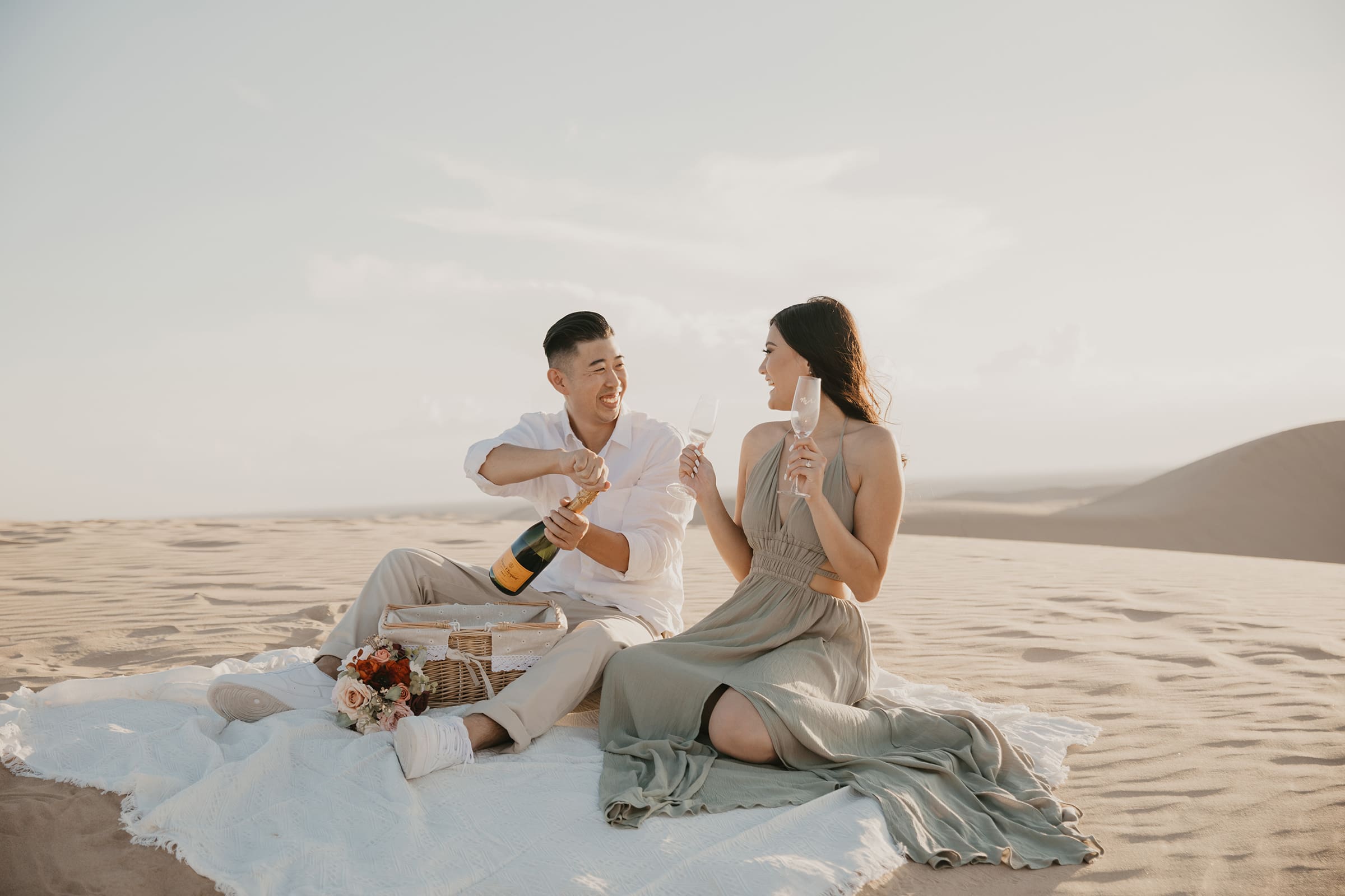 For their engagement session, choosing the California sand dunes was a natural fit for this couple who thrive on adventure. The endless golden hills, shifting sands, and dramatic sunset hues created a cinematic setting that echoed their journey from that first blind date to this milestone moment. Vicky’s white dress billowed in the breeze, contrasting beautifully against the warm tones of the dunes, while Jon stood by her side, their laughter and connection shining through every frame.