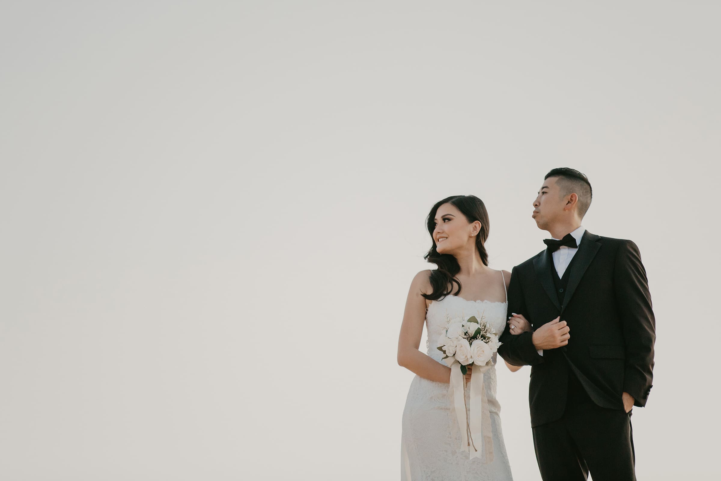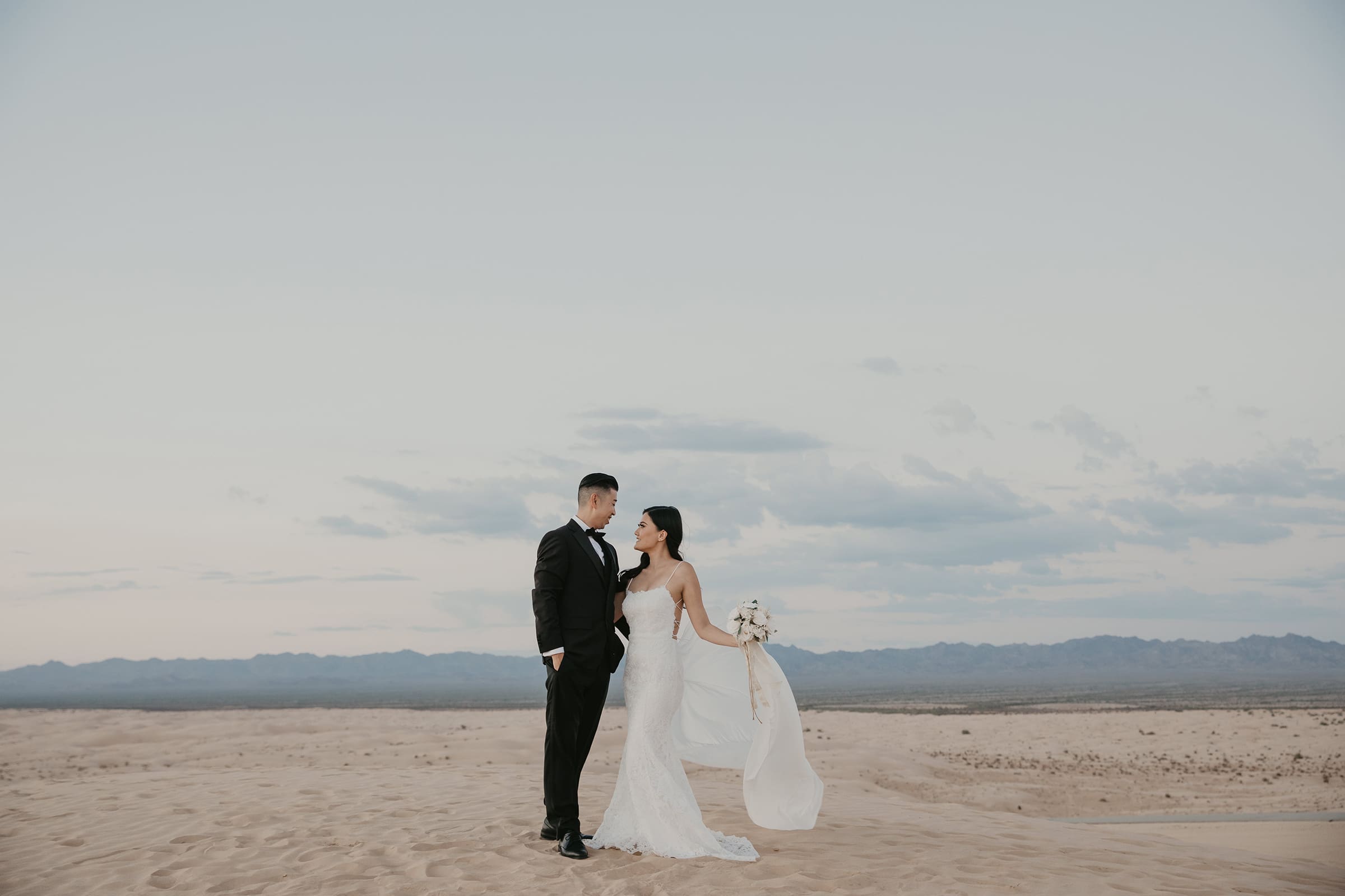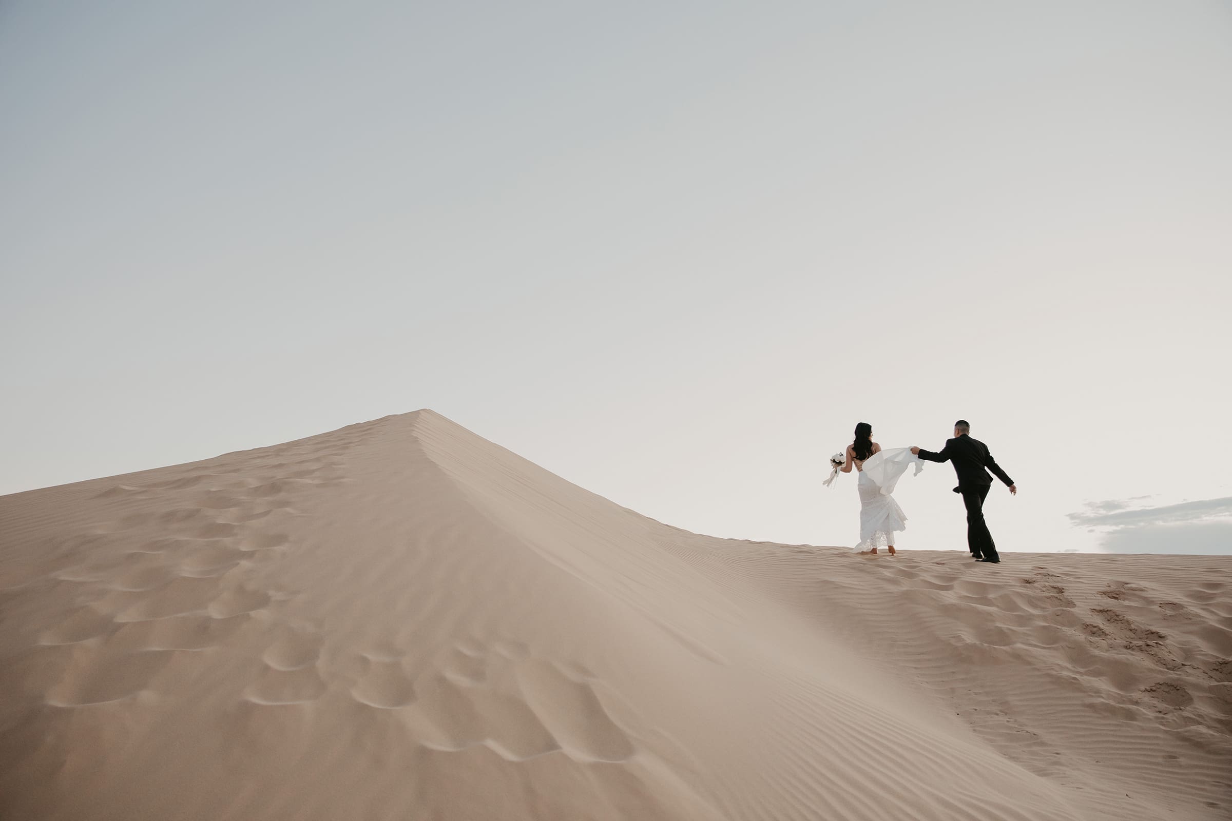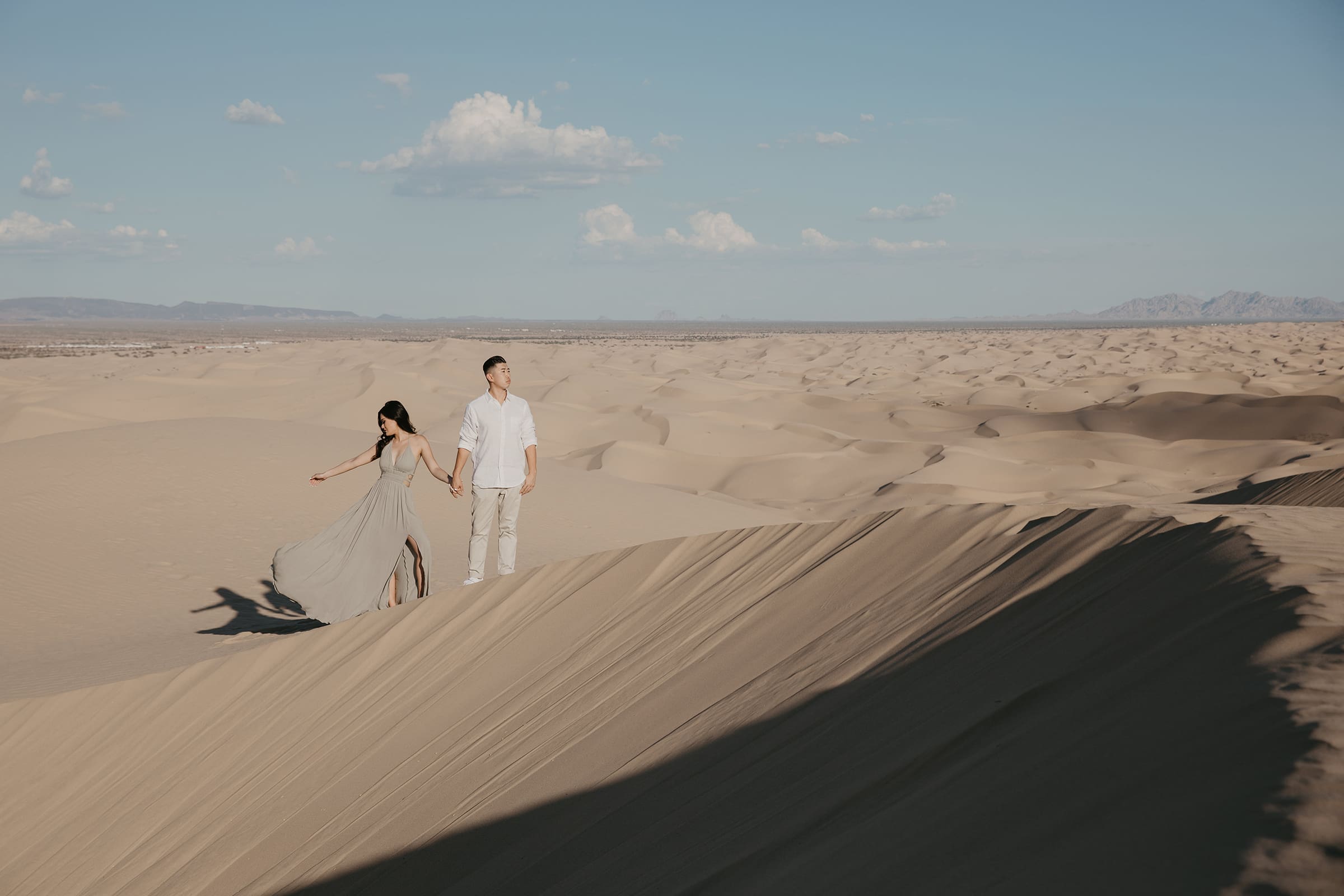 The sand sank beneath their feet with each step, creating their own footprints where many have traversed before. It was something new, something exciting, and definitely memorable. As the day faded, the clouds sunk lower in the sky, blockading the sun as it sank to its lowest depth. With the last lingering light, we molded epic shadows and highlighted the tail of her flowing white dress as the sky’s shadows deepened, hinting at stormy days ahead yet filled with promise.