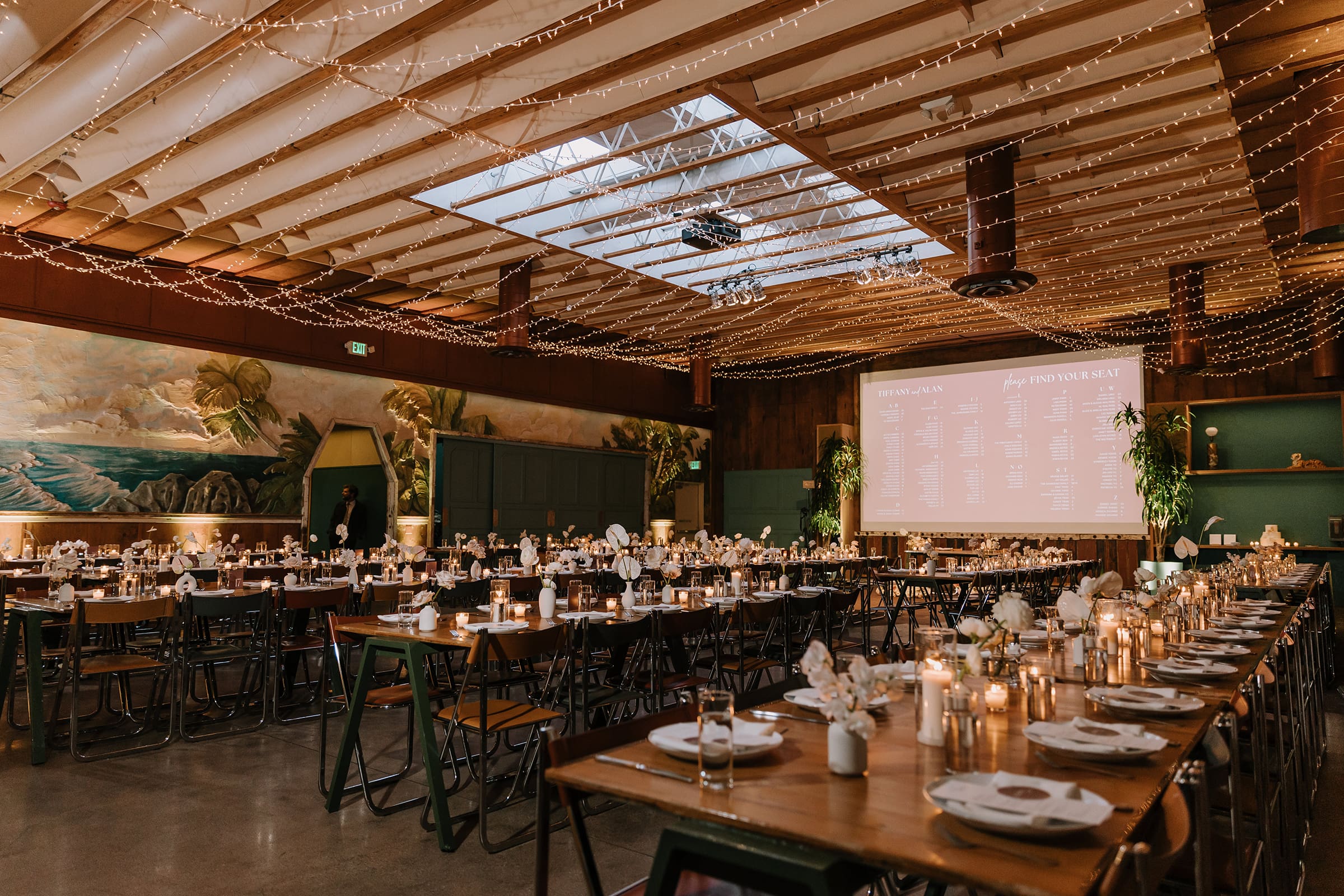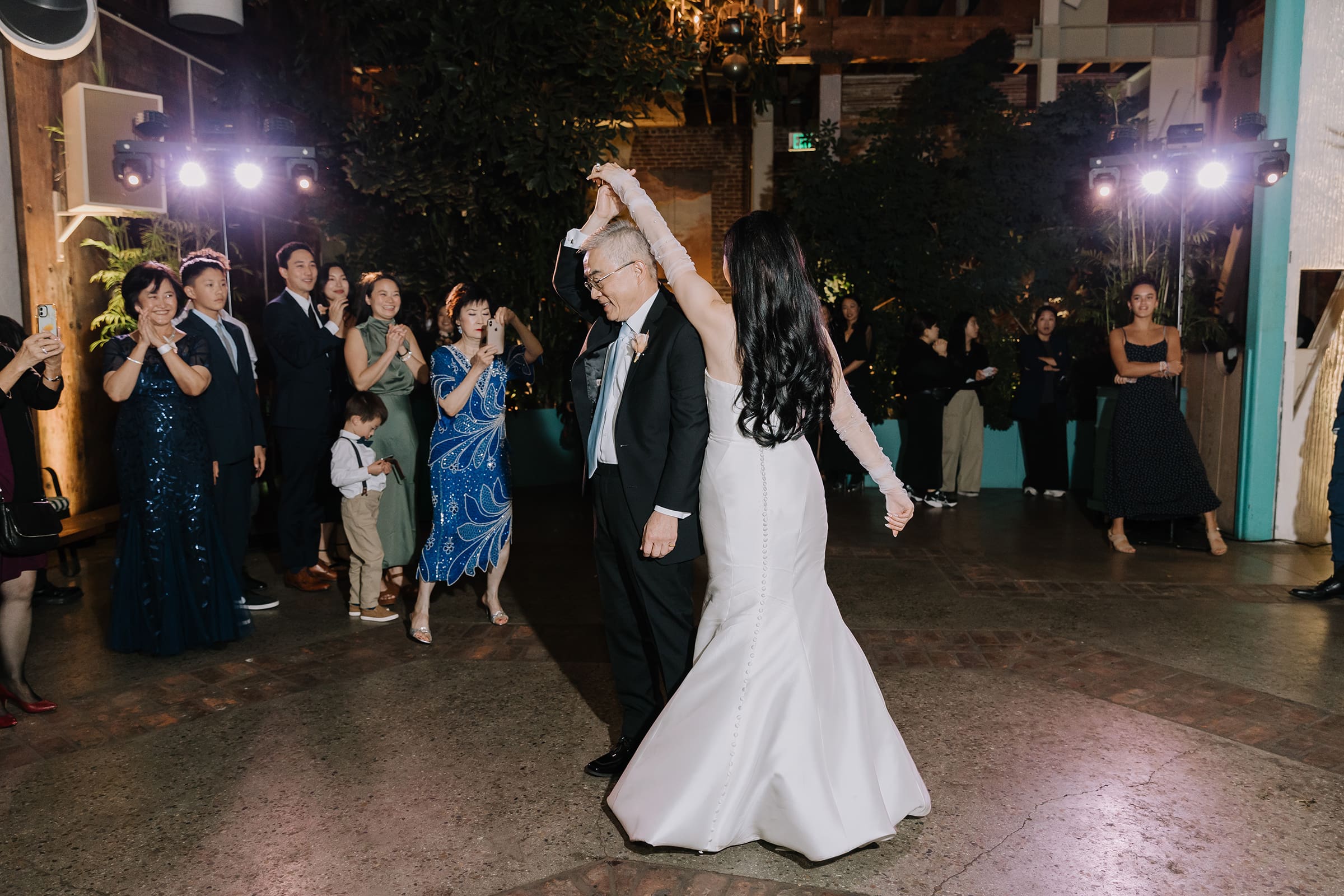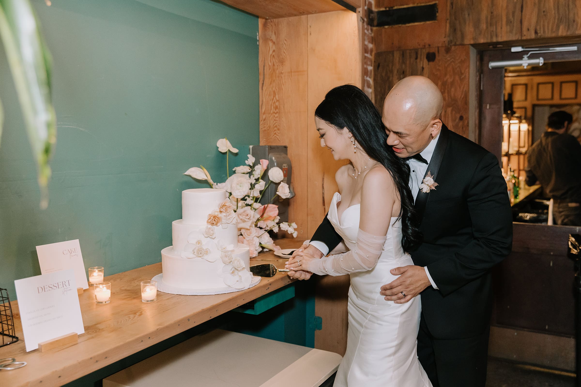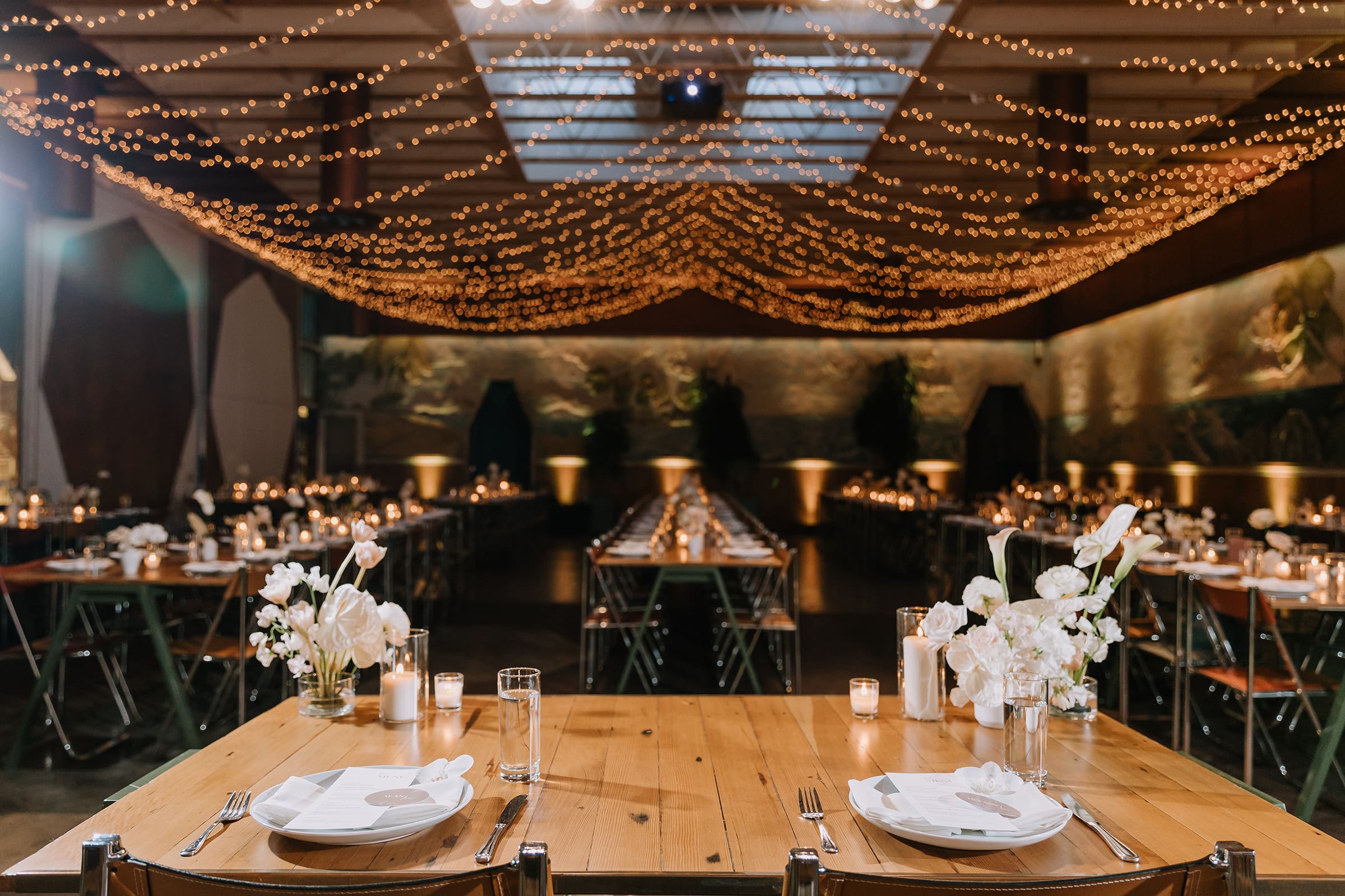 As the sun dipped below the skylights, casting a warm glow over the courtyard, Tiffany and Alan’s love story entered a new chapter. The twinkly lights in the reception area mimicked a starry night sky, creating an intimate and romantic ambiance. The laughter of friends and family, the clinking of glasses, and the soft whispers of love filled the air, making it a night to remember.