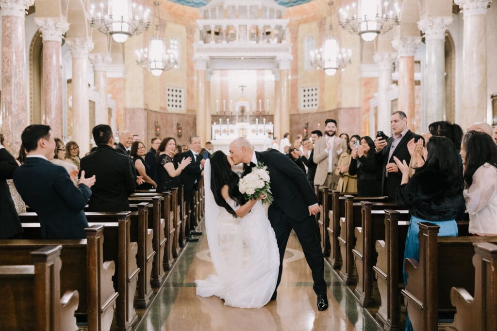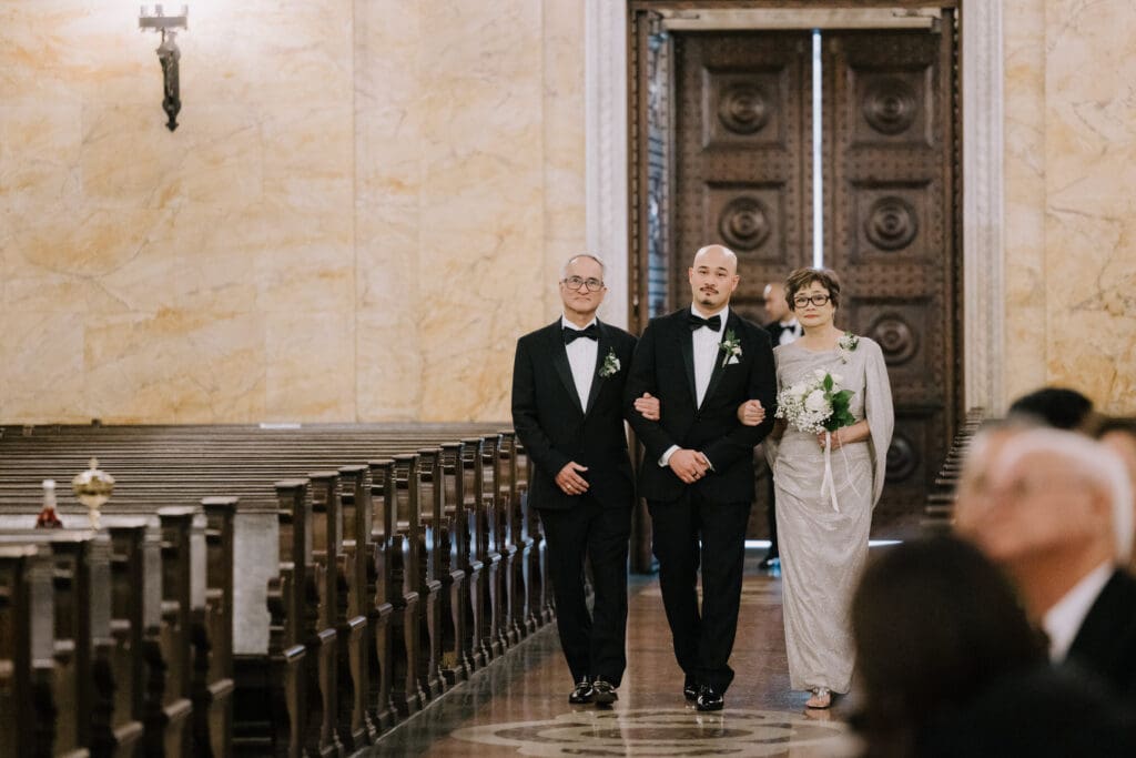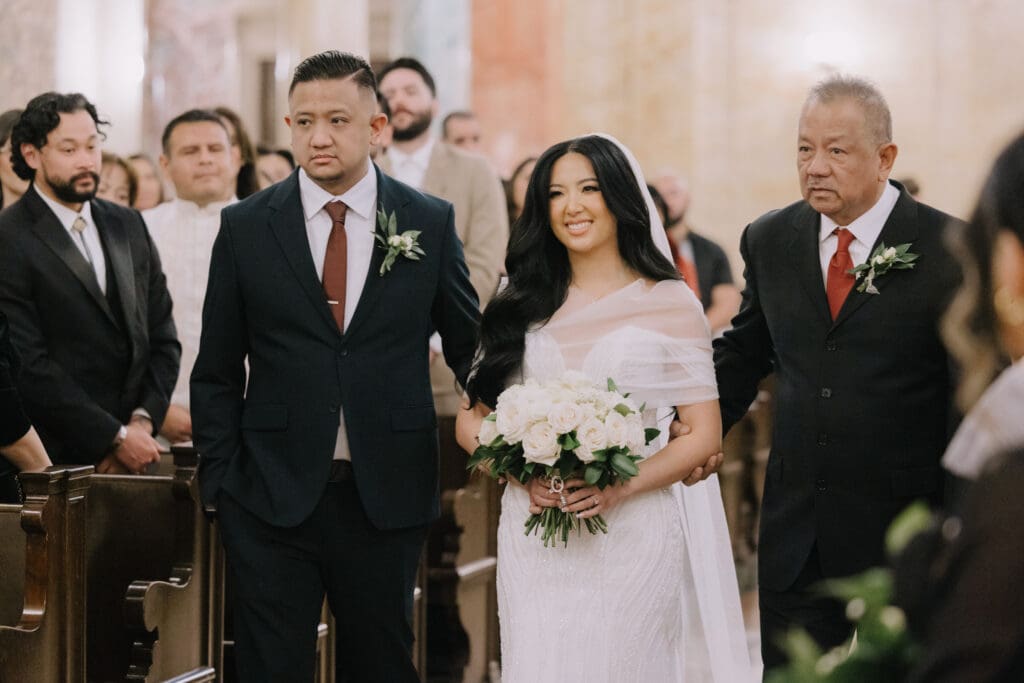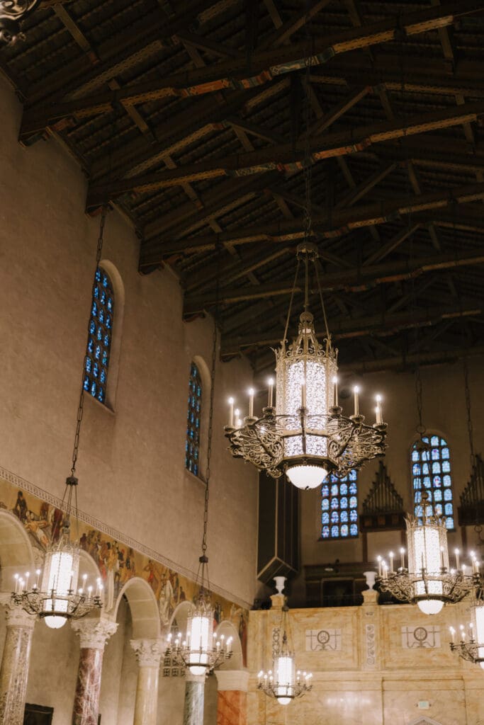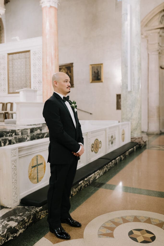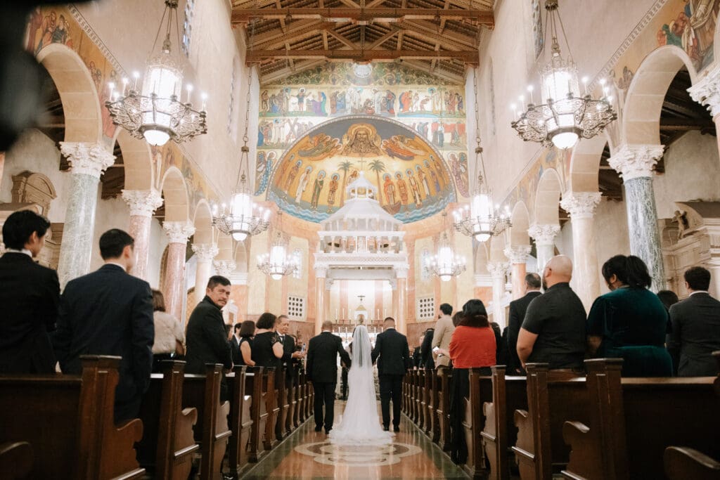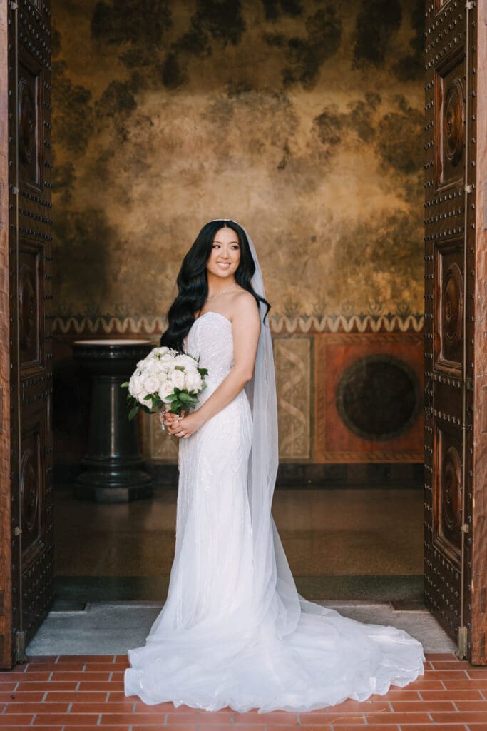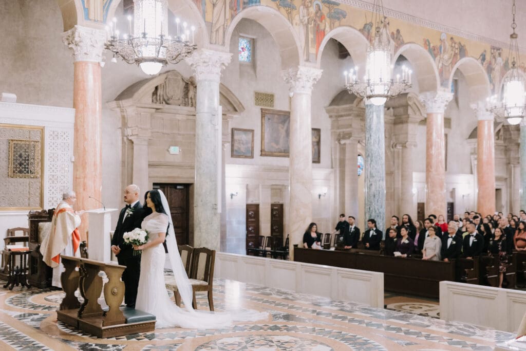 First, the couple chose to exchange vows at St. Andrew’s Catholic Church. This location is famous for its Romanesque architecture. It features a soaring bell tower and beautiful murals. Therefore, it provided an “old world” feeling for their ceremony. Because the church is so historic, it added an immediate sense of timelessness to their wedding gallery.