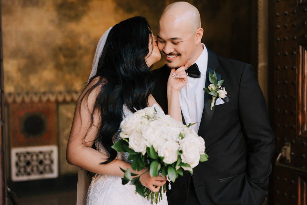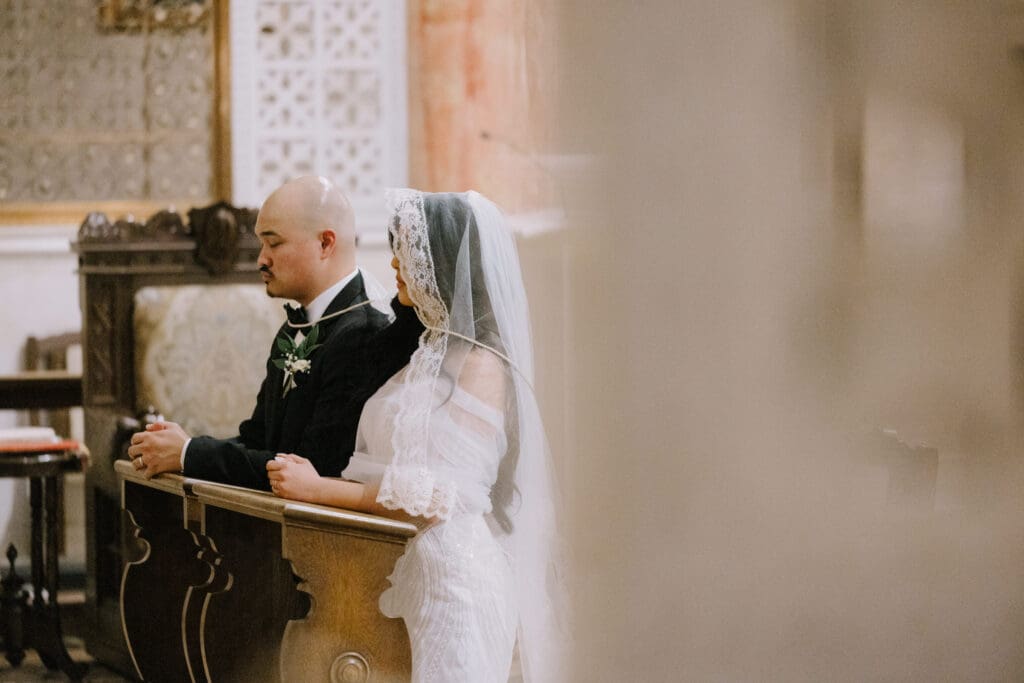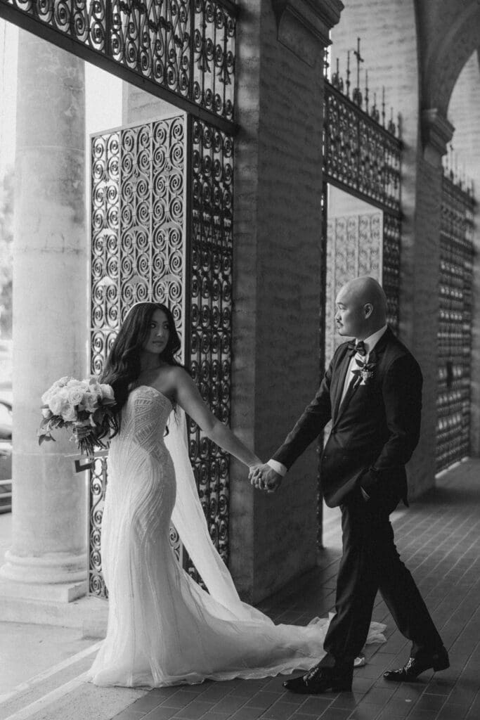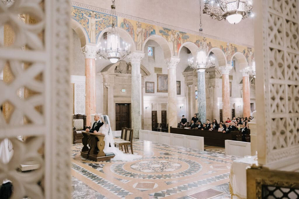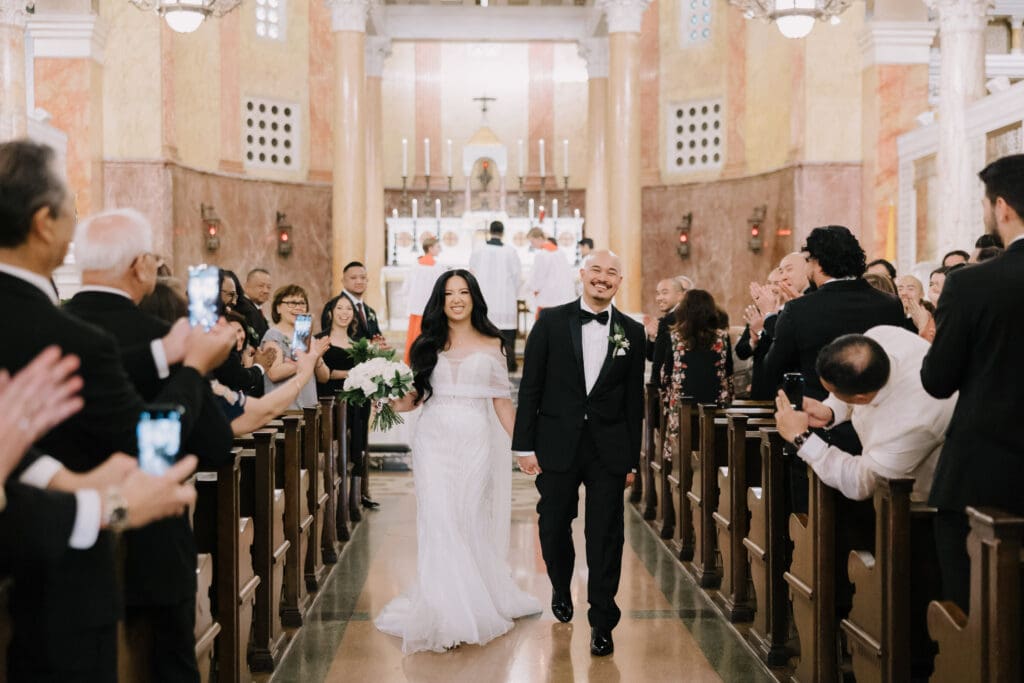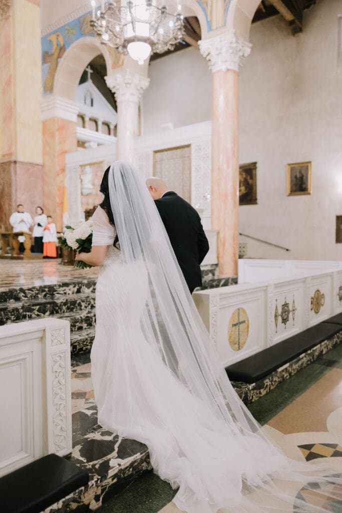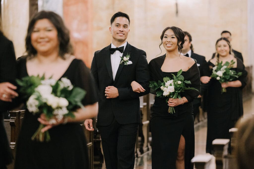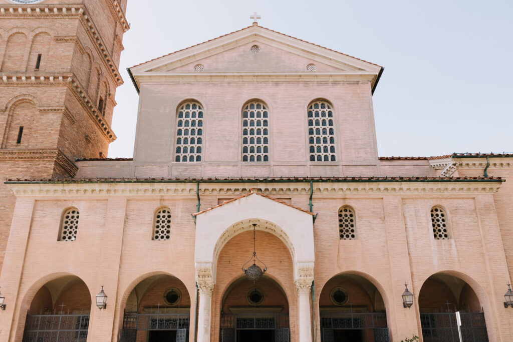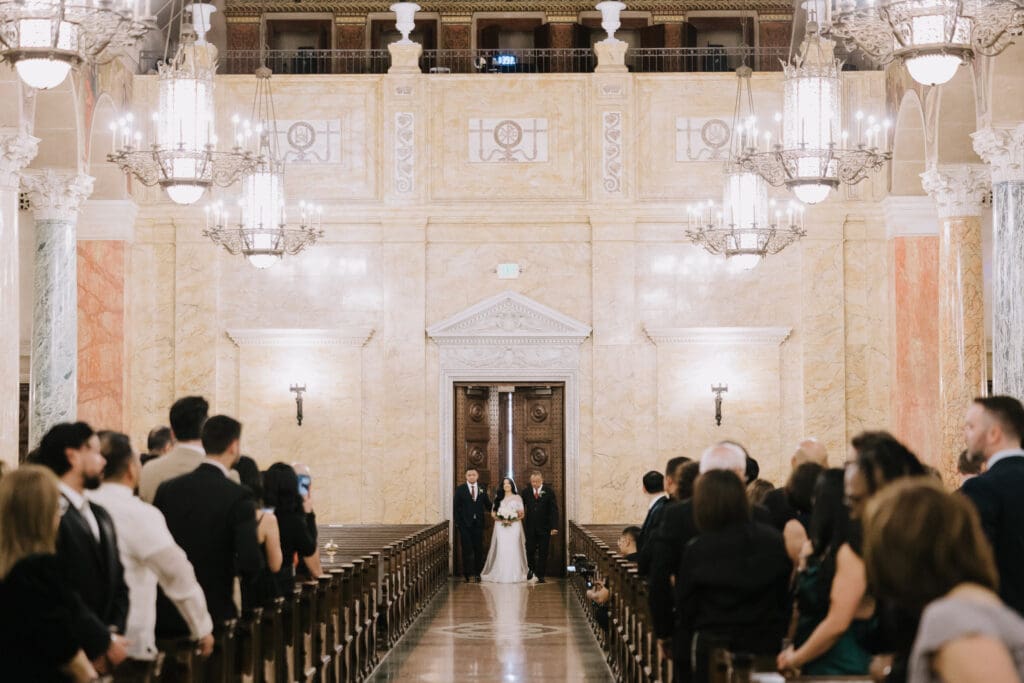 First, the couple chose to exchange vows at St. Andrew’s Catholic Church. This location is famous for its Romanesque architecture. It features a soaring bell tower and beautiful murals. Therefore, it provided an “old world” feeling for their ceremony. Because the church is so historic, it added an immediate sense of timelessness to their wedding gallery.